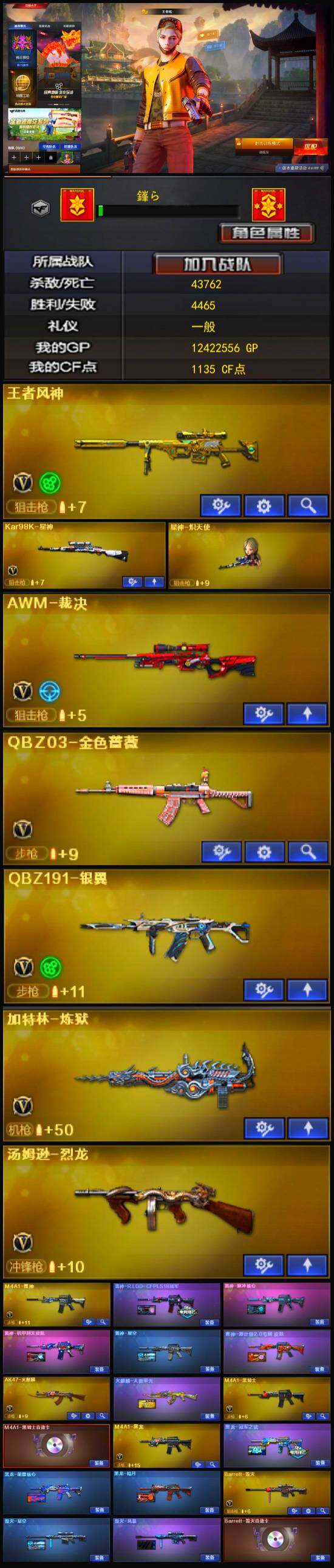【热门武器】:王者森决,QBZ03-金色蔷薇,Kar98K-星神,牛牛-AK47,M4A1-黑骑士,汤姆逊-烈龙,加特林-炼狱,沙鹰-修罗*3