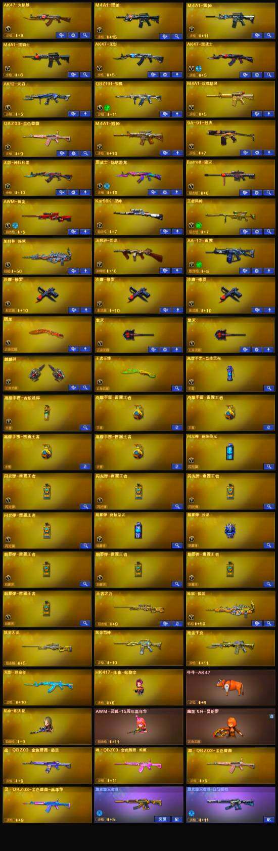 【英雄级武器】:高爆手雷-竞技荣光,烟雾弹-竞技荣光,闪光弹-竞技荣光,QBZ03-金色蔷薇,无影-神兵利器,M4A1-雷神,M4A1-黑龙,M4A1-玫瑰精灵,M4A1-黑骑士,加特林-炼狱,汤姆逊-烈龙,AK47-无影,AK47-火麒麟,AK47-黑武士,AK12-天启,Barrett-毁灭,AWM-裁决,AA-12-雷霆,Kar98K-星神,M4A1-猎神,黑武士-锦绣游龙,沙鹰-修罗*3,麒麟刺,擎天*2,屠龙