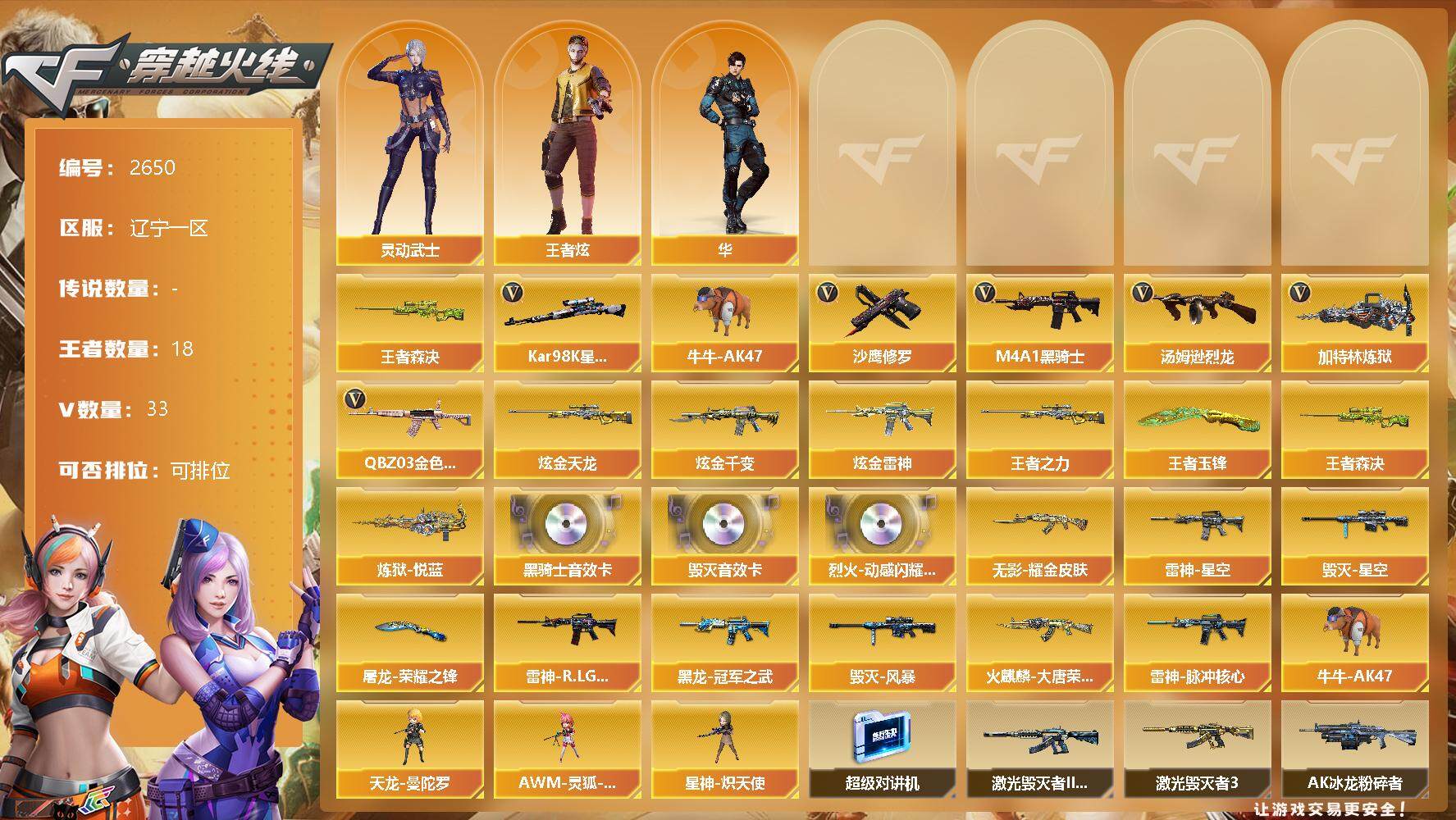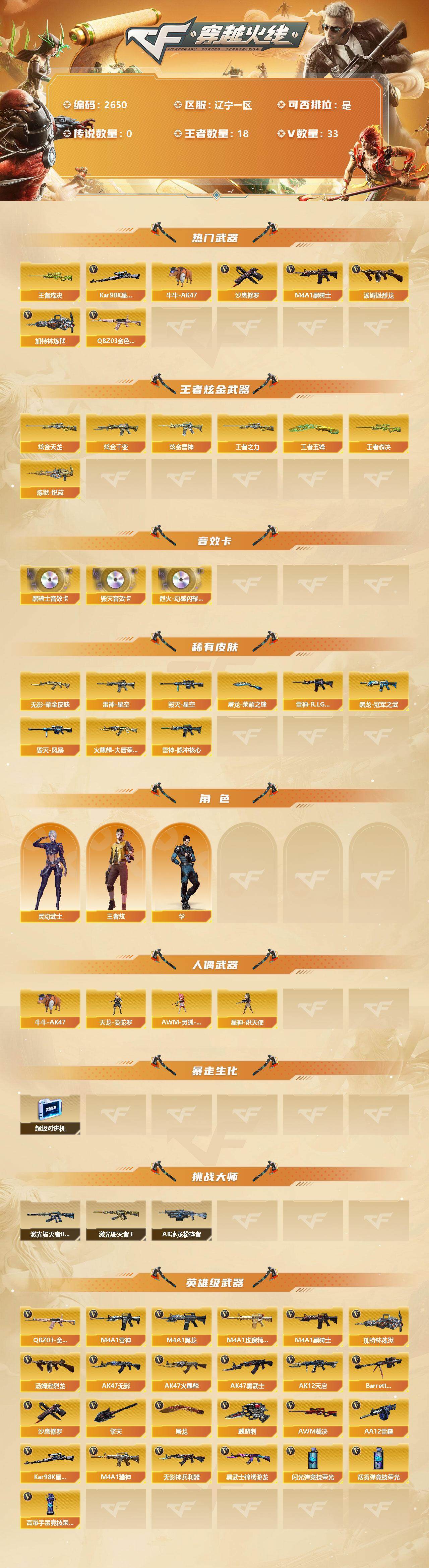 [12449982]【商品标题】:辽宁一区-33V-18王者-3炫金 【热门武器】:王者森决,QBZ03-金色蔷薇,Kar98K-星神,牛牛-AK47,M4A1-黑骑士,汤姆逊-烈龙,加特林-炼狱,沙鹰-修罗*3 【王者炫金武器】:炫金天龙,炫金千变,炫金雷神,炼狱-悦蓝,王者之力,王者森决,王者玉锋 【音效卡】:烈火-动感闪耀 音效卡,M4A1-黑骑士音效卡,Barrett-毁灭音效卡 【稀有皮肤】:雷神-星空,雷神-R.LGD-CFPLS18冠军,雷神-脉冲核心,火麒麟-大唐荣光,黑龙-冠军之武,毁灭-星空,毁灭-风暴,无影耀金皮肤,屠龙-荣耀之锋 【角色】:王者炫,华,灵动武士 【人偶武器】:星神-炽天使,天龙-曼陀罗,AWM-灵狐-15周年嘉年华,牛牛-AK47 【暴走生化】:超级对讲机 【挑战大师】:激光毁灭者III,激光毁灭者III-白马银枪,AK47-冰龙粉碎者 【英雄级武器】:高爆手雷-竞技荣光,烟雾弹-竞技荣光,闪光弹-竞技荣光,QBZ03-金色蔷薇,无影-神兵利器,M4A1-雷神,M4A1-黑龙,M4A1-玫瑰精灵,M4A1-黑骑士,加特林-炼狱,汤姆逊-烈龙,AK47-无影,AK47-火麒麟,AK47-黑武士,AK12-天启,Barrett-毁灭,AWM-裁决,AA-12-雷霆,Kar98K-星神,M4A1-猎神,黑武士-锦绣游龙,沙鹰-修罗*3,麒麟刺,擎天*2,屠龙 【特殊枪械】:1黑骑士,1烈龙,1炼狱