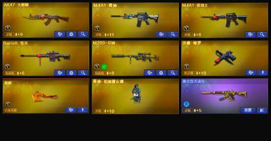 【英雄级武器】:M4A1-雷神,M4A1-黑骑士,AK47-火麒麟,Barrett-毁灭,M200-幻神,沙鹰-修罗,龙啸
