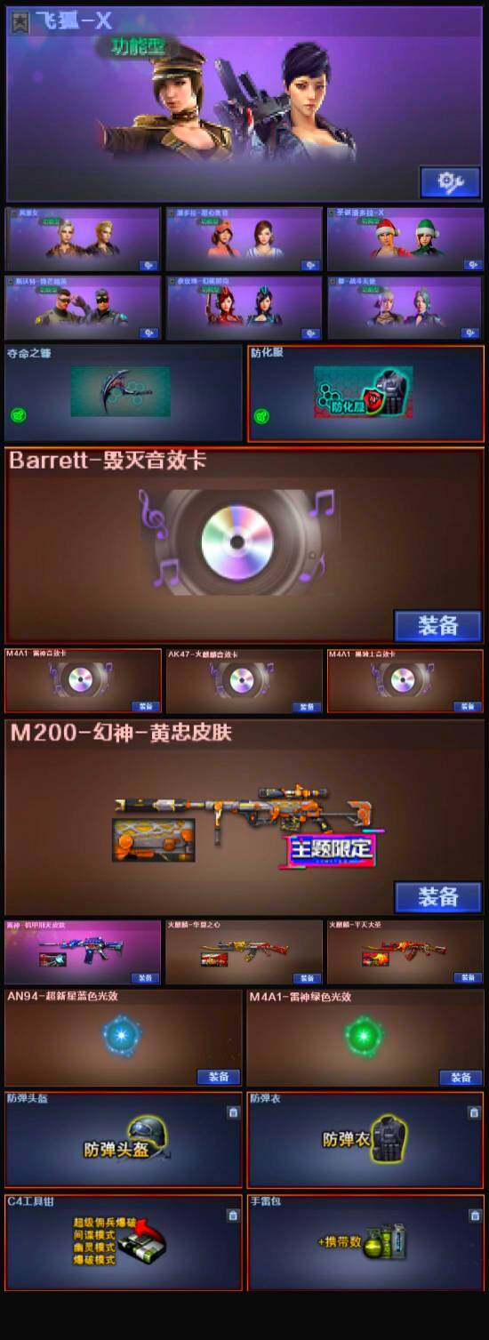 【音效卡】:AK47-火麒麟音效卡,M4A1-雷神音效卡,M4A1-黑骑士音效卡,Barrett-毁灭音效卡