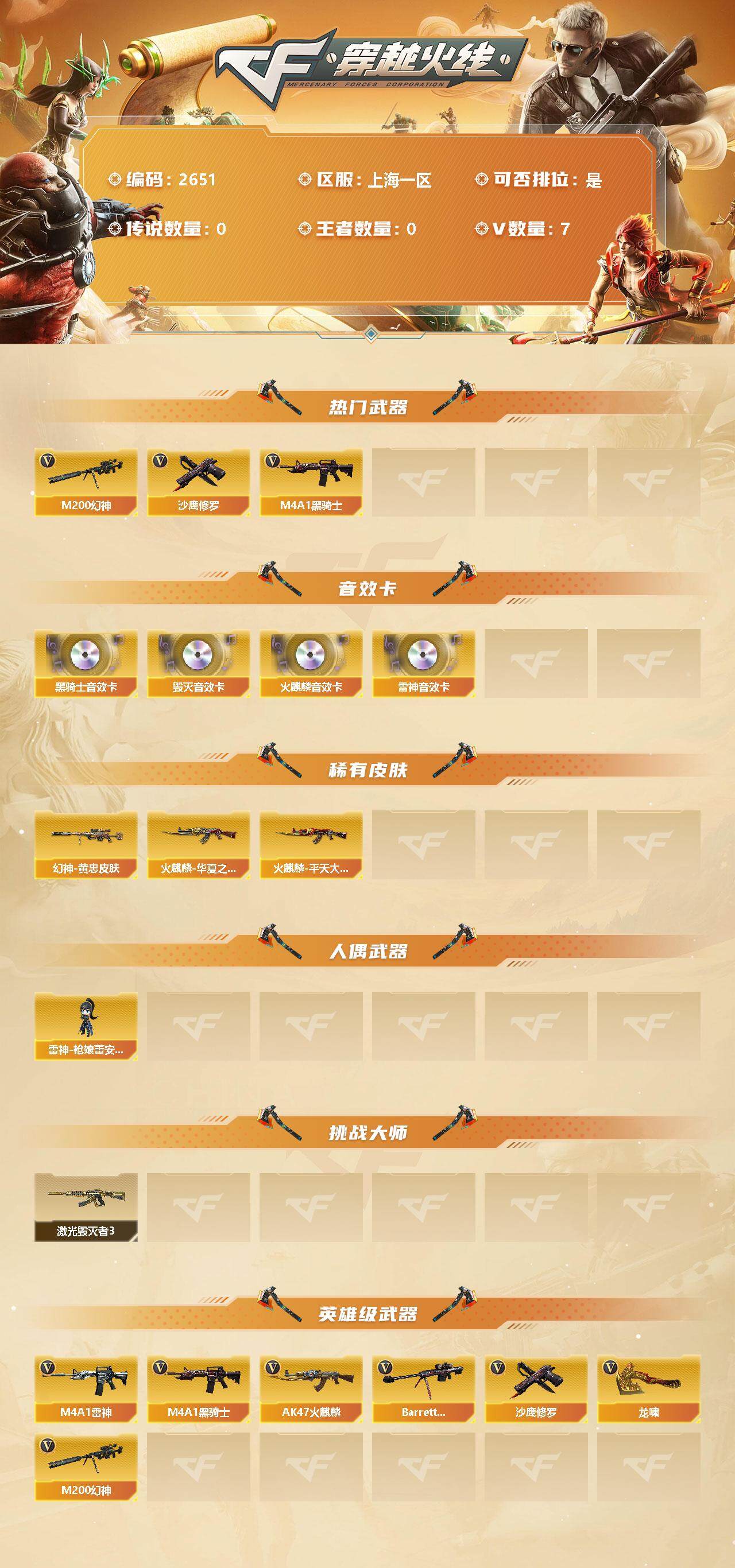 [12450042]【商品标题】:上海一区-7V-0王者-0炫金 【热门武器】:M200-幻神,M4A1-黑骑士,沙鹰-修罗 【音效卡】:AK47-火麒麟音效卡,M4A1-雷神音效卡,M4A1-黑骑士音效卡,Barrett-毁灭音效卡 【稀有皮肤】:M200-幻神-黄忠皮肤,火麒麟-华夏之心,火麒麟-平天大圣*2 【人偶武器】:雷神-枪娘蕾安娜 【挑战大师】:激光毁灭者III 【英雄级武器】:M4A1-雷神,M4A1-黑骑士,AK47-火麒麟,Barrett-毁灭,M200-幻神,沙鹰-修罗,龙啸 【特殊枪械】:1黑骑士