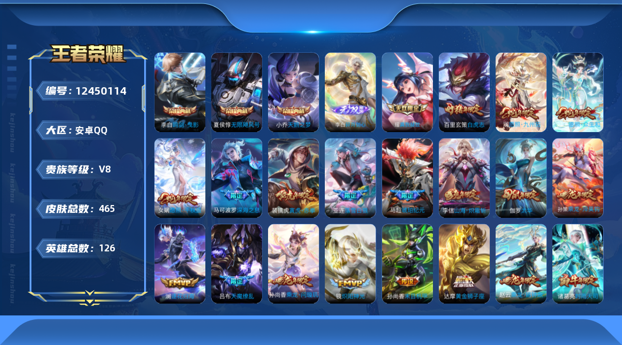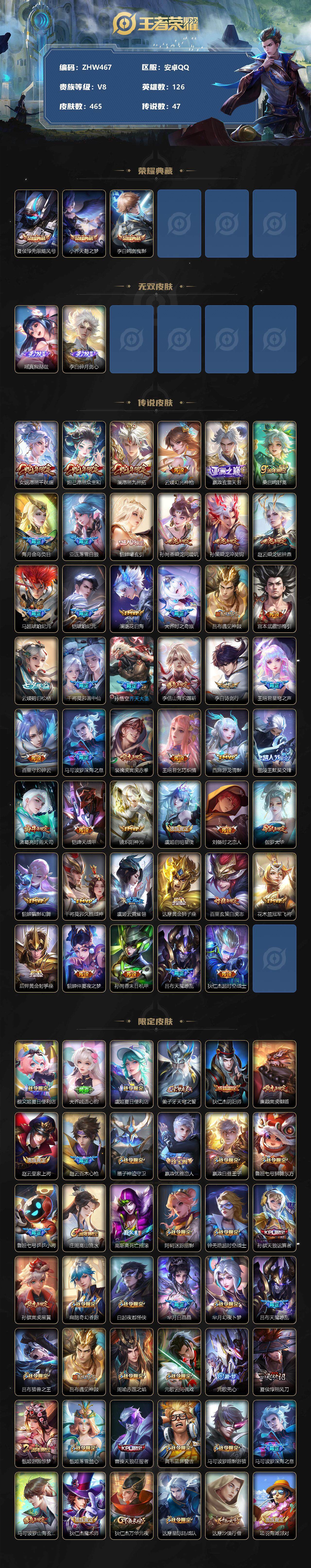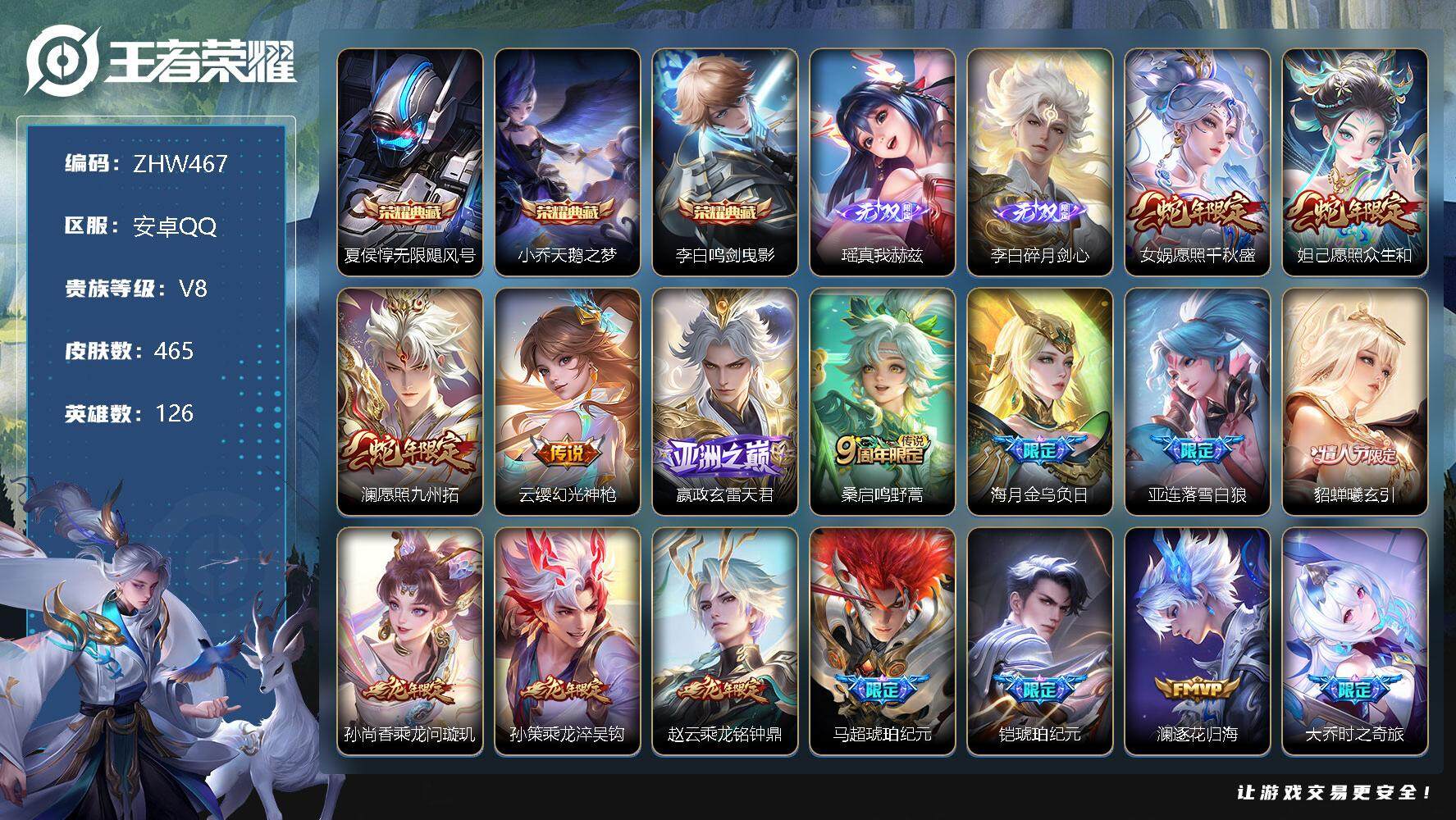 [12450114]【特价急出/详情看图】:安卓Q-V8-最强王者段位-126英雄-465皮肤-3典藏-2无双-47传说-145史诗