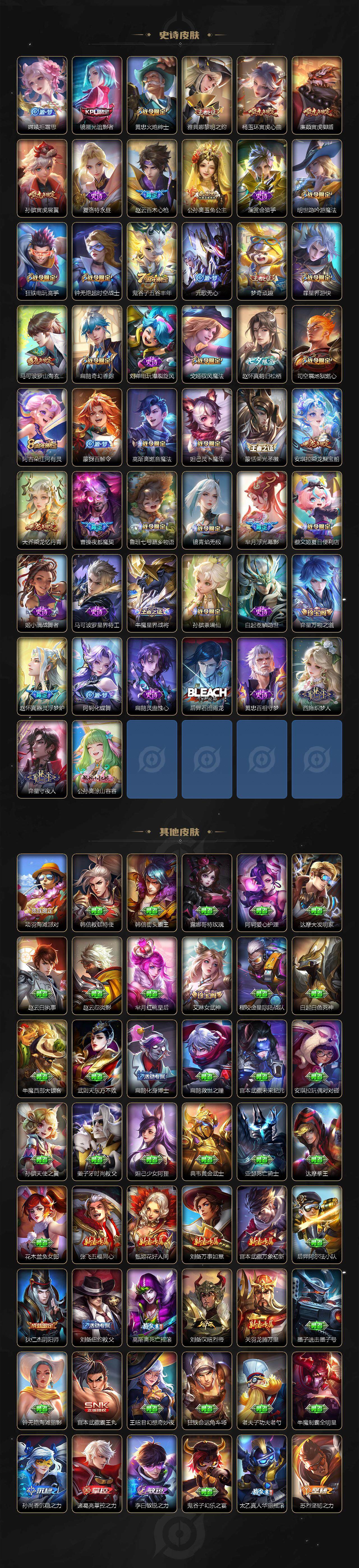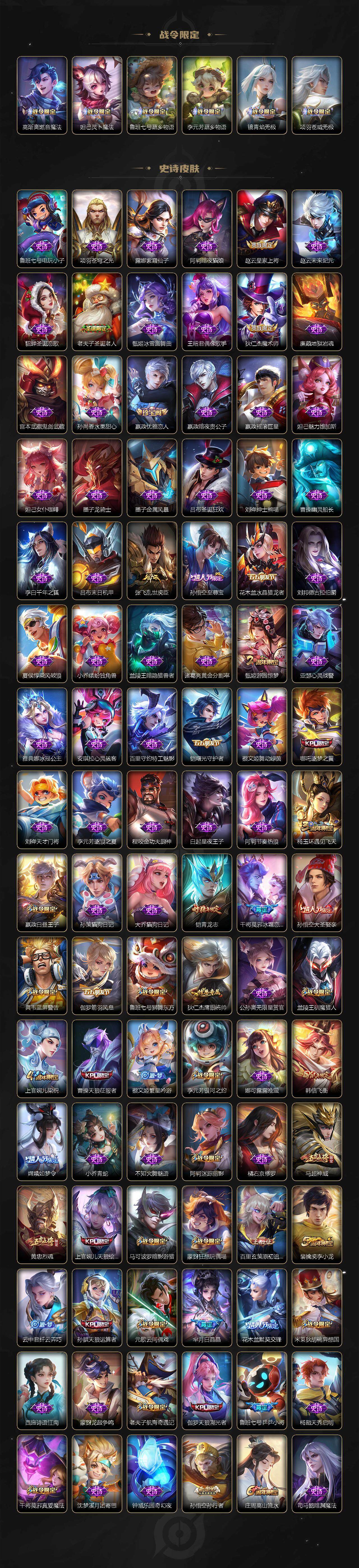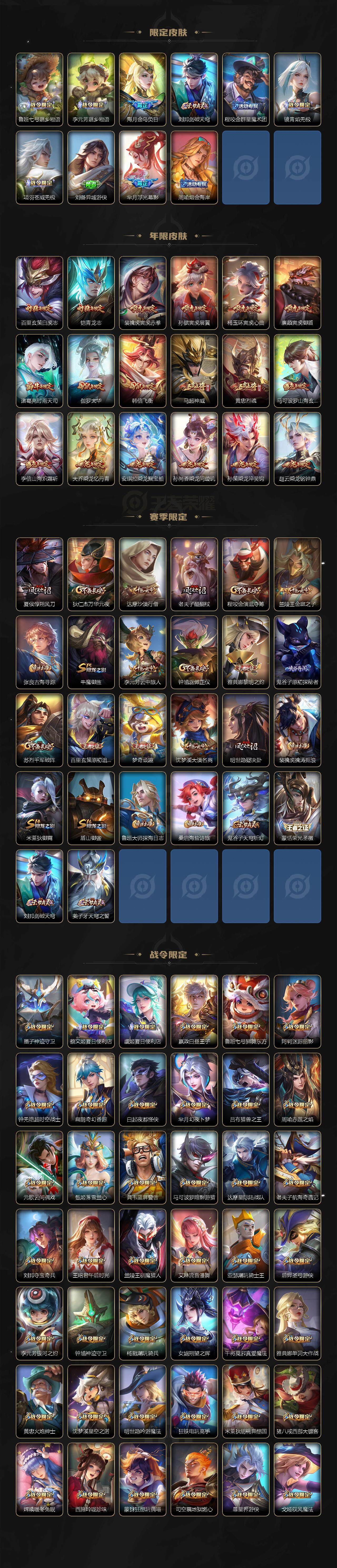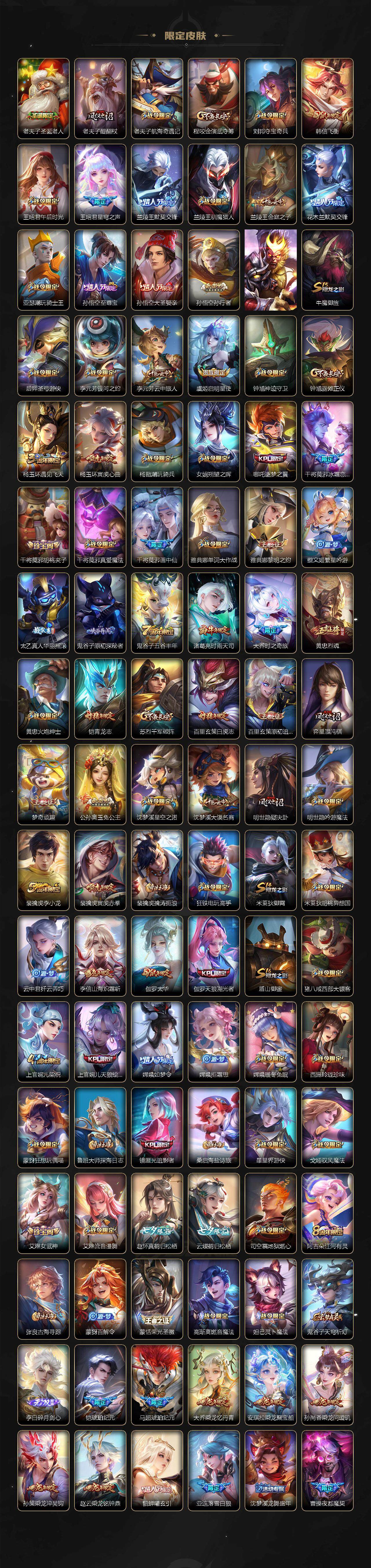 【限定皮肤】:蔡文姬夏日便利店,大乔绒语心约,虞姬夏日便利店,姜子牙天穹之誓,狄仁杰阴阳师,廉颇寅虎御盾,赵云皇家上将,赵云百木心枪,墨子神迹守卫,嬴政优雅恋人,嬴政白昼王子,鲁班七号狮舞东方,鲁班七号乒乒小将,庄周高山流水,高渐离死亡摇滚,阿轲迷踪丽影,钟无艳超时空战士,孙膑天狼运算者,孙膑寅虎展翼,扁鹊奇幻香踪,白起夜都怪侠,芈月白晶晶,芈月幻夜卜梦,吕布天魔缭乱,吕布猎兽之王,吕布遇见神鼓,周瑜赤莲之焰,元歌云间偶戏,元歌无心,夏侯惇朔风刀,甄姬游园惊梦,甄姬落雪兰心,曹操天狼征服者,典韦蓝屏警告,马可波罗暗影游猎,马可波罗深海之息,马可波罗山海玄木吟,狄仁杰魔术师,狄仁杰万华元夜,达摩星际陆战队,达摩沙漠行僧,项羽海滩派对,老夫子圣诞老人,老夫子醍醐杖,老夫子航海奇遇记,程咬金演武夺筹,刘邦夺宝奇兵,韩信飞衡,王昭君午后时光,王昭君星穹之声,兰陵王默契交锋,兰陵王驯魔猎人,兰陵王金庭之子,花木兰默契交锋,亚瑟潮玩骑士王,孙悟空至尊宝,孙悟空大圣娶亲,孙悟空孙行者,孙悟空齐天大圣,牛魔御旌,后羿圣弓游侠,李元芳银河之约,李元芳云中旅人,虞