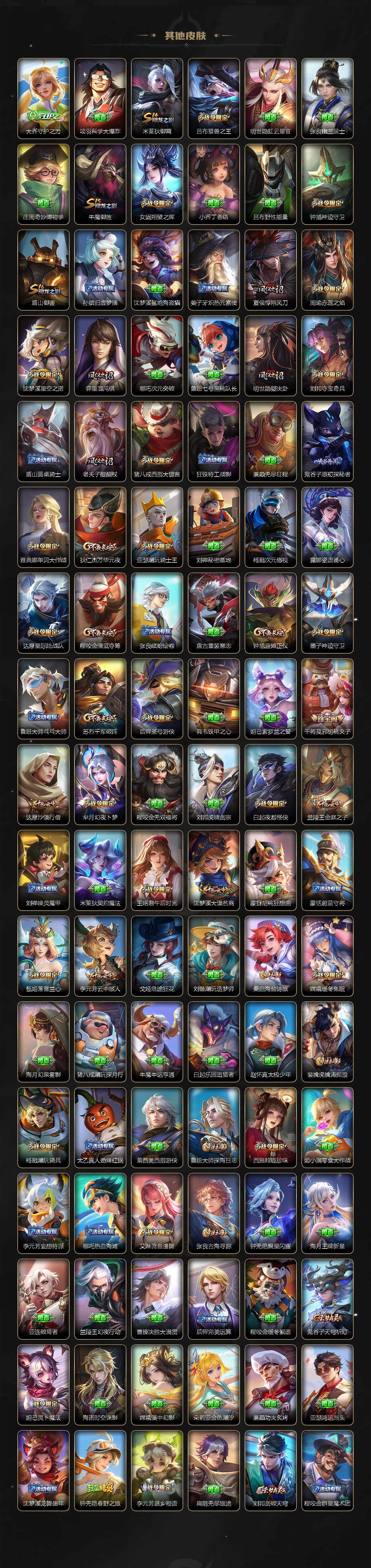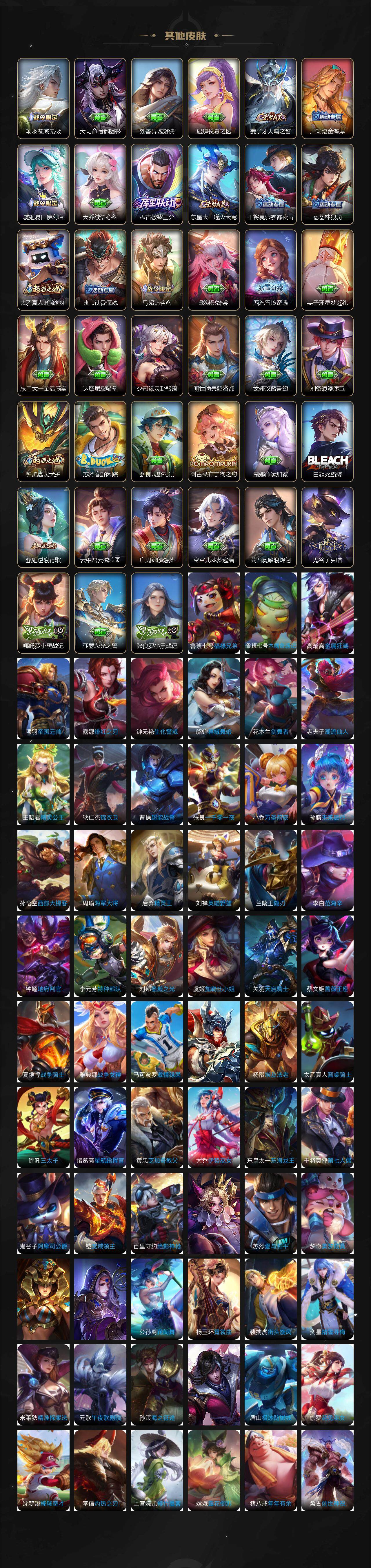 小乔青蛇,娜可露露晚萤,伽罗箭羽风息,李元芳逐浪之夏,不知火舞魅语,公孙离无限星赏官,大乔猫狗日记,孙策猫狗日记,阿轲节奏热浪,露娜紫霞仙子,诸葛亮黄金分割率,王昭君偶像歌手,项羽苍穹之光,阿轲暗夜猫娘,雅典娜冰冠公主,吕布末日机甲,鲁班七号电玩小子,蒙犽龙鼓争鸣,橘右京修罗,墨子龙骑士,嬴政摇滚巨星,刘禅绅士熊喵,刘禅天才门将,白起星夜王子,安琪拉心灵骇客,程咬金功夫厨神,刘邦德古拉伯爵,兰陵王暗隐猎兽者,曹操幽灵船长,宫本武藏鬼剑武藏,司马懿暗渊魔法,亚瑟心灵战警,钟馗乐园奇幻夜,杨戬天秀·启明,蔡文姬舞动绿茵,廉颇地狱岩魂,西施诗语江南,小乔缤纷独角兽,夏侯惇乘风破浪,花木兰水晶猎龙者,铠曙光守护者,墨子金属风暴,百里玄策原初追逐者,吕布圣诞狂欢,貂蝉圣诞恋歌,百里守约特工魅影,嬴政暗夜贵公子,嫦娥拒霜思,雅典娜黎明之约,李白千年之狐,夏洛特永昼,澜赏金猎手,刘禅电玩·爆裂旋风,赵怀真鹤归松栖,蒙犽百解令,高渐离燃音魔法,大乔乘龙·忆丹青,安琪拉乘龙·聚宝船,曹操夜都魔契,白起苍鳞隐世,赵怀真器灵·浮梦炉