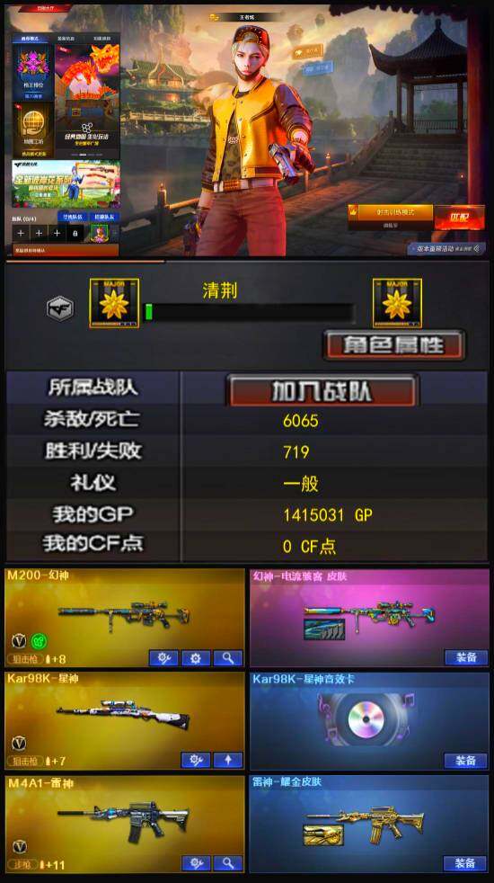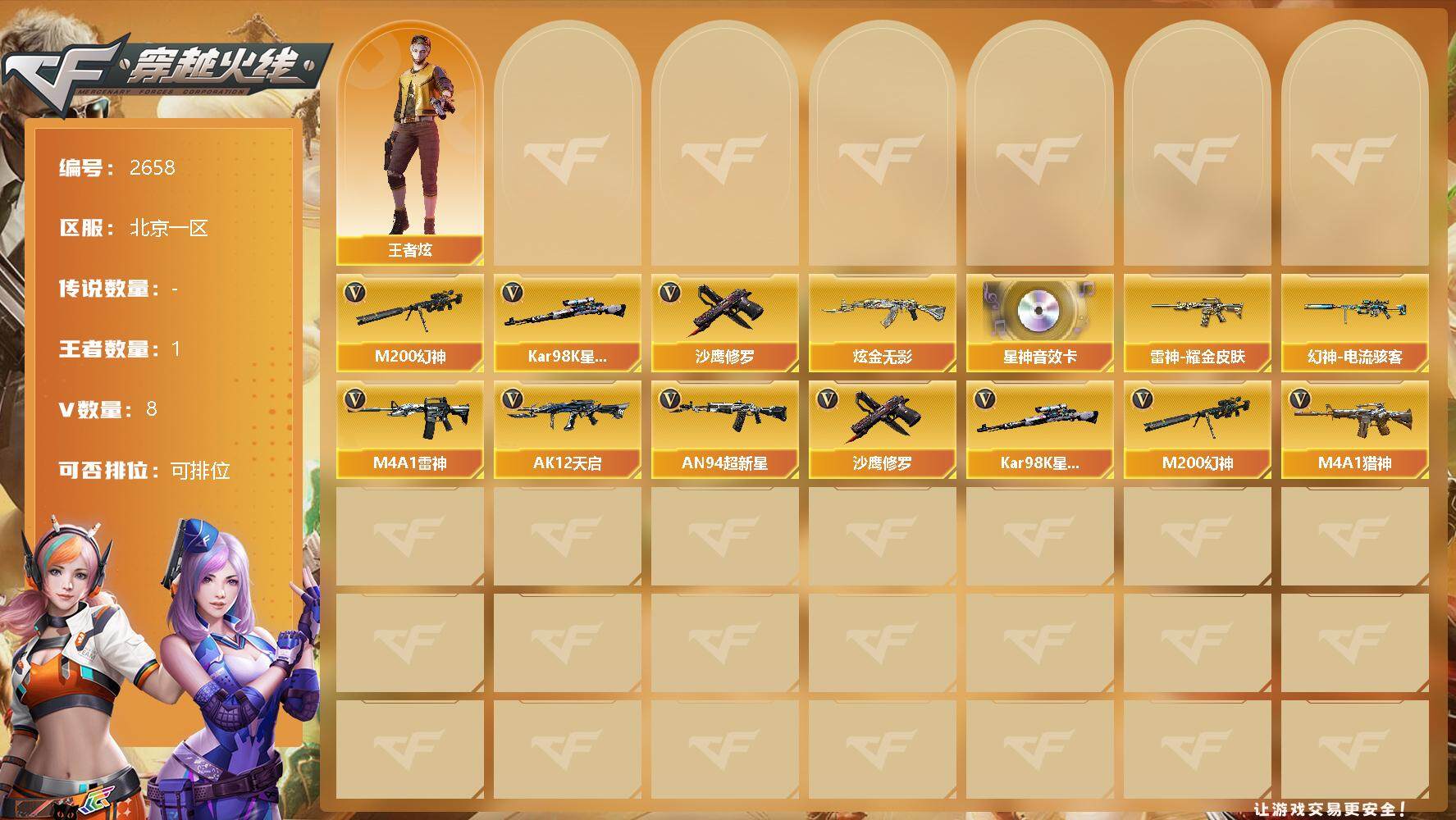 [12450287]【商品标题】:北京一区-8V-1王者-1炫金 【热门武器】:M200-幻神,Kar98K-星神,沙鹰-修罗*2 【王者炫金武器】:炫金无影 【音效卡】:Kar98K-星神音效卡 【稀有皮肤】:幻神-电流骇客 皮肤,雷神-耀金皮肤 【角色】:王者炫 【英雄级武器】:M4A1-雷神,AK12-天启,AN94-超新星,Kar98K-星神,M200-幻神,M4A1-猎神,沙鹰-修罗*2 【特殊枪械】: