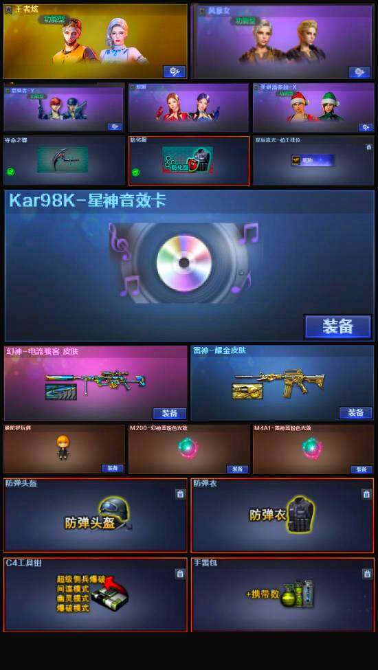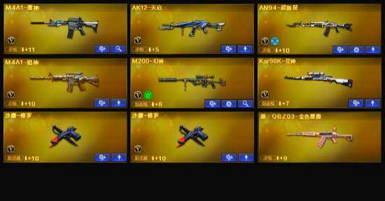 【英雄级武器】:M4A1-雷神,AK12-天启,AN94-超新星,Kar98K-星神,M200-幻神,M4A1-猎神,沙鹰-修罗*2