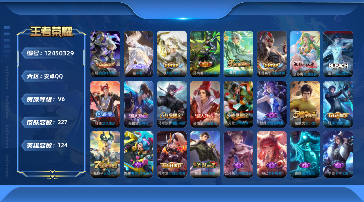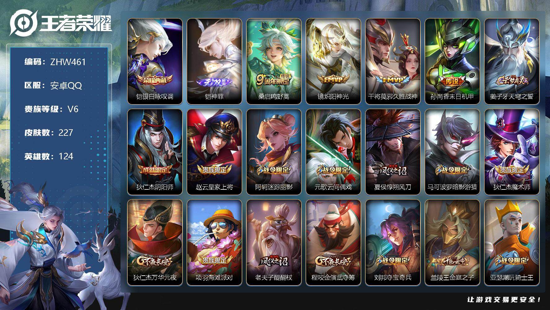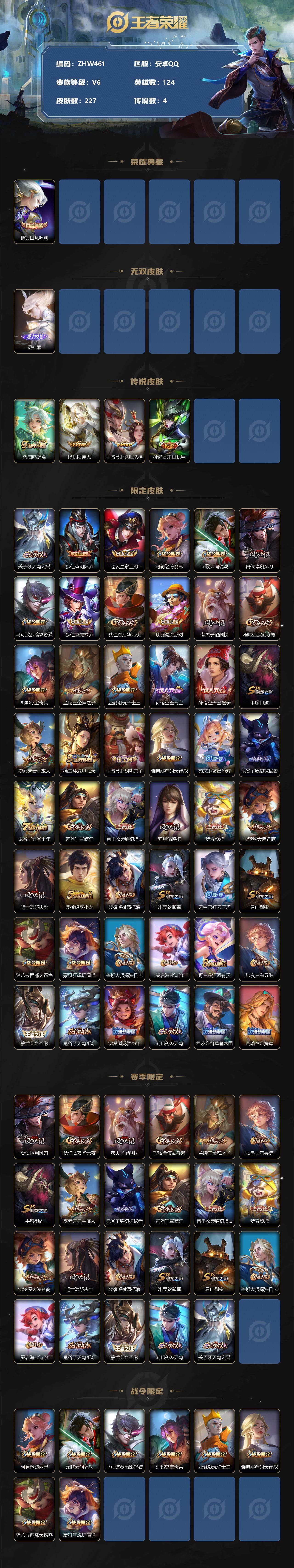 [12450329]【商品标题】:安卓Q-V6-永恒钻石III段位-124英雄-227皮肤-1典藏-1无双-4传说-56史诗