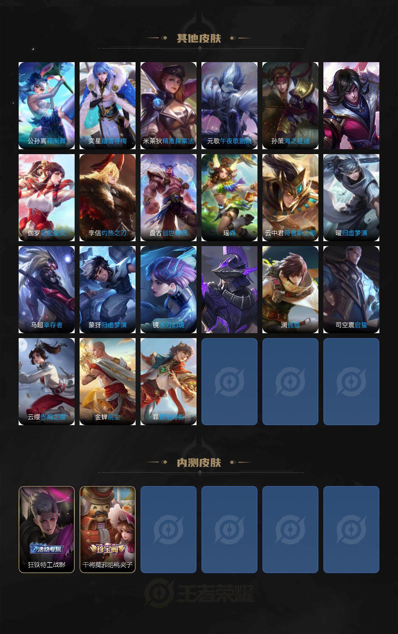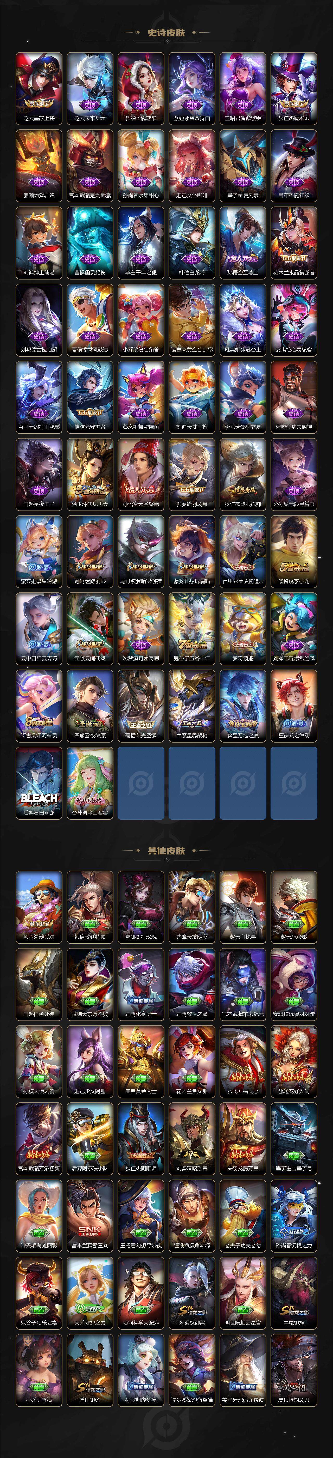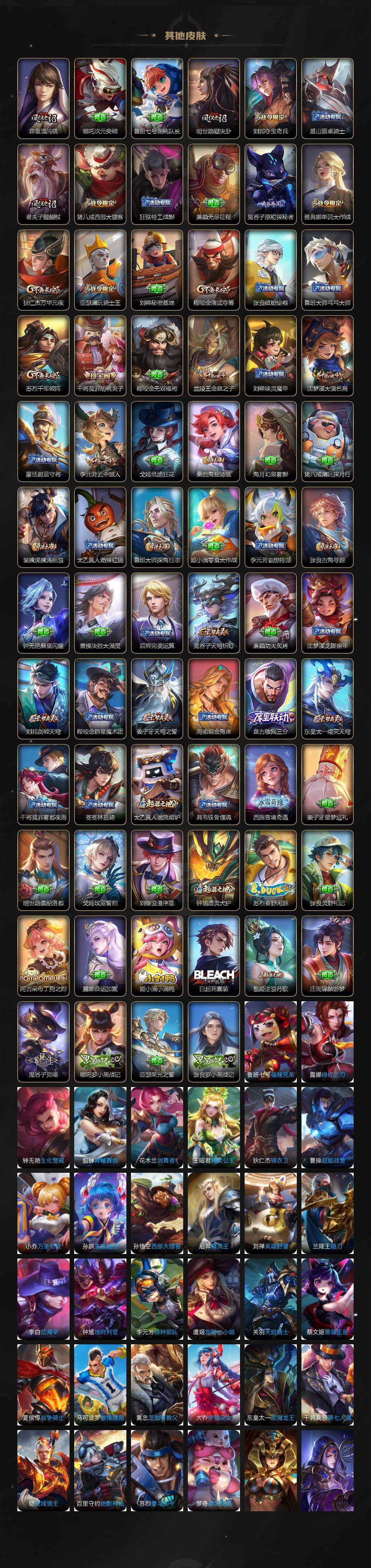 【限定皮肤】:姜子牙天穹之誓,狄仁杰阴阳师,赵云皇家上将,阿轲迷踪丽影,元歌云间偶戏,夏侯惇朔风刀,马可波罗暗影游猎,狄仁杰魔术师,狄仁杰万华元夜,项羽海滩派对,老夫子醍醐杖,程咬金演武夺筹,刘邦夺宝奇兵,兰陵王金庭之子,亚瑟潮玩骑士王,孙悟空至尊宝,孙悟空大圣娶亲,牛魔御旌,李元芳云中旅人,杨玉环遇见飞天,干将莫邪胡桃夹子,雅典娜单词大作战,蔡文姬繁星吟游,鬼谷子原初探秘者,鬼谷子五谷丰年,苏烈千军破阵,百里玄策原初追逐者,弈星混沌棋,梦奇顽趣,沈梦溪大漠名商,明世隐疑决卦,裴擒虎李小龙,裴擒虎擒涛扼浪,米莱狄御霄,云中君纤云弄巧,盾山御銮,猪八戒西部大镖客,蒙犽狂想玩偶喵,鲁班大师探海日志,桑启海盐诗旅,阿古朵江河有灵,张良古海寻踪,蒙恬荣光圣徽,鬼谷子天穹祈灯,沈梦溪龙舞盛年,刘邦剑破天穹,程咬金群星魔术团,周瑜熔金海岸