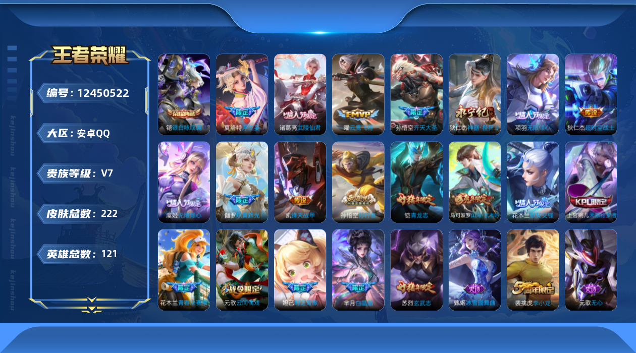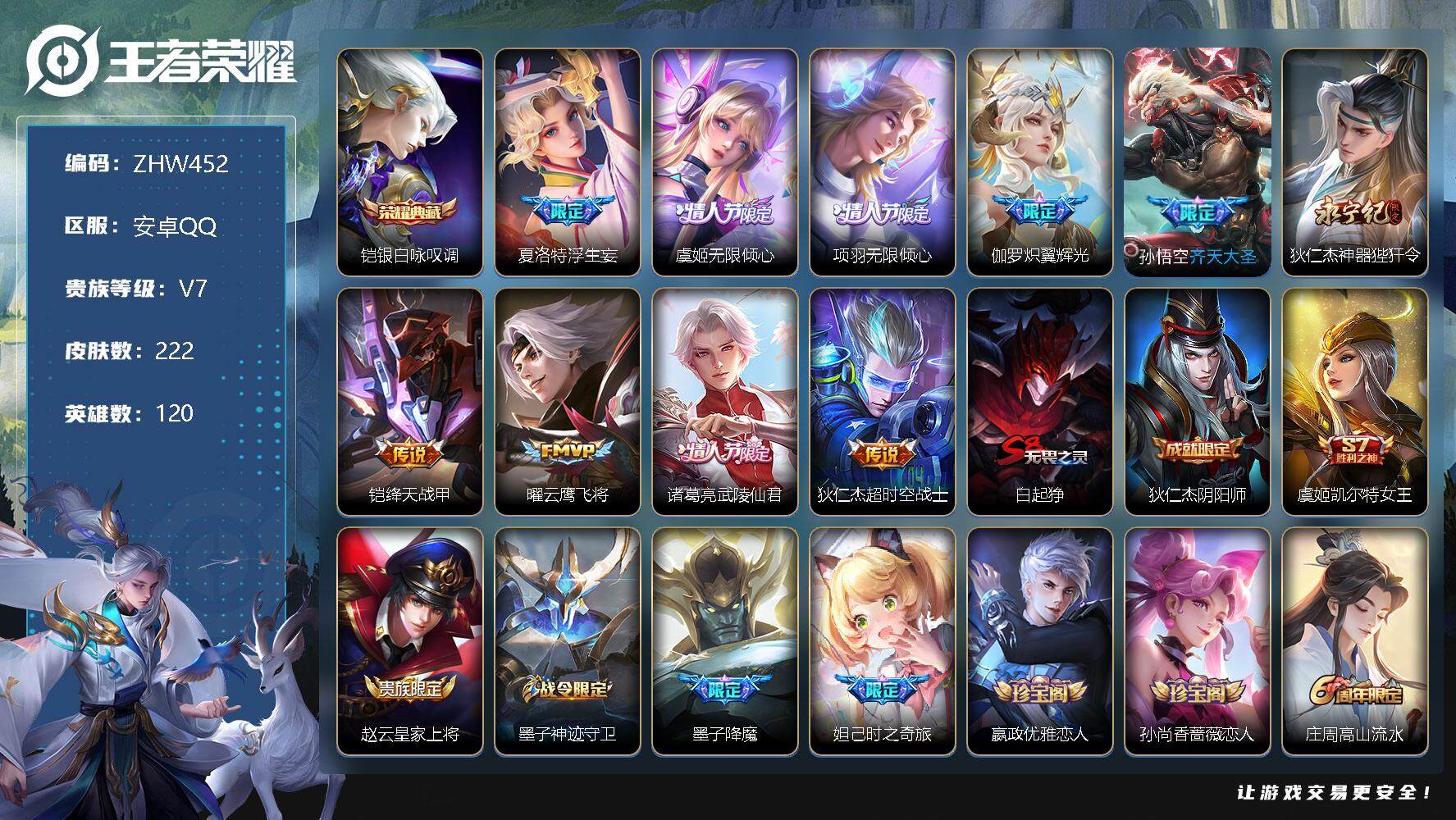 - [12073499]V7 1典藏 9传说 125英雄 272皮肤 可修改实名 优质装备:弑枪猎影(韩信典藏),黄金狮子座,黄金射手座,末日机甲-孙尚香(绿蚂蚱),零号·赤焰,超时空战士-狄仁杰,涂山容容 珍宝阁皮:妄想食味,蔷薇恋人 限定皮:愿照·岁时盈(虞姬年限),愿照·山河定(司空震年限),鸣野蒿,至尊宝,白晶晶,高山流水,五谷丰年,游园惊梦,梁祝,岱宗(典韦年限),李小龙,天魔缭乱,冰霜恋舞曲 史诗皮:鸭鸭历险记-刘禅,器灵·浮梦炉,狼魂孤将,星界战将,龙之律动,石田雨龙,怒海争锋,蔬乡物语(鲁班七号),百相守梦-百里守约,百相守梦-黄忠,苍穹之光,电玩小子(小书包),白龙吟,黄金分割率,特工魅影,永昼,末日机甲-莱西奥,魅语,高渐离燃音魔法,无限星赏官,偶像歌手,晚萤,猫狗日记-孙策,乱世虎臣,节奏热浪,女仆咖啡,摇滚巨星,水果甜心,绅士熊喵,星夜王子,心灵骇客,功夫厨神,德古拉伯爵,暗隐猎兽者,幽灵船长,鬼剑武藏,暗渊魔法,乐园奇幻夜,天秀·启明,地狱岩魂,纤云弄巧,繁星吟游(呼啦呼啦),拒霜思,缤纷独角兽,乘风破浪,逐浪之夏,水晶猎龙者,曙光守护者,箭羽风息,金属风暴,原初追逐者,圣诞狂欢,圣诞恋歌,鹰眼统帅,魅力维加斯,黎明之约,赏金猎手,奇遇舞章,未来纪元-赵云