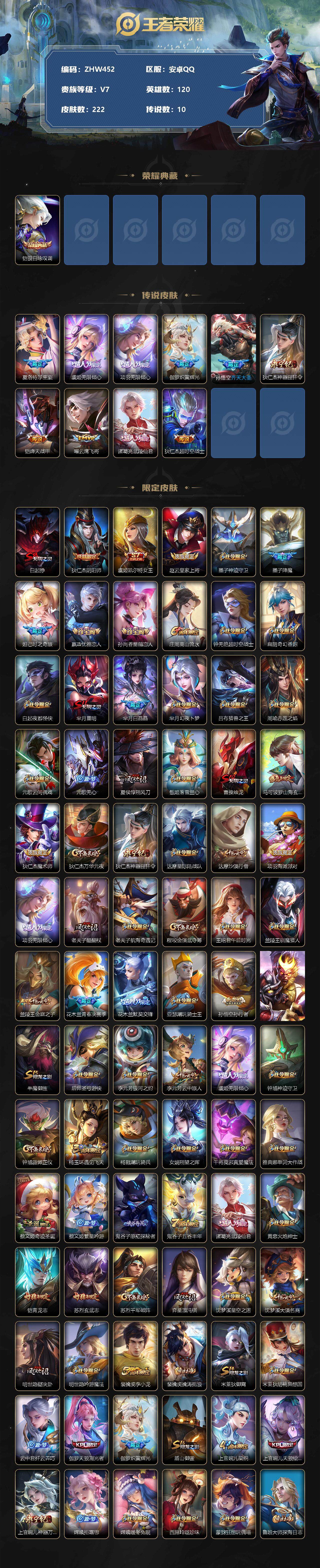 - [11625404]V7 10传说 124英雄 148皮肤 可修改实名 优质装备:冠军飞将,云鹰飞将(小将军),久胜战神,一念神魔,云霓雀翎,地狱火,挚爱之约 传说皮:幻光神枪 珍宝阁皮:优雅恋人 限定皮:凤求凰(白切鸡),武陵仙君(小桃花),傲雪梅枪,冰锋战神,梁祝,李小龙,逐梦之影,孙行者,猪悟能,大圣娶亲 史诗皮:紫霞仙子,白龙吟,千年之狐,晚萤,节奏热浪,修罗,女仆咖啡,水果甜心,星夜王子,暗隐猎兽者,幽灵船长,鬼剑武藏,地狱岩魂,繁星吟游(呼啦呼啦),拒霜思,缤纷独角兽,乘风破浪,逐浪之夏,水晶猎龙者,曙光守护者,原初追逐者,圣诞狂欢,鹰眼统帅,魅力维加斯,赏金猎手,无心
