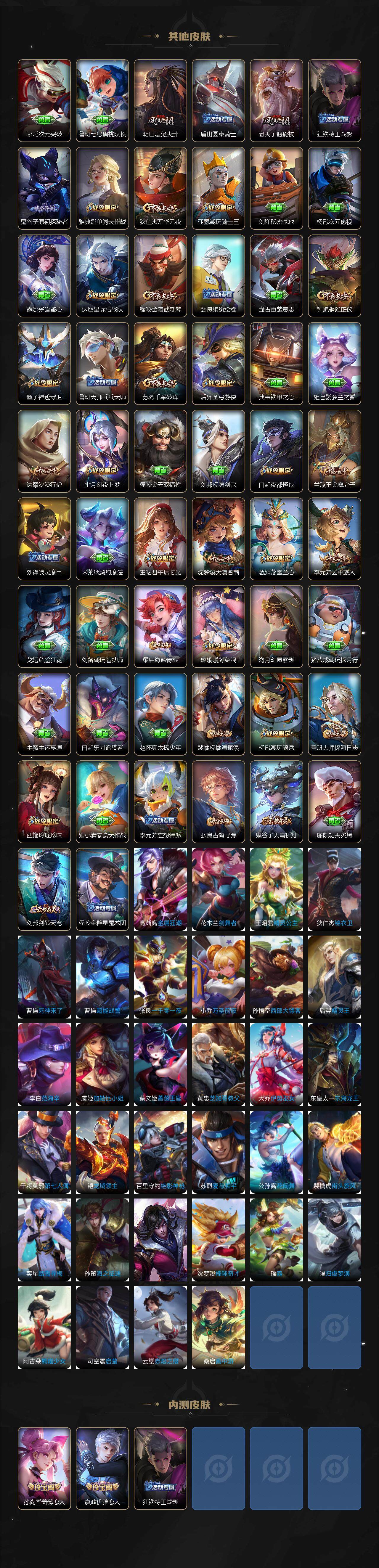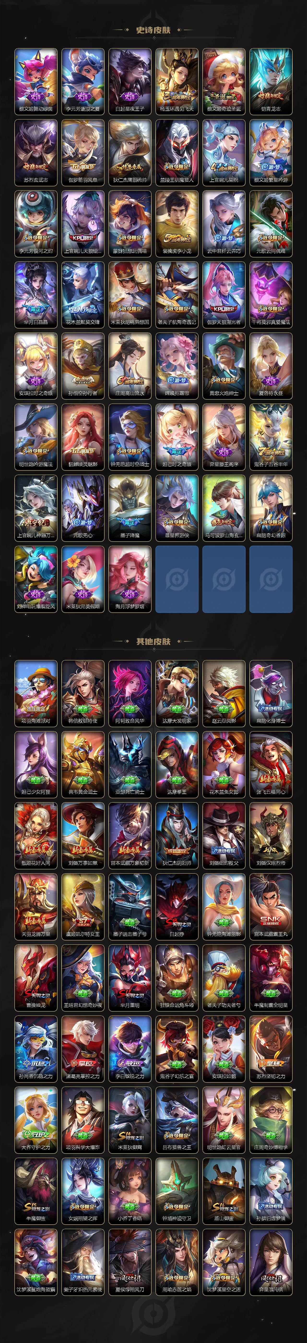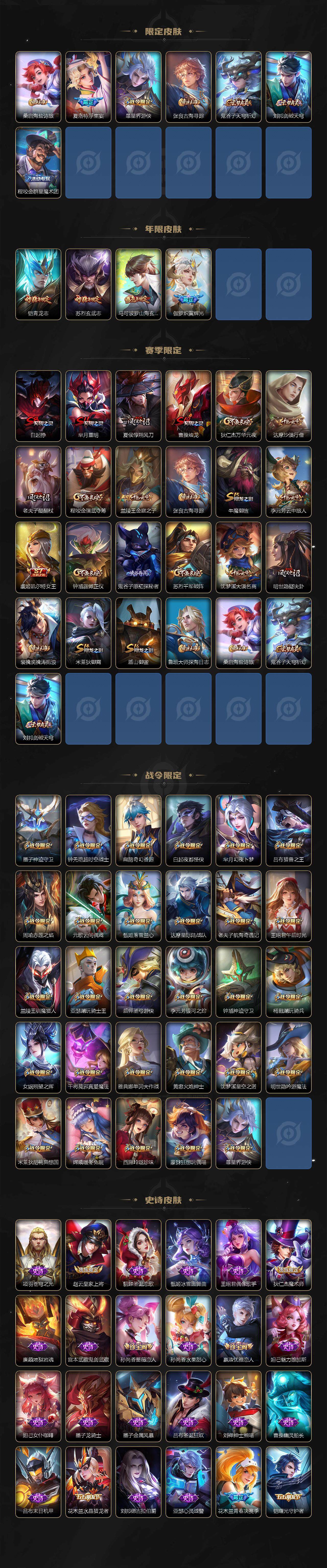 【限定皮肤】:白起狰,狄仁杰阴阳师,虞姬凯尔特女王,赵云皇家上将,墨子神迹守卫,墨子降魔,妲己时之奇旅,嬴政优雅恋人,孙尚香蔷薇恋人,庄周高山流水,钟无艳超时空战士,扁鹊奇幻香踪,白起夜都怪侠,芈月重明,芈月白晶晶,芈月幻夜卜梦,吕布猎兽之王,周瑜赤莲之焰,元歌云间偶戏,元歌无心,夏侯惇朔风刀,甄姬落雪兰心,曹操烛龙,马可波罗山海玄木吟,狄仁杰魔术师,狄仁杰万华元夜,狄仁杰神器狴犴令,达摩星际陆战队,达摩沙漠行僧,项羽海滩派对,项羽无限倾心,老夫子醍醐杖,老夫子航海奇遇记,程咬金演武夺筹,王昭君午后时光,兰陵王驯魔猎人,兰陵王金庭之子,花木兰青春决赛季,花木兰默契交锋,亚瑟潮玩骑士王,孙悟空孙行者,孙悟空齐天大圣,牛魔御旌,后羿圣弓游侠,李元芳银河之约,李元芳云中旅人,虞姬无限倾心,钟馗神迹守卫,钟馗驱傩正仪,杨玉环遇见飞天,杨戬潮玩骑兵,女娲朔望之晖,干将莫邪真爱魔法,雅典娜单词大作战,蔡文姬奇迹圣诞,蔡文姬繁星吟游,鬼谷子原初探秘者,鬼谷子五谷丰年,诸葛亮武陵仙君,黄忠火炮绅士,铠青龙志,苏烈玄武志,苏烈千军破阵,弈星混沌棋,沈梦溪星空之诺,沈梦溪大漠名商,明世隐疑决卦,明世隐吟游魔法,裴擒虎李小龙,裴擒虎擒涛扼浪,米莱狄御霄,米莱狄胡桃异想国,云中君纤云弄巧,伽罗天狼溯光者,伽罗炽翼辉光,盾山御銮,上官婉儿梁祝,上官婉儿天狼绘梦者,上官婉儿神器万象笔,嫦娥拒霜思,嫦娥暖冬兔眠,西施玲珑珍味,蒙犽狂想玩偶喵,鲁班大师探海日志,桑启海盐诗旅,夏洛特浮生妄,暃星界游侠,张良古海寻踪,鬼谷子天穹祈灯,刘邦剑破天穹,程咬金群星魔术团
