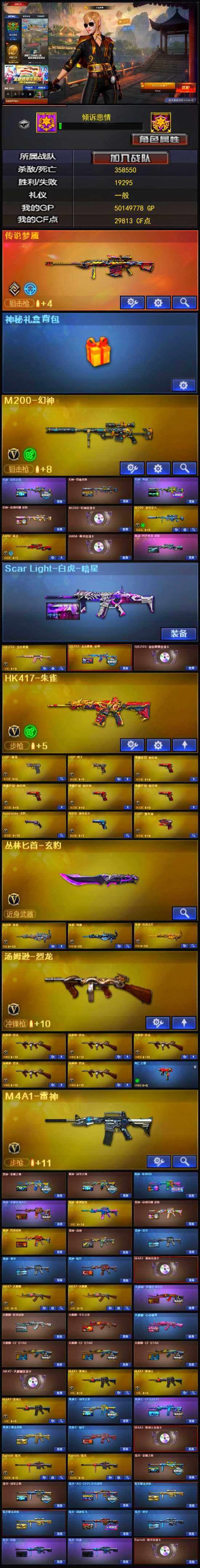 【热门武器】:传说梦魇,QBZ03-金色蔷薇,HK417-朱雀,M200-幻神,M200-竞技荣光,死亡之眼,荣耀世冠-火麒麟,荣耀世冠-雷神,荣耀世冠-柯尔特*4,C.A.T,牛牛-AK47,M4A1-黑骑士*3,汤姆逊-烈龙*6,加特林-炼狱,火麒麟-绝迹,COP-白鲨,USP-雷暴,COP-堕天神,沙鹰-修罗*9,荣耀世冠-龙啸