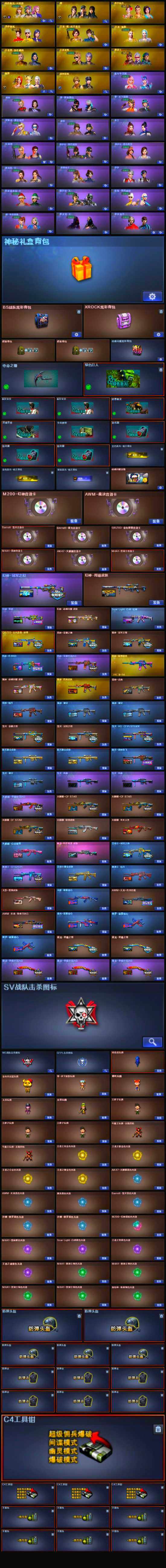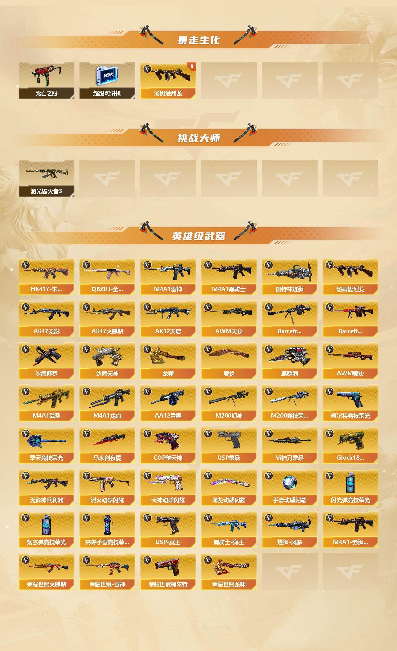 【英雄级武器】:M200-竞技荣光,柯尔特-竞技荣光,擎天-竞技荣光*2,高爆手雷-竞技荣光*3,烟雾弹-竞技荣光*3,闪光弹-竞技荣光*4,马来剑-夜魔,COP-堕天神,USP-雷暴,斩神刀-雷暴,M4A1-武圣,Glock18-武圣,荣耀世冠-火麒麟,荣耀世冠-雷神,荣耀世冠-柯尔特*4,荣耀世冠-龙啸,烈火-