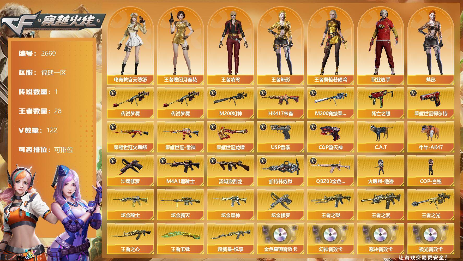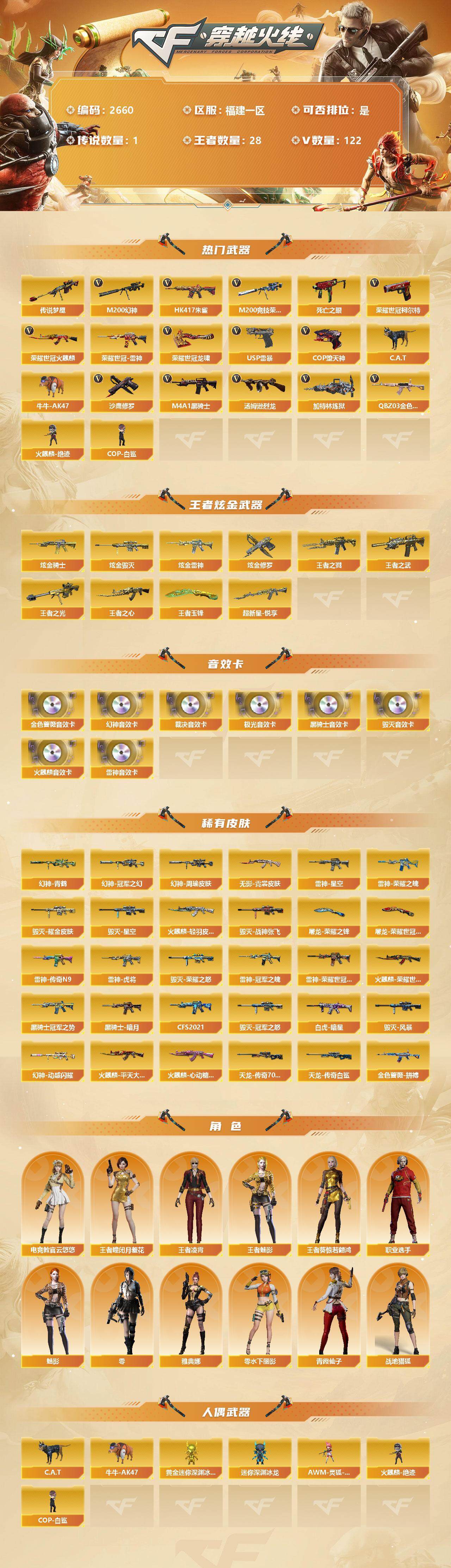 [12450370]【商品标题】:福建一区-122V-28王者-7炫金 【传说武器】:传说梦魇 【热门武器】:传说梦魇,QBZ03-金色蔷薇,HK417-朱雀,M200-幻神,M200-竞技荣光,死亡之眼,荣耀世冠-火麒麟,荣耀世冠-雷神,荣耀世冠-柯尔特*4,C.A.T,牛牛-AK47,M4A1-黑骑士*3,汤姆逊-烈龙*6,加特林-炼狱,火麒麟-绝迹,COP-白鲨,USP-雷暴,COP-堕天神,沙鹰-修罗*9,荣耀世冠-龙啸 【王者炫金武器】:炫金骑士*2,炫金毁灭*2,炫金雷神*2,炫金修罗,王者之戮,超新星-悦享,王者之武,王者之光,王者之心,王者玉锋 【音效卡】:M200-幻神音效卡,AK47-火麒麟音效卡,M4A1-雷神音效卡,M4A1-黑骑士音效卡,Barrett-毁灭音效卡,Barrett-极光音效卡,QBZ03-金色蔷薇音效卡,AWM-裁决音效卡 【稀有皮肤】:幻神-周瑜皮肤,幻神-冠军之幻,幻神-青鹤,幻神-动感闪耀 皮肤,Scar Light-白虎-暗星,QBZ03-金色蔷薇-拼搏,雷神-荣耀之魄,雷神-星空*2,雷神-虎将,雷神-冠军之魄,雷神-传奇N9,雷神-荣耀世冠AG,火麒麟-轻羽皮肤,火麒麟-平天大圣,火麒麟-荣耀世冠AG,火麒麟-心动糖果,黑骑士-暗月,黑骑士-冠军之势,黑骑士-CFS2021,毁灭-荣耀之怒,毁灭耀金皮肤*2,毁灭-星空,毁灭-冠军之怒,毁灭-战神张飞,毁灭-风暴*2,AWM-天龙-传奇70KG,AWM-天龙-传奇白鲨,无影-霓裳皮肤,屠龙-荣耀之锋*2,屠龙-荣耀世冠AG*3 【角色】:王者-瞳-闭月羞花,王者葵-惊若翩鸿,王者凌霄,王者-魅影,雅典娜,零-水下丽影,零,魅影,电竞教官-云悠悠,战地猎狐,职业选手,青霞仙子 【人偶武器】:火麒麟-绝迹,COP-白鲨,AWM-灵狐-15周年嘉年华,C.A.T,牛牛-AK47,黄金迷你深渊冰龙,迷你深渊冰龙 【暴走生化】:死亡之眼,超级对讲机 【挑战大师】:激光毁灭者III 【英雄级武器】:M200-竞技荣光,柯尔特-竞技荣光,擎天-竞技荣光*2,高爆手雷-竞技荣光*3,烟雾弹-竞技荣光*3,闪光弹-竞技荣光*4,马来剑-夜魔,COP-堕天神,USP-雷暴,斩神刀-雷暴,M4A1-武圣,Glock18-武圣,荣耀世冠-火麒麟,荣耀世冠-雷神,荣耀世冠-柯尔特*4,荣耀世冠-龙啸,烈火-