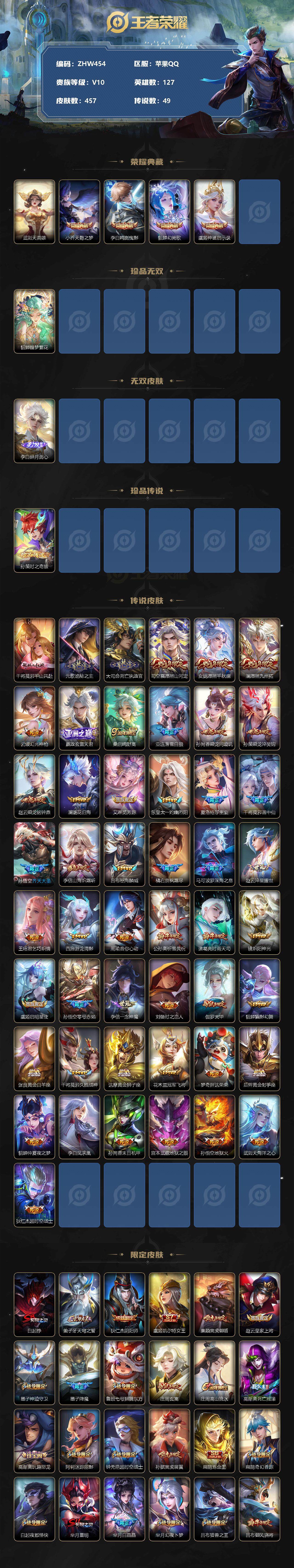 [12450466]【特价急出/详情看图/全能高手/打野中路33段】:苹果Q-V10-最强王者段位-127英雄-457皮肤-4典藏-1珍品无双-1无双-1珍品传说-49传说-136史诗
