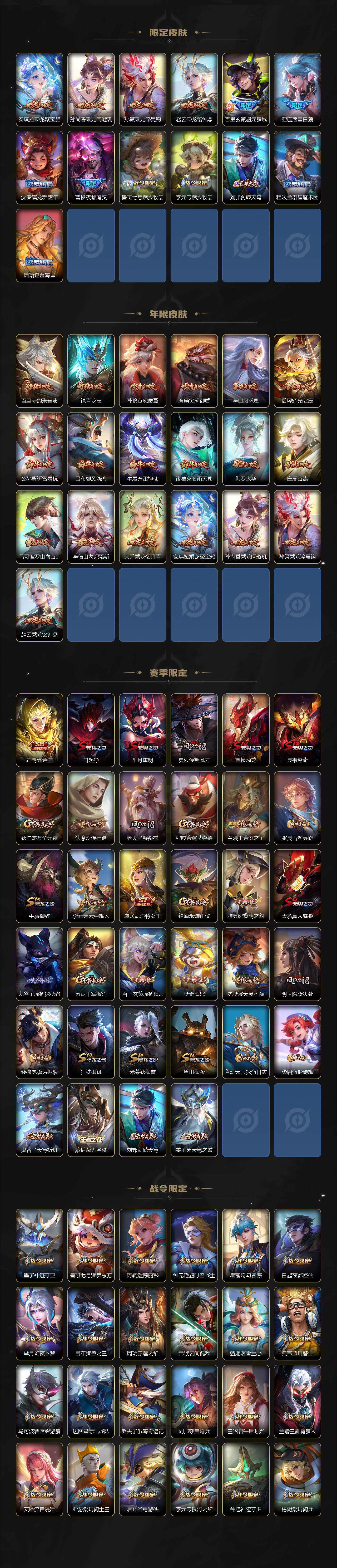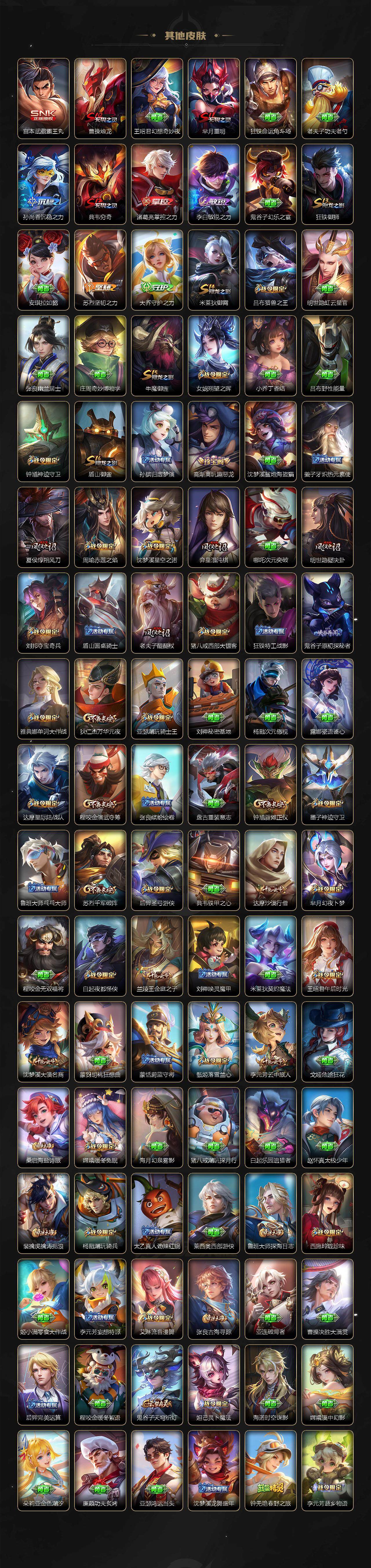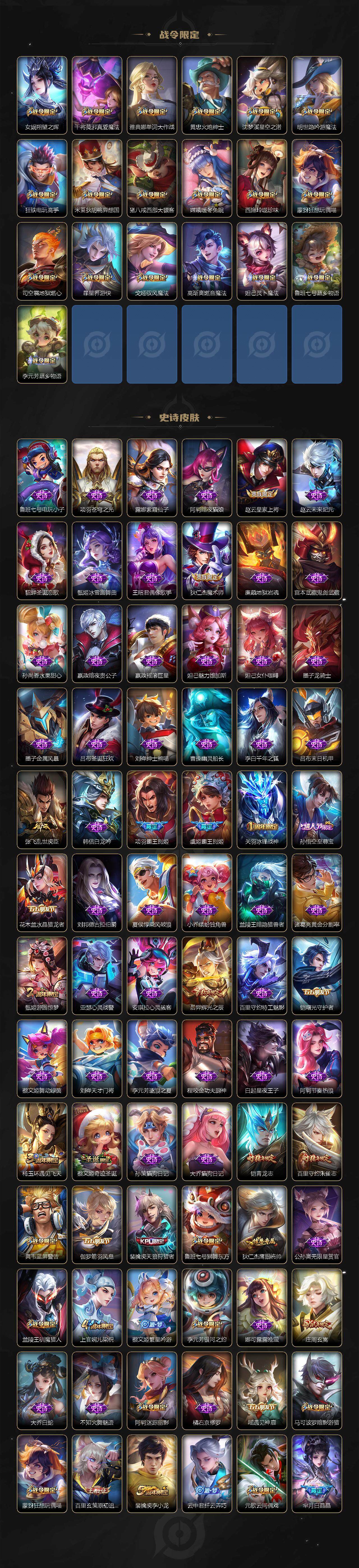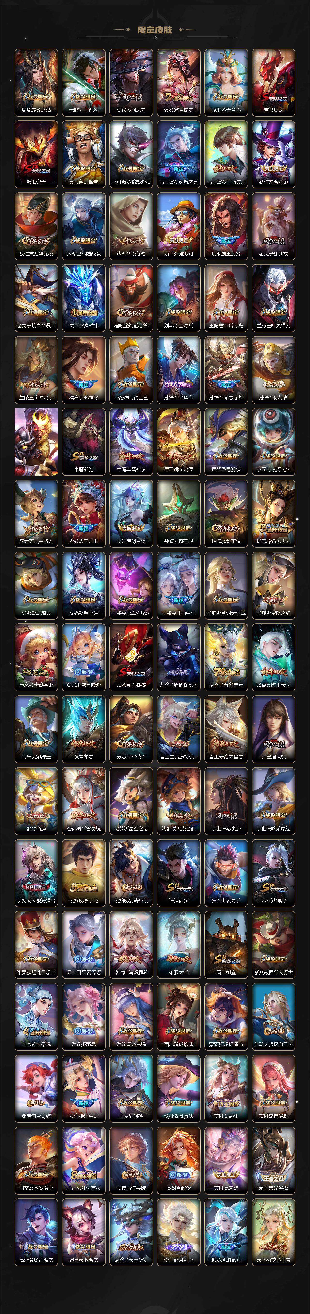 【限定皮肤】:白起狰,姜子牙天穹之誓,狄仁杰阴阳师,虞姬凯尔特女王,廉颇寅虎御盾,赵云皇家上将,墨子神迹守卫,墨子降魔,鲁班七号狮舞东方,庄周玄嵩,庄周高山流水,高渐离死亡摇滚,高渐离玩趣恶龙,阿轲迷踪丽影,钟无艳超时空战士,孙膑寅虎展翼,扁鹊炼金王,扁鹊奇幻香踪,白起夜都怪侠,芈月重明,芈月白晶晶,芈月幻夜卜梦,吕布猎兽之王,吕布御风骁将,周瑜赤莲之焰,元歌云间偶戏,夏侯惇朔风刀,甄姬游园惊梦,甄姬落雪兰心,曹操烛龙,典韦穷奇,典韦蓝屏警告,马可波罗暗影游猎,马可波罗深海之息,马可波罗山海玄木吟,狄仁杰魔术师,狄仁杰万华元夜,达摩星际陆战队,达摩沙漠行僧,项羽海滩派对,项羽霸王别姬,老夫子醍醐杖,老夫子航海奇遇记,关羽冰锋战神,程咬金演武夺筹,刘邦夺宝奇兵,王昭君午后时光,兰陵王驯魔猎人,兰陵王金庭之子,橘右京枫霜尽,亚瑟潮玩骑士王,孙