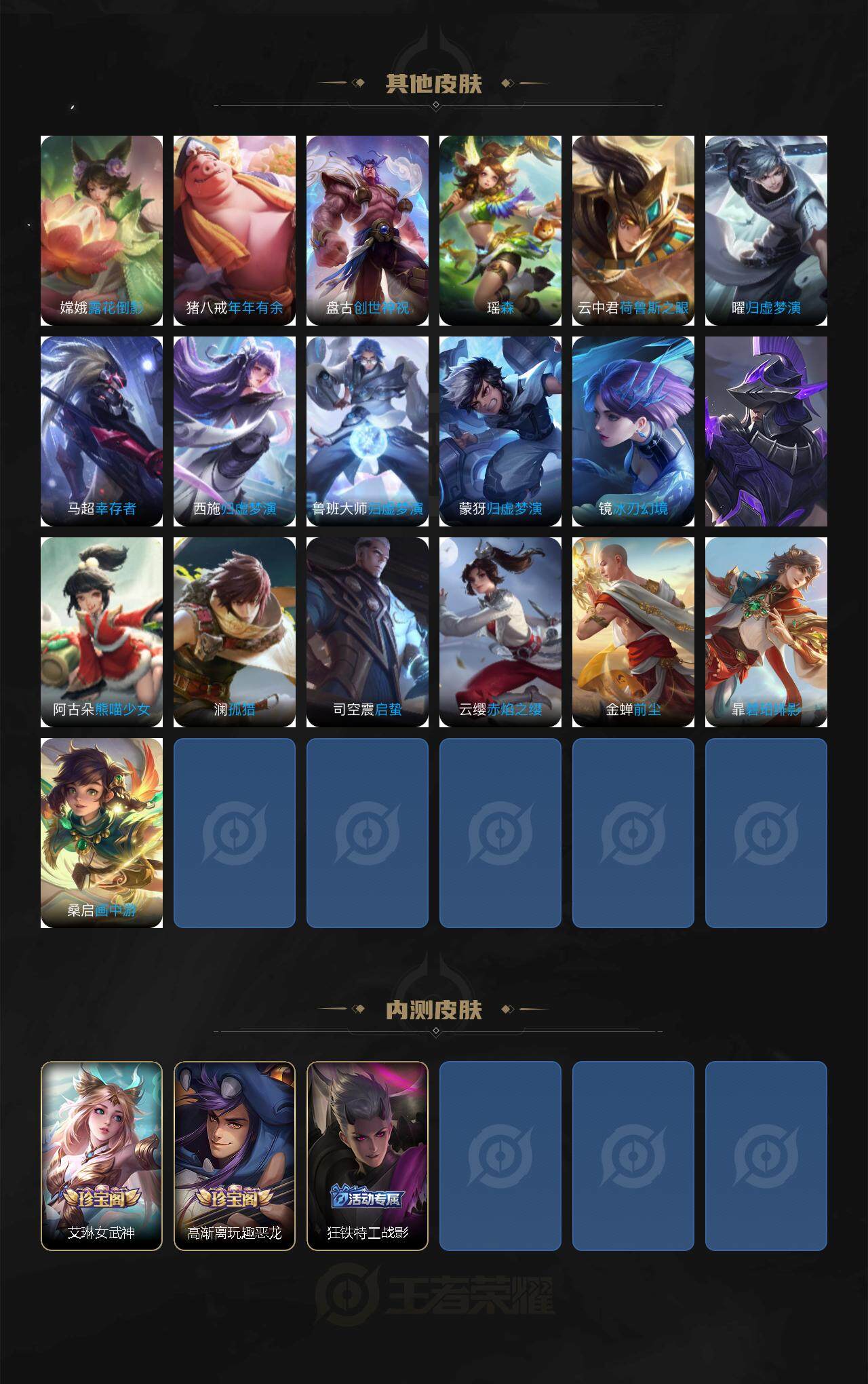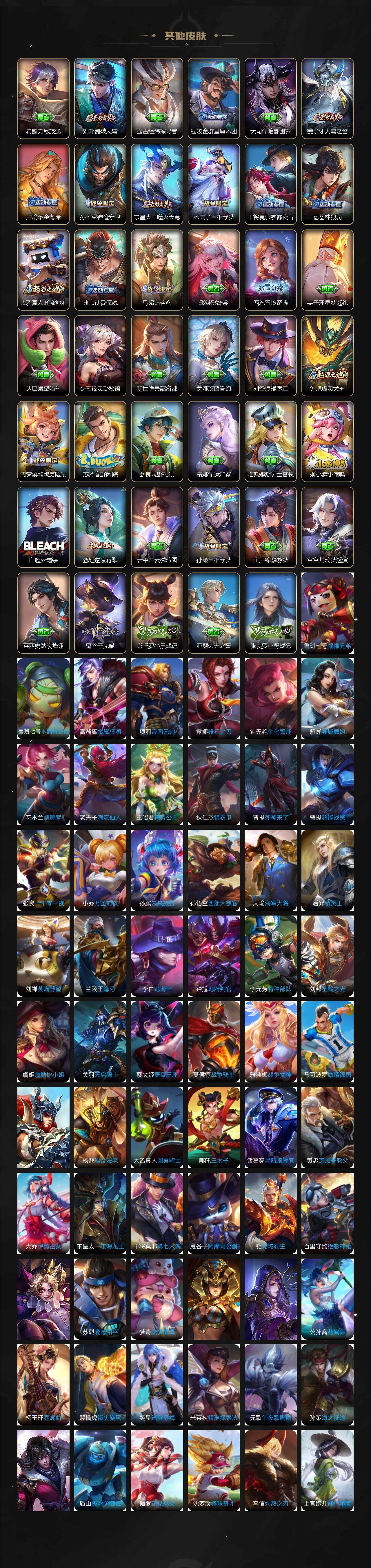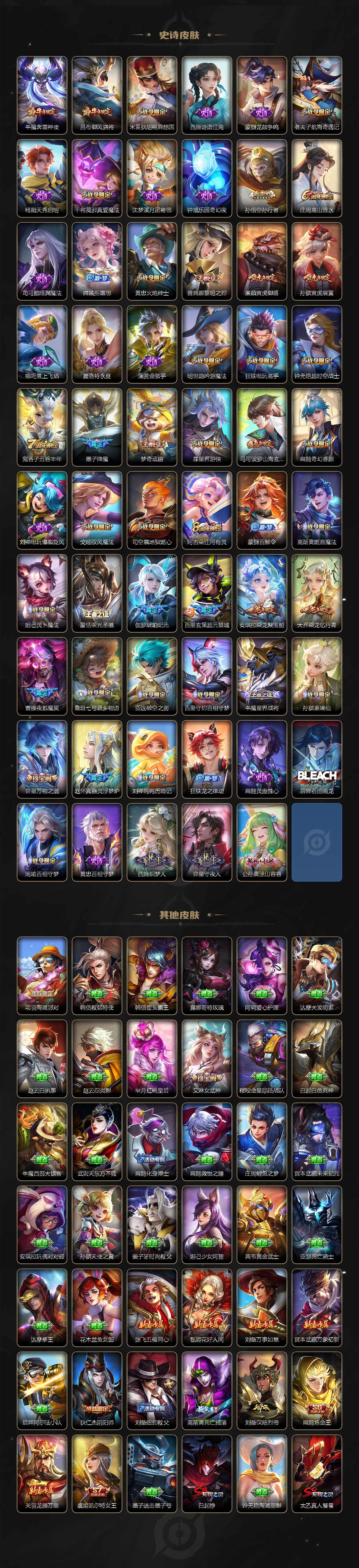 扁鹊炼金王,虞姬凯尔特女王,白起狰,太乙真人饕餮,曹操烛龙,芈月重明,典韦穷奇,狂铁御狮,米莱狄御霄,牛魔御旌,盾山御銮,夏侯惇朔风刀,明世隐疑决卦,老夫子醍醐杖,鬼谷子原初探秘者,狄仁杰万华元夜,程咬金演武夺筹,钟馗驱傩正仪,苏烈千军破阵,吕布猎兽之王,女娲朔望之晖,典韦蓝屏警告,钟馗神迹守卫,鲁班七号狮舞东方,沈梦溪星空之诺,李元芳银河之约,刘邦夺宝奇兵,马可波罗暗影游猎,蒙犽狂想玩偶喵,元歌云间偶戏,弈星混沌棋,达摩沙漠行僧,兰陵王金庭之子,沈梦溪大漠名商,李元芳云中旅人,桑启海盐诗旅,裴擒虎擒涛扼浪,鲁班大师探海日志,张良古海寻踪