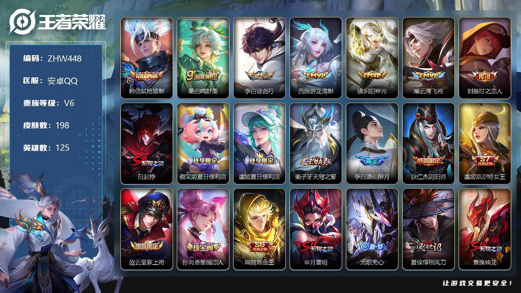 [12450536]【商品标题】:安卓Q-V6-永恒钻石III段位-125英雄-198皮肤-1典藏-0珍品无双-0无双-0珍品传说-6传说-59史诗 【荣耀典藏】:韩信弑枪猎影 【传说皮肤】:桑启鸣野蒿,李白诗剑行,西施游龙清影,镜炽阳神光,曜云鹰飞将,刘备时之恋人 【限定皮肤】:白起狰,蔡文姬夏日便利店,虞姬夏日便利店,姜子牙天穹之誓,李白谪仙醉月,狄仁杰阴阳师,虞姬凯尔特女王,赵云皇家上将,孙尚香蔷薇恋人,扁鹊炼金王,芈月重明,元歌无心,夏侯惇朔风刀,曹操烛龙,典韦穷奇,狄仁杰魔术师,狄仁杰万华元夜,达摩沙漠行僧,项羽海滩派对,老夫子醍醐杖,王昭君午后时光,兰陵王金庭之子,花木兰瑞麟志,孙悟空孙行者,牛魔御旌,李元芳云中旅人,钟馗驱傩正仪,干将莫邪胡桃夹子,雅典娜黎明之约,蔡文姬繁星吟游,鬼谷子原初探秘者,鬼谷子五谷丰年,苏烈千军破阵,百里玄策原初追逐者,弈星混沌棋,梦奇顽趣,沈梦溪大漠名商,明世隐疑决卦,裴擒虎擒涛扼浪,狂铁御狮,狂铁电玩高手,米莱狄御霄,云中君纤云弄巧,盾山御銮,嫦娥拒霜思,嫦娥暖冬兔眠,西施玲珑珍味,鲁班大师探海日志,桑启海盐诗旅,暃星界游侠,戈娅驭风魔法,张良古海寻踪,蒙恬荣光圣徽,鬼谷子天穹祈灯,刘邦剑破天穹,周瑜熔金海岸 【年限皮肤】:花木兰瑞麟志,马超神威 【赛季限定】:扁鹊炼金王,白起狰,芈月重明,夏侯惇朔风刀,曹操烛龙,典韦穷奇,狄仁杰万华元夜,达摩沙漠行僧,老夫子醍醐杖,兰陵王金庭之子,张良古海寻踪,牛魔御旌,李元芳云中旅人,虞姬凯尔特女王,钟馗驱傩正仪,雅典娜黎明之约,鬼谷子原初探秘者,苏烈千军破阵,百里玄策原初追逐者,弈星混沌棋,梦奇顽趣,沈梦溪大漠名商,明世隐疑决卦,裴擒虎擒涛扼浪,狂铁御狮,米莱狄御霄,盾山御銮,鲁班大师探海日志,桑启海盐诗旅,鬼谷子天穹祈灯,蒙恬荣光圣徽,刘邦剑破天穹,姜子牙天穹之誓 【战令限定】:蔡文姬夏日便利店,虞姬夏日便利店,王昭君午后时光,狂铁电玩高手,嫦娥暖冬兔眠,西施玲珑珍味,暃星界游侠,戈娅驭风魔法 【史诗皮肤】:鲁班七号电玩小子,赵云皇家上将,赵云未来纪元,貂蝉圣诞恋歌,甄姬冰雪圆舞曲,狄仁杰魔术师,宫本武藏鬼剑武藏,孙尚香蔷薇恋人,孙尚香水果甜心,嬴政摇滚巨星,妲己魅力维加斯,墨子金属风暴,吕布圣诞狂欢,曹操幽灵船长,吕布末日机甲,张飞乱世虎臣,花木兰水晶猎龙者,刘邦德古拉伯爵,夏侯惇乘风破浪,小乔缤