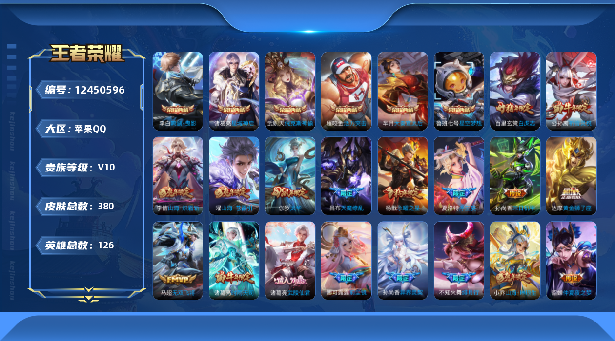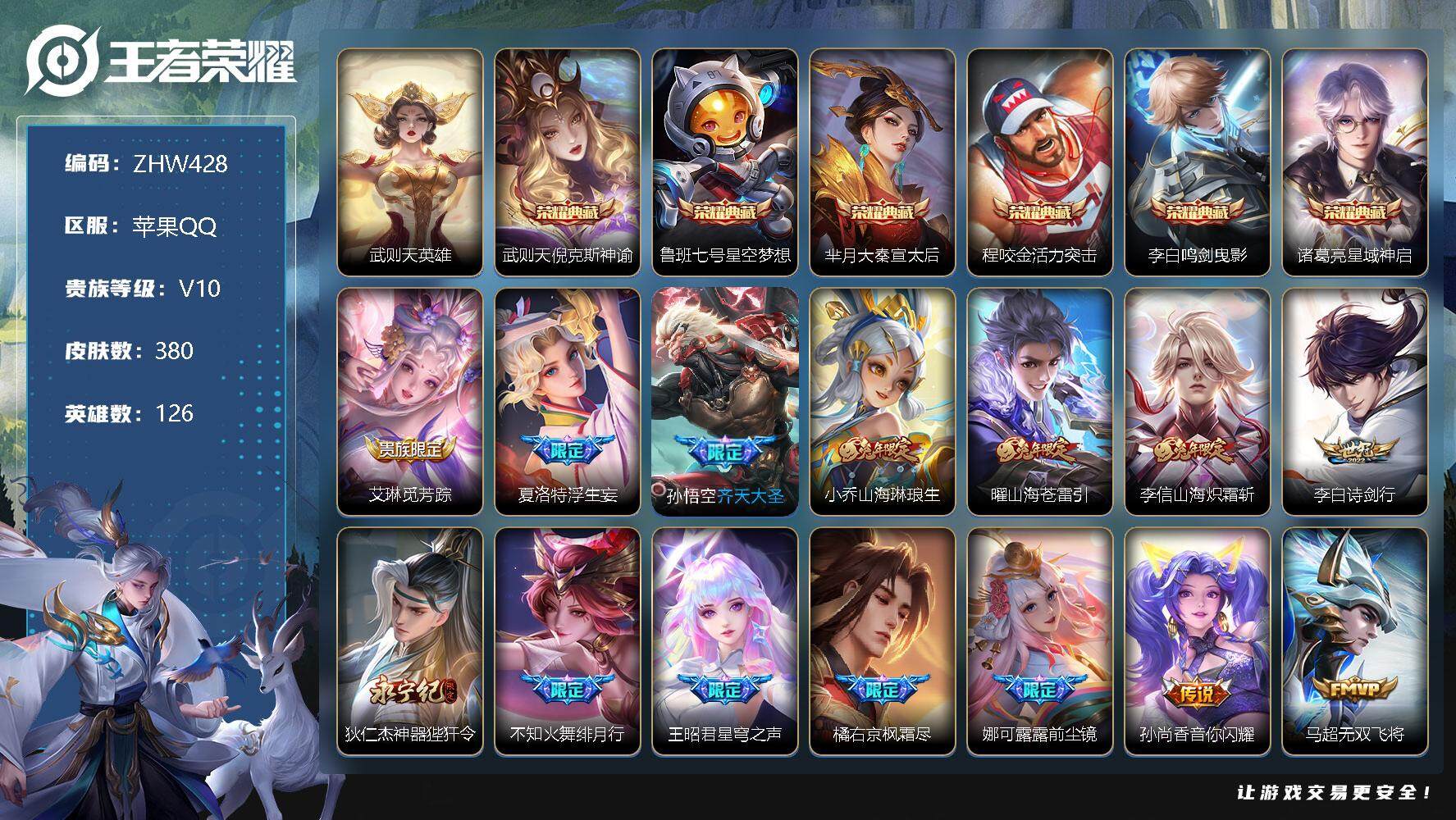- [11579102]V8 2典藏 10传说 122英雄 237皮肤 典藏英雄武则天 可修改实名 荣耀水晶:鸣剑·曳影,全息碎影(猴子典藏) 传说皮:黄金射手座,地狱火,末日机甲-孙尚香(绿蚂蚱),云霓雀翎,一念神魔,冠军飞将,超时空战士-狄仁杰 珍宝阁皮:女武神 限定皮:鸣野蒿,白虎志(电光耗子),天狼狩猎者,玄武志(苏烈年限),朱雀志(守约年限),圣诞老人,孙行者,一生所爱,引擎之心,冰霜恋舞曲 史诗皮:星界战将,芈月浮光幕影,决胜骁骑,蔬乡物语(鲁班七号),琥珀纪元伽罗,苍穹之光,电玩小子(小书包),白龙吟,黄金分割率,特工魅影,千年之狐,高渐离燃音魔法,冰冠公主,偶像歌手,魅语,猫狗日记-孙策,猫狗日记-大乔,乱世虎臣,节奏热浪,水果甜心,天才门将,星夜王子,心灵骇客,功夫厨神,德古拉伯爵,暗隐猎兽者,幽灵船长,鬼剑武藏,心灵战警,舞动绿茵,地狱岩魂,纤云弄巧,繁星吟游(呼啦呼啦),缤纷独角兽,乘风破浪,逐浪之夏,月团寄思,水晶猎龙者,曙光守护者,唤灵魅影,金属风暴,圣诞狂欢,圣诞恋歌,鹰眼统帅,魅力维加斯,黎明之约