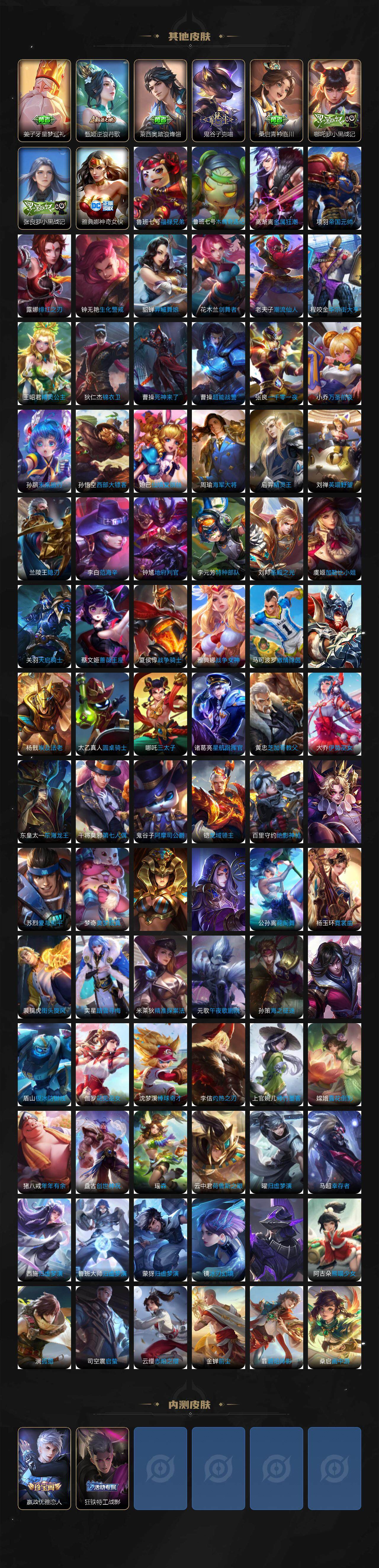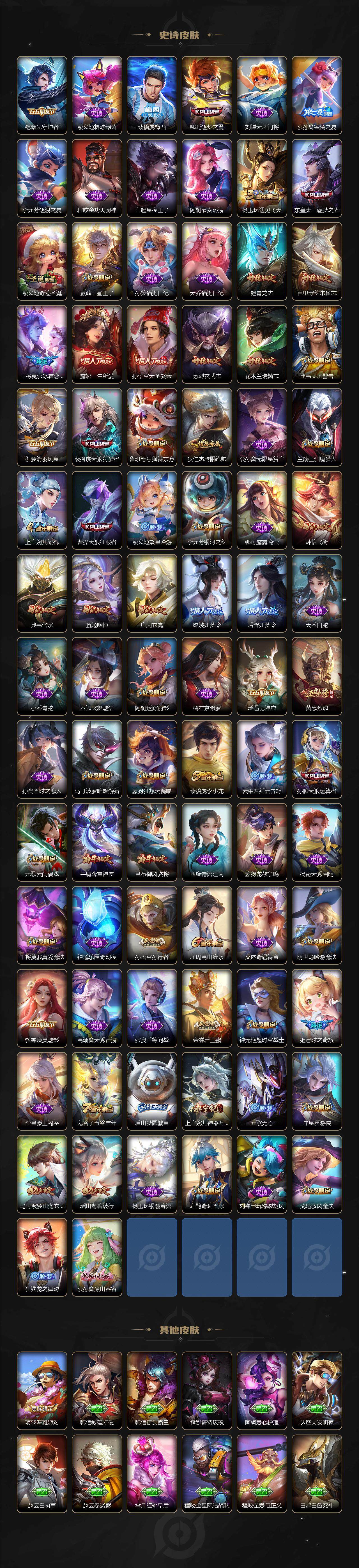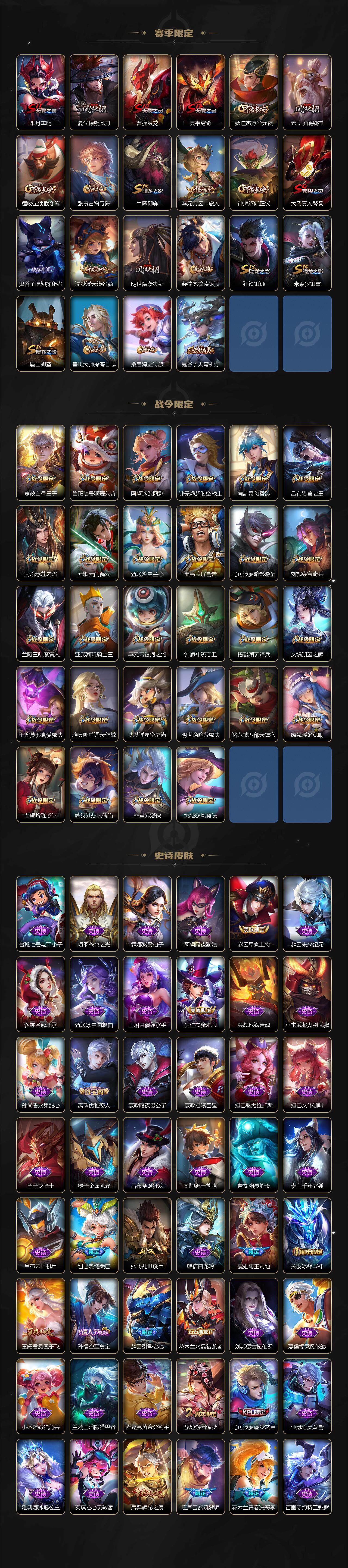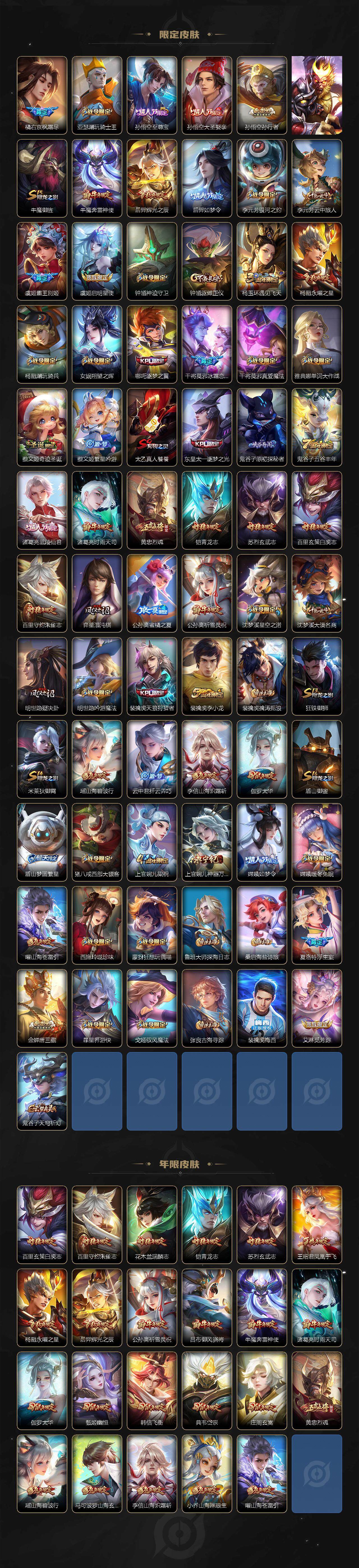 【限定皮肤】:狄仁杰阴阳师,小乔山海琳琅生,赵云皇家上将,赵云引擎之心,妲己热情桑巴,妲己时之奇旅,嬴政优雅恋人,嬴政白昼王子,孙尚香异界灵契,鲁班七号狮舞东方,庄周云端筑梦师,庄周玄嵩,庄周高山流水,阿轲迷踪丽影,钟无艳超时空战士,孙膑天狼运算者,扁鹊奇幻香踪,芈月重明,吕布天魔缭乱,吕布猎兽之王,吕布御风骁将,周瑜赤莲之焰,元歌云间偶戏,元歌无心,夏侯惇朔风刀,甄姬幽恒,甄姬游园惊梦,甄姬落雪兰心,曹操烛龙,曹操天狼征服者,典韦穷奇,典韦蓝屏警告,典韦岱宗,马可波罗逐梦之星,马可波罗暗影游猎,马可波罗山海玄木吟,狄仁杰魔术师,狄仁杰万华元夜,狄仁杰神器狴犴令,项羽海滩派对,老夫子醍醐杖,关羽冰锋战神,貂蝉遇见胡旋,程咬金演武夺筹,露娜一生所爱,刘邦夺宝奇兵,韩信飞衡,王昭君凤凰于飞,王昭君星穹之声,兰陵王驯魔猎人,花木兰青春决赛季,花木兰瑞麟志,不知火舞绯月行,娜可露露前尘镜,橘右京枫霜尽,亚瑟潮玩骑士王,孙悟空至尊宝,孙悟空大圣娶亲,孙悟空孙行者,孙悟空齐天大圣,牛魔御旌,牛魔奔雷神使,后羿辉光之辰,后羿如梦令,李元芳银河之约,李元芳云中旅人,虞姬霸王别姬,虞姬启明星使,钟馗神迹守卫,钟馗驱傩正仪,杨玉环遇见飞天,杨戬永曜之星,杨戬潮玩骑兵,女娲朔望之晖,哪吒逐梦之翼,干将莫邪冰霜恋舞曲,干将莫邪真爱魔