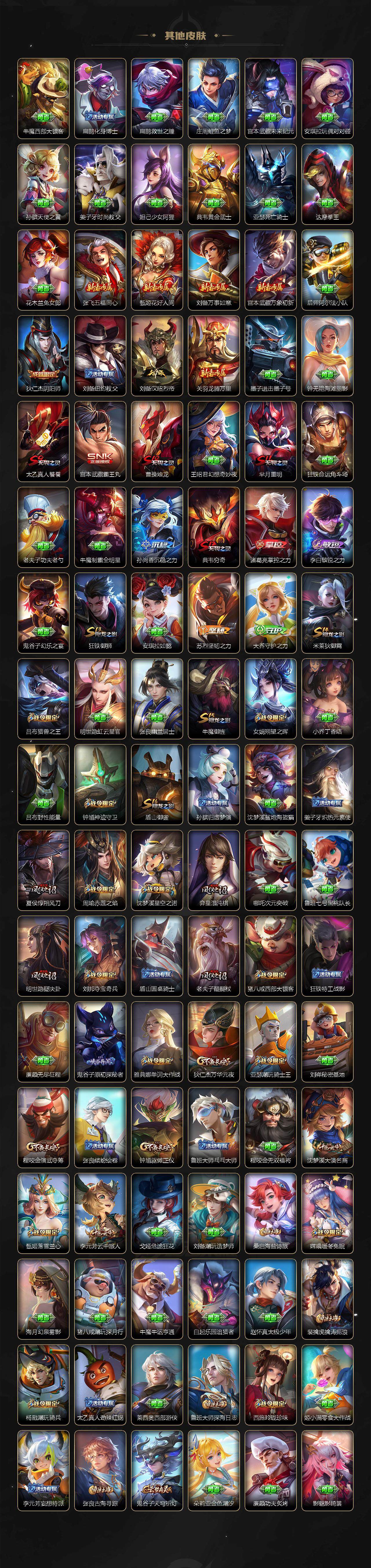 小乔青蛇,大乔白蛇,瑶遇见神鹿,娜可露露晚萤,伽罗箭羽风息,李元芳逐浪之夏,不知火舞魅语,公孙离无限星赏官,大乔猫狗日记,孙策猫狗日记,阿轲节奏热浪,露娜紫霞仙子,诸葛亮黄金分割率,王昭君偶像歌手,韩信白龙吟,项羽苍穹之光,孙尚香时之恋人,阿轲暗夜猫娘,雅典娜冰冠公主,吕布末日机甲,鲁班七号电玩小子,蒙犽龙鼓争鸣,橘右京修罗,墨子龙骑士,嬴政摇滚巨星,刘禅绅士熊喵,刘禅天才门将,白起星夜王子,安琪拉心灵骇客,程咬金功夫厨神,刘邦德古拉伯爵,兰陵王暗隐猎兽者,曹操幽灵船长,宫本武藏鬼剑武藏,亚瑟心灵战警,钟馗乐园奇幻夜,杨戬天秀·启明,蔡文姬舞动绿茵,廉颇地狱岩魂,西施诗语江南,小乔缤纷独角兽,夏侯惇乘风破浪,花木兰水晶猎龙者,铠曙光守护者,墨子金属风暴,吕布圣诞狂欢,貂蝉圣诞恋歌,百里守约特工魅影,嬴政暗夜贵公子,李白千年之狐,艾琳奇遇舞章,貂蝉唤灵魅影,高渐离天秀·音浪,张良千筹问战,弈星滕王阁序,杨玉环银翎春语,刘禅电玩·爆裂旋风