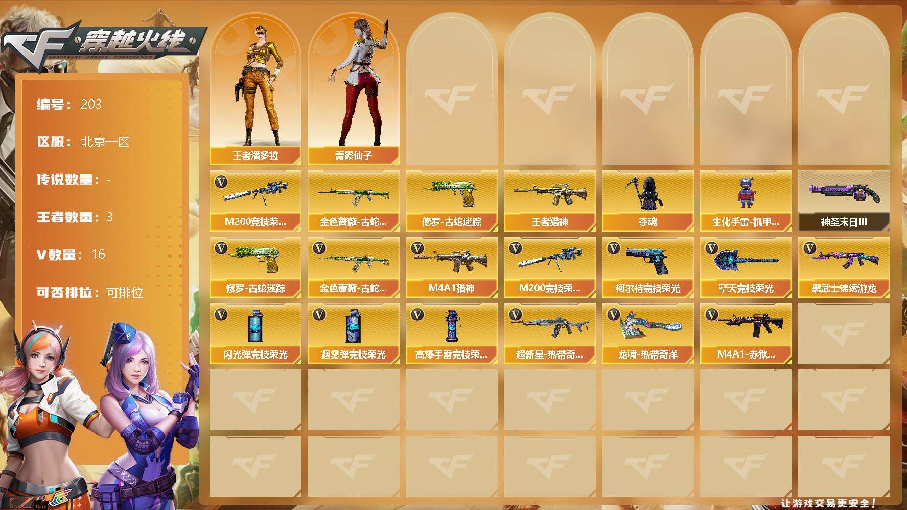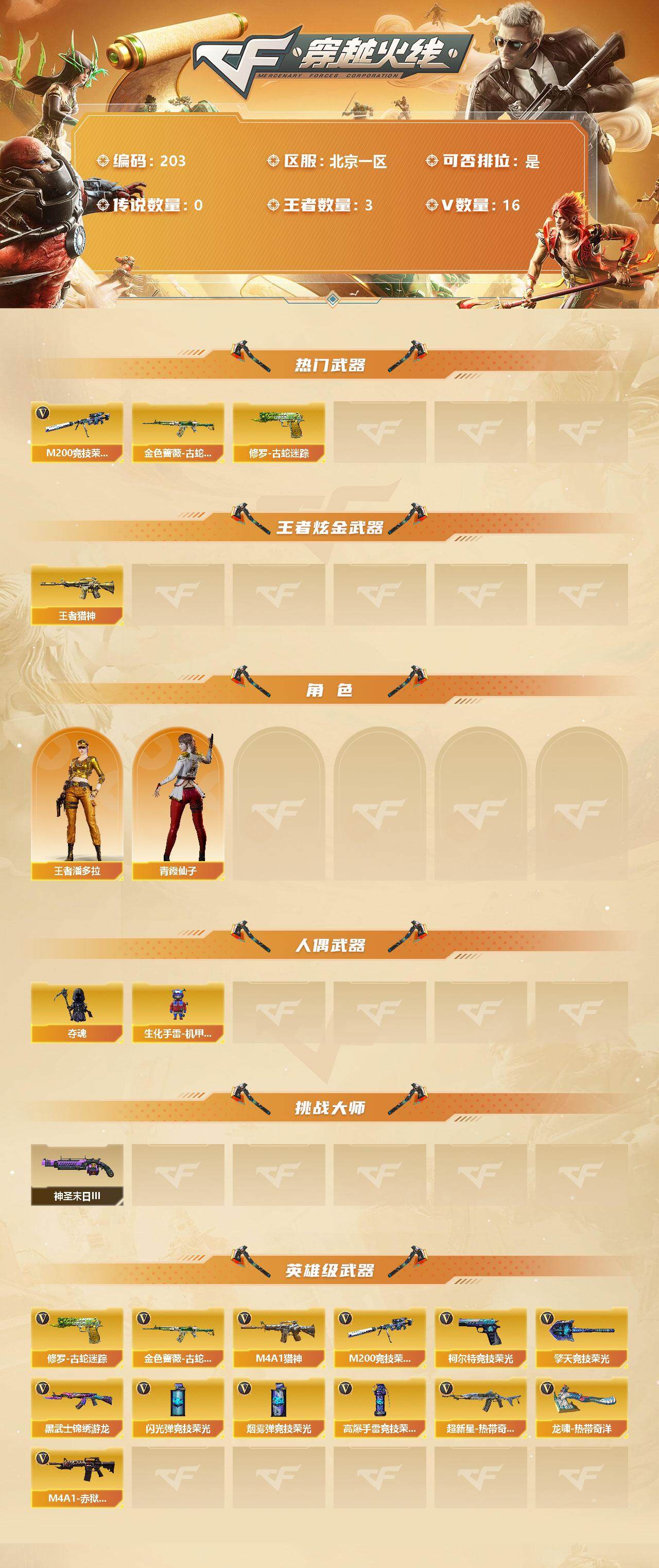 [12451444]【203】16V/77级/将帅/3王者/金色蔷薇-古蛇迷踪/修罗-古蛇迷踪/M200-竞技荣光/王者猎神/王者潘多拉/青霞仙子/夺魂/生化手雷-机甲核心/神圣爆裂者-末日/柯尔特-竞技荣光/擎天-竞技荣光/高爆手雷-竞技荣光/烟雾弹-竞技荣光/闪光弹-竞技荣光/M4A1-猎神/AK47-黑武士-锦绣游龙/超新星-热带奇洋/M4A1-赤狱骑士/龙啸-热带奇洋