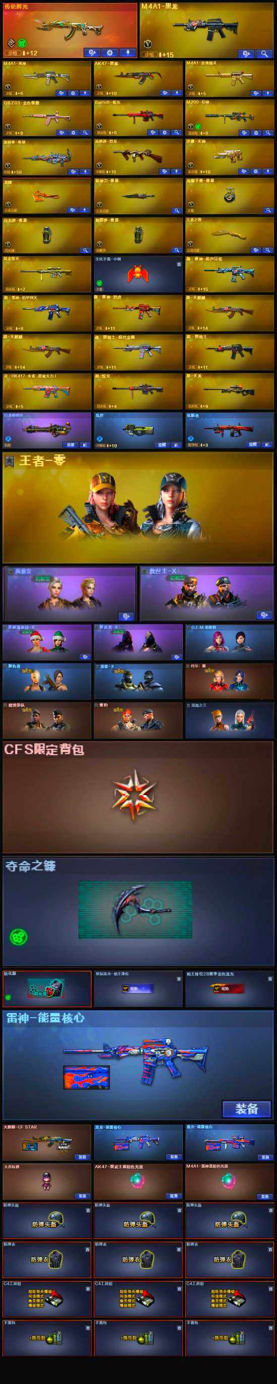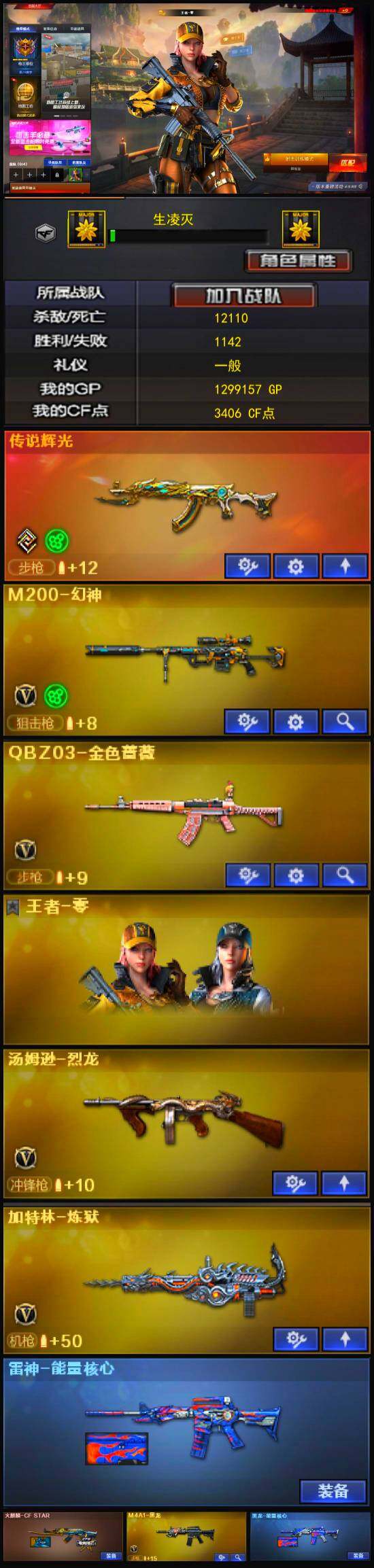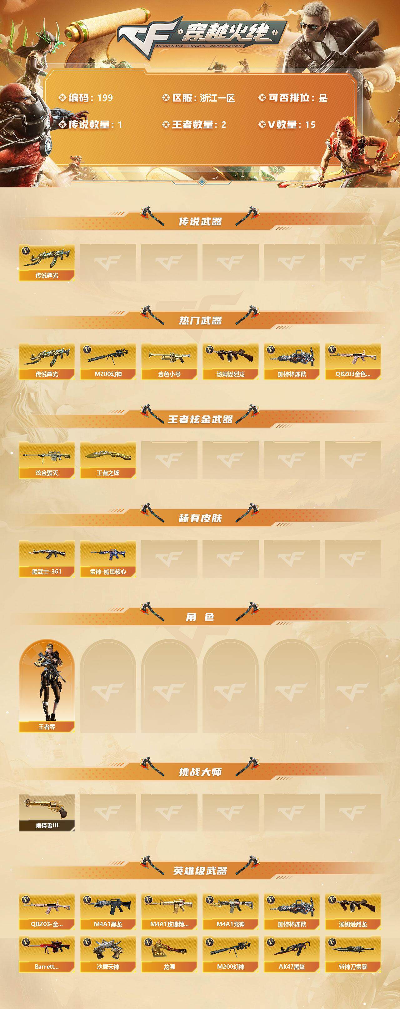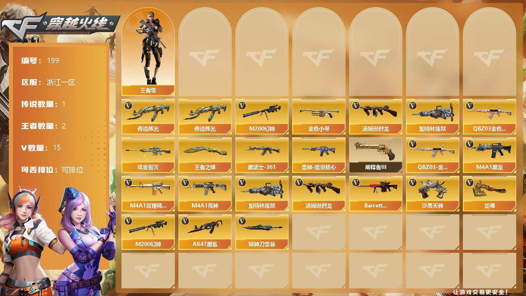 [12451477]【199】15V/57级/校官/1传说/2王者/1炫金/传说辉光/QBZ03-金色蔷薇/M200-幻神/金色小号/汤姆逊-烈龙/加特林-炼狱/炫金毁灭/王者之锋/雷神-能量核心/AK47-黑武士-361/王者-零/阐释者/斩神刀-雷暴/M4A1-黑龙/M4A1-玫瑰精灵/M4A1-死神/Barrett-极光/AK47-黑鲨/沙鹰-天神/龙啸