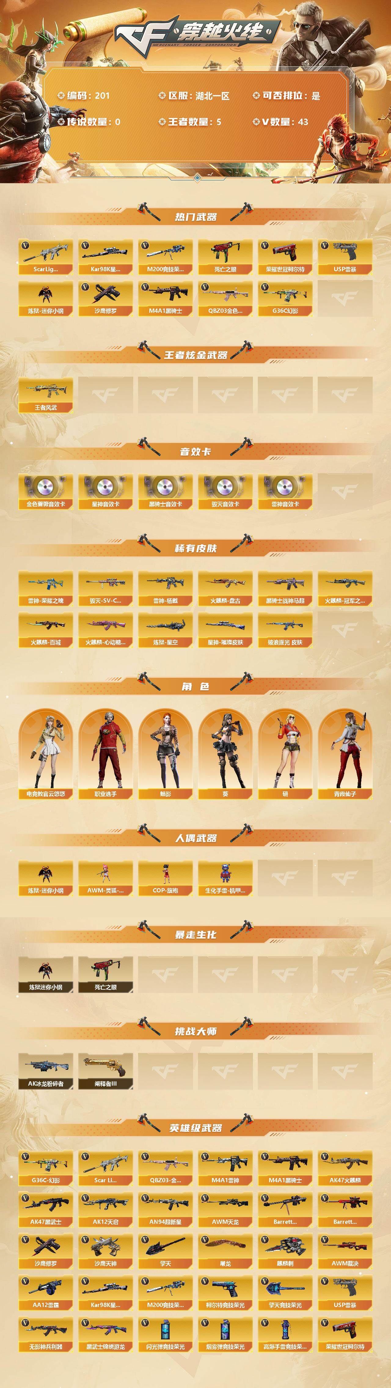 [12451513]【201】39V/101级/大元首/5王者/4英雄/G36C-幻影/QBZ03-金色蔷薇/Scar Light-白虎/M200-竞技荣光/死亡之眼/柯尔特-荣耀世冠/Kar98k-星神/炼狱-迷你小钢/M4A1-黑骑士/USP雷暴/沙鹰-修罗/王者风武/M4A1-雷神音效卡/M4A1-黑骑士音效卡/Barrett-毁灭音效卡/金色蔷薇音效卡/星神音效卡/星神-璀璨皮肤/金色蔷薇-破浪逐光/雷神荣耀之魄/雷神-杨戬/火麒麟-冠军之心/火麒麟-盘古/火麒麟-百城/火麒麟-心动糖果/黑骑士-战神马超/炼狱-星空/毁灭-CFPLS16皮肤/葵/魅影/电竞教官-云悠悠/研/职业选手/青霞仙子/AWM-灵狐-15周年嘉年华/COP-旗袍/生化手雷-机甲核心/阐释者/AK47-冰龙粉碎者/柯尔特-竞技荣光/擎天-竞技荣光/高爆手雷-竞技荣光/烟雾弹-竞技荣光/闪光弹-竞技荣光/荣耀世冠-柯尔特/无影-神兵利器/M4A1-雷神/AK47-火麒麟/AK47-黑武士/AK12-天启/AN94-超新星/AWM-天龙/Barrett-毁灭/Barrett-极光/AWM-裁决/AA-12-雷霆/AK47-黑武士-锦绣游龙/沙鹰-天神/麒麟刺/擎天/屠龙