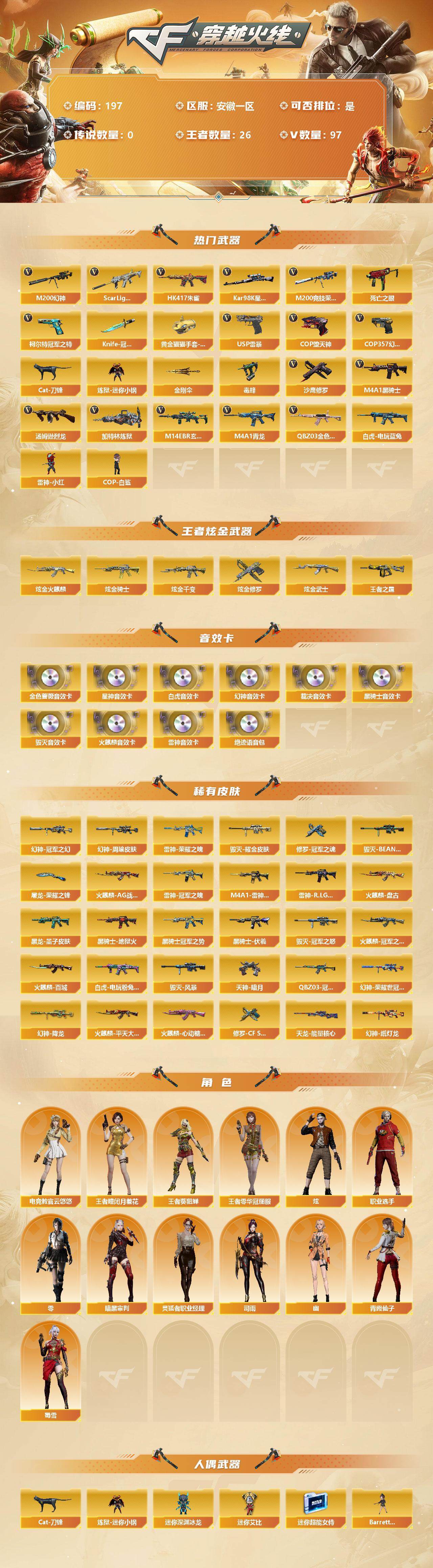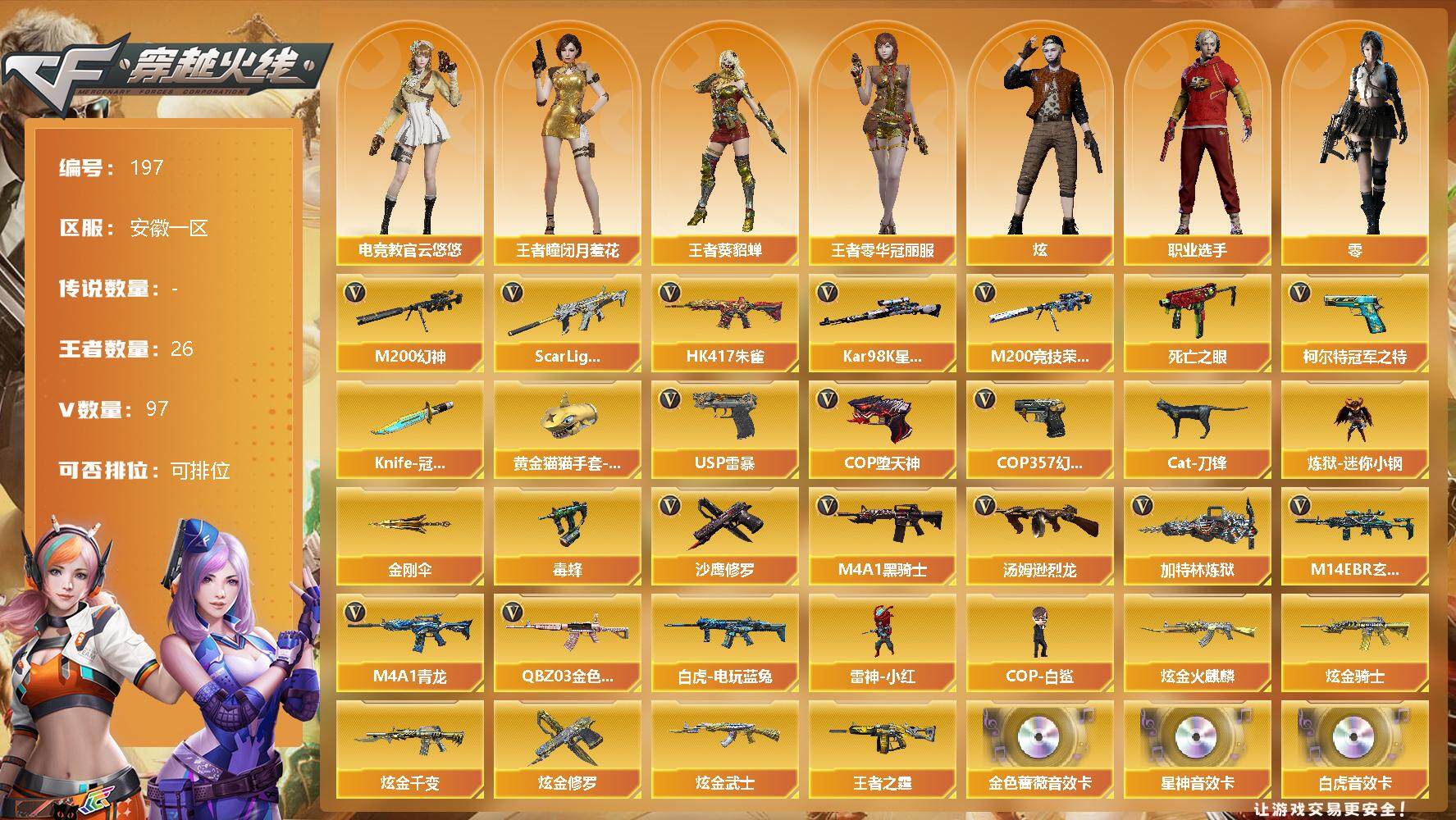 [12451531]【197】93V/100级/元帅/26王者/5炫金/4英雄/QBZ03-金色蔷薇/M14EBR-玄武/Scar Light-白虎/HK417-朱雀/M4A1青龙/M200-幻神/M200-竞技荣光/死亡之眼/白虎-电玩蓝兔/柯尔特-冠军之特/Kar98k-星神/Cat-刀锋/炼狱-迷你小钢/毒蜂/M4A1-黑骑士/汤姆逊-烈龙/加特林-炼狱/雷神-小红/COP-白鲨/USP雷暴/COP-堕天神/COP 357-幻灵/沙鹰-修罗/Knife-冠军之刃/黄金猫猫手套-白鲨/金刚伞/炫金火麒麟/炫金黑骑士/炫金千变/炫金修罗/炫金黑武士/王者之霆/M200-幻神音效卡/AK47-火麒麟音效卡/M4A1-雷神音效卡/M4A1-黑骑士音效卡/Barrett-毁灭音效卡/金色蔷薇音效卡/AWM-裁决音效卡/白虎音效卡/星神音效卡/绝迹语音包/幻神周瑜/幻神冠军之幻/幻神降龙/M200-幻神-荣耀世冠白鲨/幻神-纸灯龙皮肤/白虎-电玩粉兔/QBZ03冠军之薇/雷神荣耀之魄/M4A1-雷神CFS 2019/雷神冠军之魄/雷神-R.LGD-CFPLS18冠军/火麒麟-AG战队皮肤/火麒麟-冠军之心/火麒麟-平天大圣/火麒麟-盘古/火麒麟-百城/火麒麟-心动糖果/黑骑士-冠军之势/黑骑士-地狱火/黑骑士-伏羲/黑龙-墨子皮肤/毁灭耀金皮肤/毁灭-冠军之怒/毁灭-BEAN-2020MVP/毁灭-风暴/天龙-能量核心/沙鹰-修罗-CF STAR/修罗-冠军之魂/天神-暗月/屠龙-荣耀之锋/王者-瞳-闭月羞花/王者-零-华冠丽服/王者-葵-貂蝉/灵狐者-职业经理/零/炫/幽/电竞教官-云悠悠/司雨/蜀雪/职业选手/暗黑审判/青霞仙子/Barrett-夜玫瑰/巴雷特-零-水下丽影/王者Barrett-英勇金戈/AWM-灵狐-15周年嘉年华/海滩汪汪-巴雷特/迷你深渊冰龙/迷你艾比/迷你超能女侍/迷你裂空之翼/夺魂/迷你牛牛/迷你生化手雷/灵狐娃娃手雷/深渊终结者手雷/闪光弹-貂蝉/高爆手雷-大乔/黑龙吞噬者/双面神/超级对讲机/机甲撕裂者/神圣爆裂者-末日/试炼破坏者/激光毁灭者/激光毁灭者III-白马银枪/冰龙粉碎者-白马银枪/柯尔特-竞技荣光/擎天-竞技荣光/高爆手雷-竞技荣光/烟雾弹-竞技荣光/闪光弹-竞技荣光/幻灵之锋/麒麟刺-堕天神/龙啸-堕天神/M4A1-武圣/Glock18-武