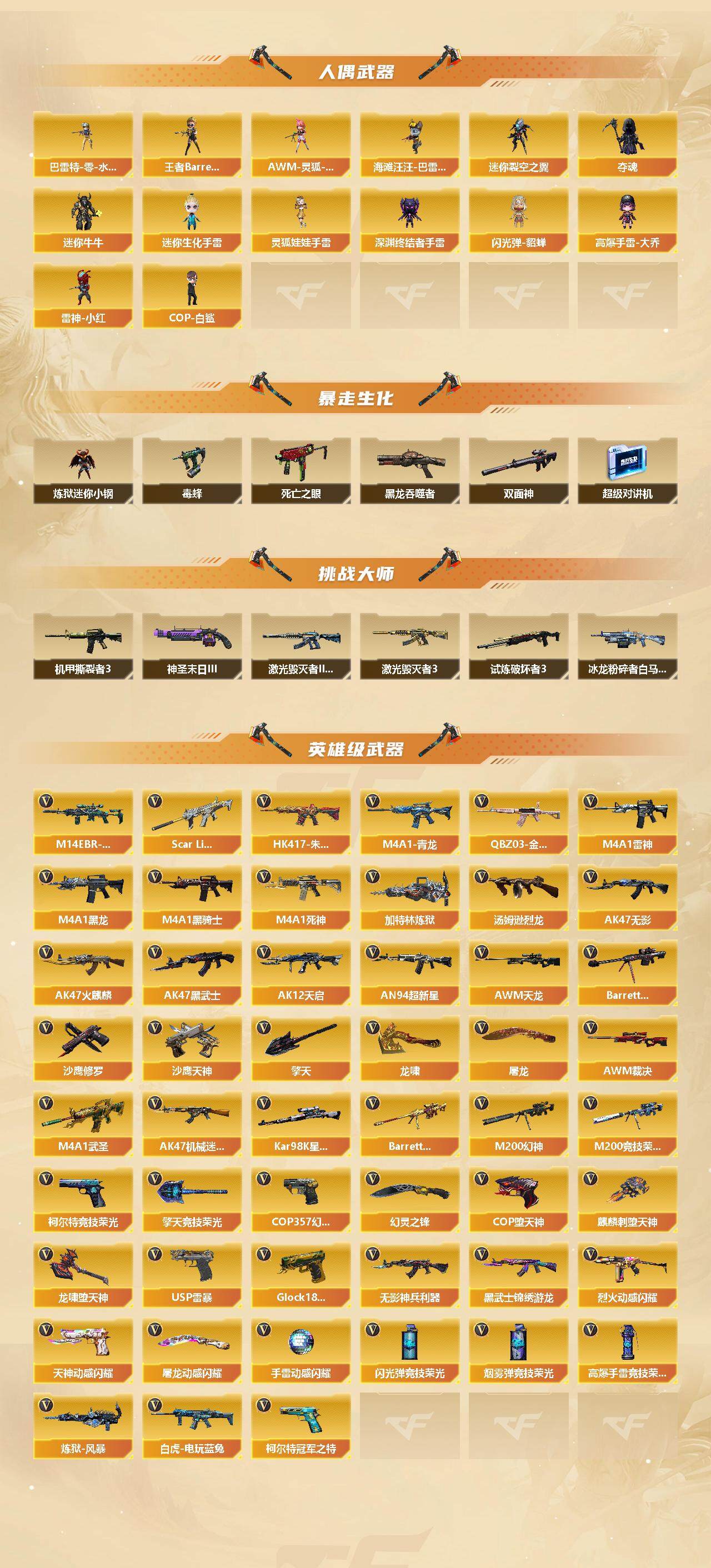 - [11977182]近战武器皮肤: 军刀-合金突袭,剥皮小刀,机动狂飙战刀,紫金爪刀,黑波之刃,超能偶像 应援棒,爪刀-RGX 11z Pro 3.0,匕首-超限闪存,荒土机兵热能刀,阿特拉斯指挥部 步枪皮肤: 狂徒-紫阙金琅,狂徒-盖亚的复仇,幻影-侦察力量,獠犬-归零者,戍卫-天界神兵,狂徒-堕天遗武,幻影-离子武器,狂徒-艾沃莉的梦之翼,狂徒-混沌序曲,狂徒-掠影 佩枪皮肤: 标配-紫阙金琅,正义-千灵华绽 狙击枪皮肤: 飞将-塑水宗,冥驹-堕天遗武 冲锋枪皮肤: 骇灵-艾沃莉的梦之翼 霰弹枪皮肤: 雄鹿-紫阙金琅2.0,判官-全息波普 机枪皮肤: 战神-奇点