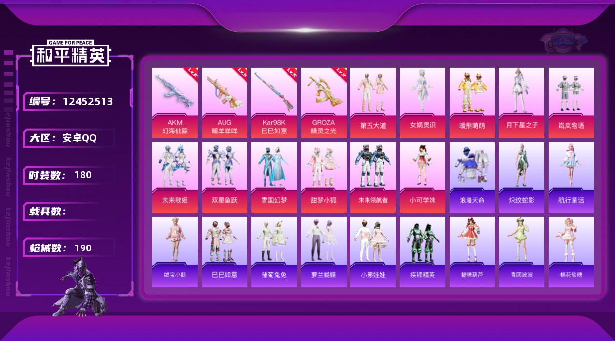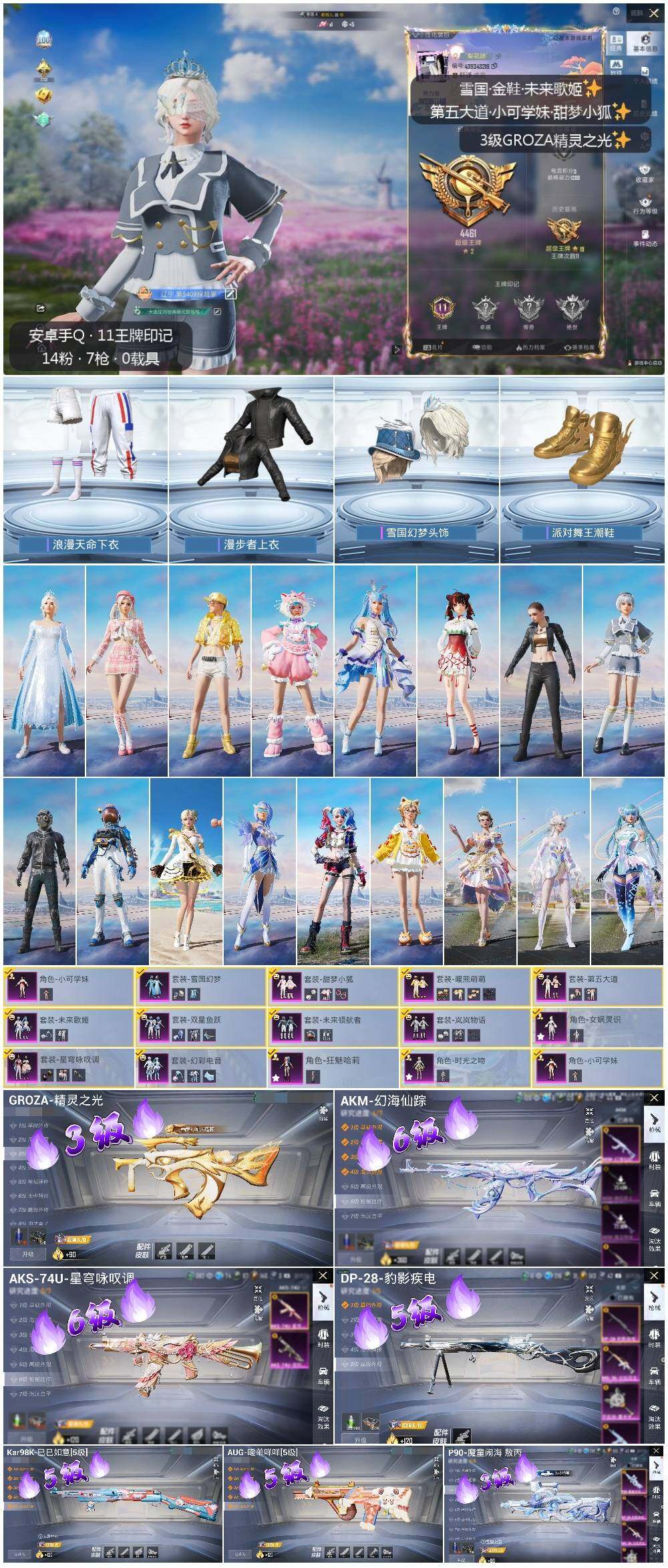 - PX_2065432- 安卓手Q-9王牌印记-3粉装-5特效枪-3载具-33361热力值-57套装-107枪皮-1卓越印记-0传奇印记 【3粉装】,冷漠罗丽,时空协奏·回响,炫光之旅 【5特效枪】GROZA-旋转彩虹-7级 AUG-暖羊咩咩-5级 Kar98K-巳巳如意-5级 MK12-雪月幻音-4级 破片手榴弹-瓶中星球-6级 【2稀有紫装】,胖达团团,龟仙人, 【3稀有载具】,路特斯ELET