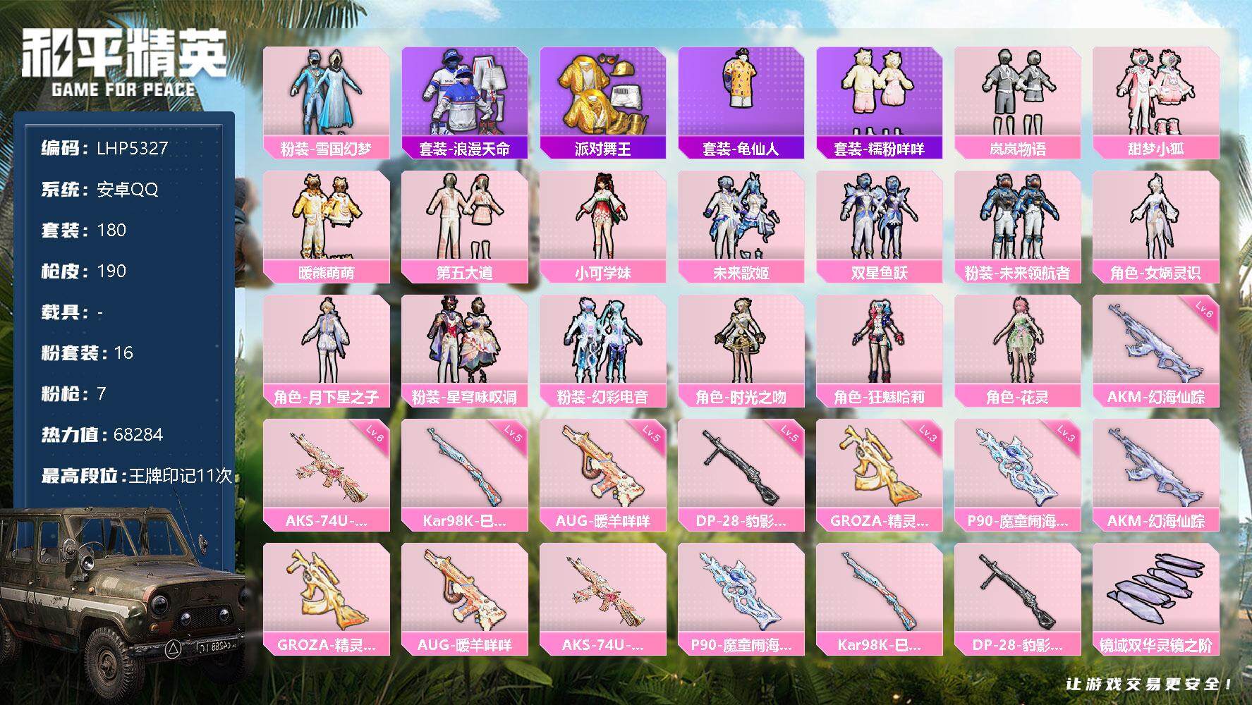 [12452513]地铁满天赋【特价急出/详情看图】:安卓 手Q-16粉装-7特效枪-9粉色飞行器-6.8w热力值-11王牌印记-180套装-190枪皮【热门品类】:粉装-雪国幻梦,套装-浪漫天命,套装-派对舞王,套装-龟仙人,套装-糯粉咩咩【粉色套装】:粉装-雪国幻梦,粉装-岚岚物语,粉装-甜梦小狐,粉装-暖熊萌萌,粉装-第五大道,角色-小可学妹,粉装-未来歌姬,粉装-双星鱼跃,粉装-未来领航者,角色-女娲灵识,角色-月下星之子,粉装-星穹咏叹调,粉装-幻彩电音,角色-时光之吻,角色-狂魅哈莉,角色-花灵【粉色枪皮等级】:AKM-幻海仙踪(六级),GROZA-精灵之光(三级),AUG-暖羊咩咩(五级),AKS-74U-星穹咏叹调(六级),P90-魔童闹海 敖丙(三级),Kar98K-巳巳如意(五级),DP-28-豹影疾电(五级)【粉色飞行器】:镜域双华-灵镜之阶,龙翔九天飞行器,幻海精灵飞行器,月下星之子飞行器,戏水时光飞行器,圣域金龙飞行器,时光之吻飞行器,灵珠游龙飞行器