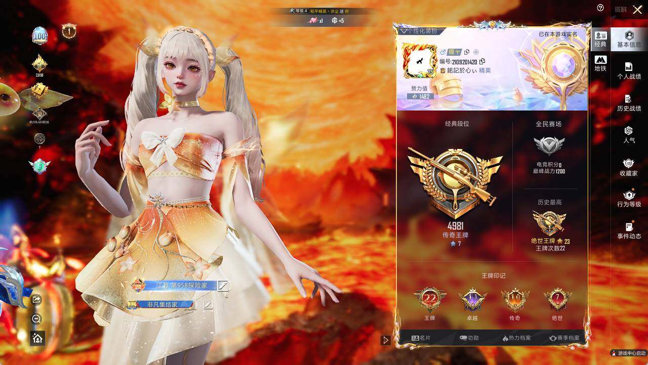 - PX_2095093-实名: 可修改 贵族等级: V7 英雄数: 123 皮肤数: 205 荣耀水晶: 星域神启,银白咏叹调 传说皮: 黄金射手座,绛天战甲,地狱火,地狱之眼,末日机甲-孙策,山海·炽霜斩,电玩·雷克斯 限定皮: 李小龙,游园惊梦,梁祝,神威,飞衡,高山流水,孙行者,五谷丰年,神器·万象笔,山海·玄木吟,冰霜神祇,齐天大圣