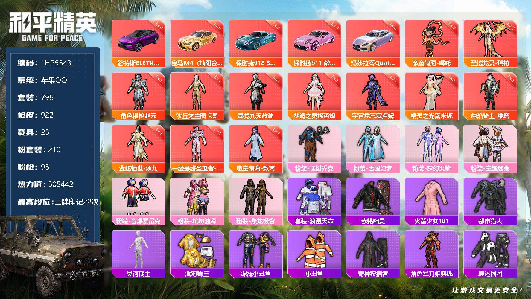 [12452808]素材身法号/老101/老木乃伊/魔童闹海-哪吒(五级)/宝马M4(灿阳金)(六级)/保时捷918 Spyder(玺耀绿)(六级)/M416-至情至圣(九级)/M416-灵猫魔法师(九级)/SCAR-L-金蛇镇世(九级)/绝世印记7/扭蛋碎片1268/璀璨碎片1422/夺宝碎片781【特价急出/详情看图】:苹果 手Q-12神装-210粉装-95特效枪-25载具-65粉色飞行器-50.5w热力值-22王牌印记-796套装-922枪皮【红色载具】:路特斯ELETRE(电光紫)(六级),玛莎拉蒂Quattroporte(幻星粉)(二级),宝马M4(灿阳金)(六级),保时捷911 敞篷版(小暴龙)(三级),保时捷918 Spyder(玺耀绿)(六级)【红色神装等级】:魔童闹海-敖丙(一级),魔童闹海-哪吒(五级),最终圣卫者-帕修斯(一级),圣域龙灵-瑞拉(二级),金蛇镇世-烛九(一级),幽焰骑士-维塔(一级),精灵之光-露米娜(一级),宇宙意志-塞卢姆(一级),梦海之灵-妮芮妲(一级),墨龙九天-敖渊(一级),沙丘之主-图卡盟(一级),角色-银枪赵云(一级)【热门品类】:粉装-怪诞乔克,粉装-雪国幻梦,粉装-梦幻火箭,粉装-童趣迷兔,粉装-音爆索尼克,粉装-缤纷油彩,粉装-繁龙极客,套装-浪漫天命,套装-赤蝎幽灵,套装-火箭少女101,套装-都市猎人,套装-冥河战士,套装-派对舞王,套装-深海小丑鱼,套装-小丑鱼,套装-奇异狩猎者,角色-军刀雅典娜,套装-胖达团团,套装-胖达圆圆,套装-沙漠守护者,套装-忍者信条,套装-暗夜行者,套装-浪客战士,套装-动感兔斯基人偶服,角色-2B战斗服款,角色-2P战斗服款,套装-SS1特训,角色-忠猛周仓,角色-忠真马岱,角色-忠义严颜,套装-六号树人,套装-龟仙人,套装-潮萌小黄鸭,套装-暗影哥特,套装-浪漫波比,套装-粉红小猪,套装-摄影小熊猫,套装-红红火火,套装-雪团子,套装-软软马卡龙,角色-Mark.06,角色-六号稻草人,小丑红鼻头,大砍刀-青龙偃月刀,撬棍-龙胆亮银枪,套装-红熊茄茄【粉色载具】:特斯拉Roadster(沁心粉),兰博基尼Aventador SVJ(翡翠绿),阿斯顿马丁DBS(红),路特斯ELETRE(电光紫),玛莎拉蒂Quattroporte(幻星粉),仰望U9(赤霞丹朱),宝马M4(灿阳金),保时捷9