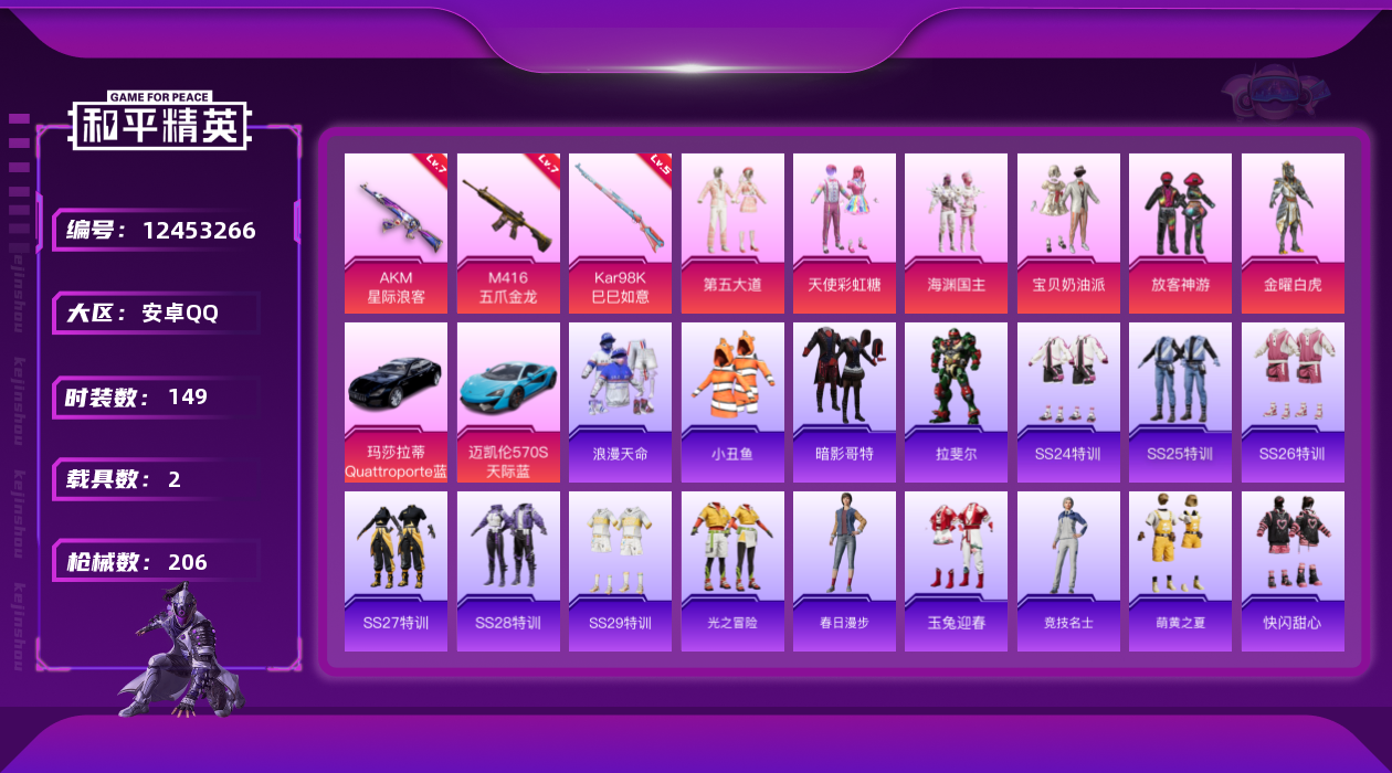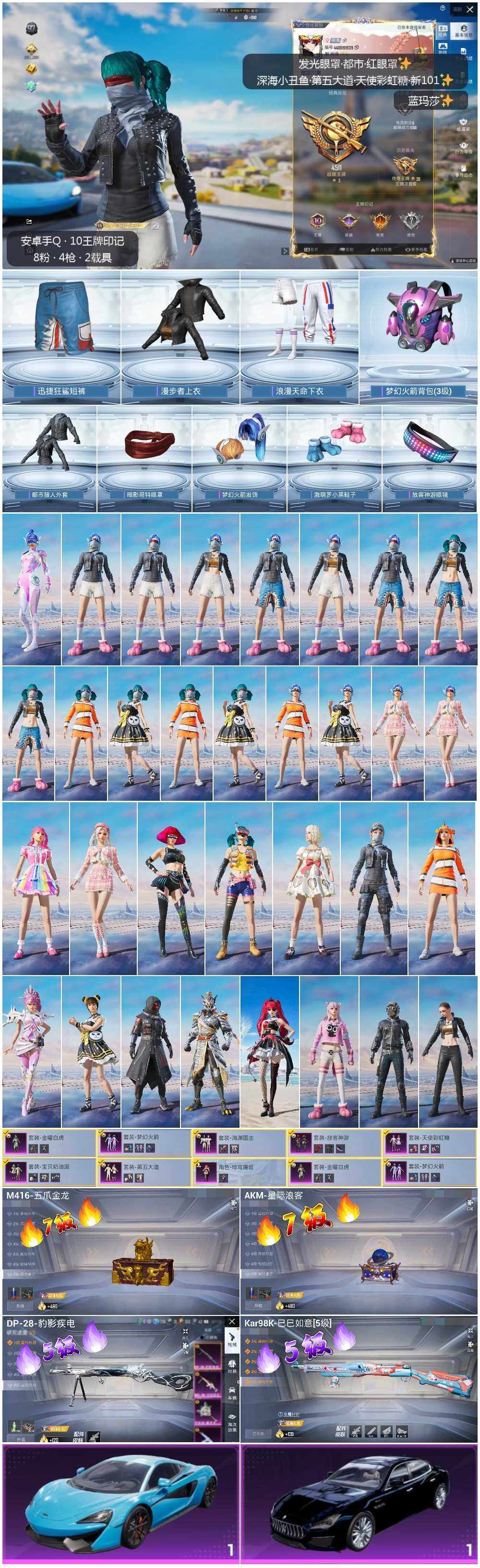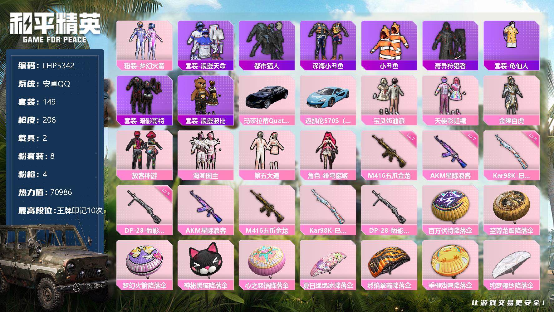 [12453266]素材身法号【特价急出/详情看图】:安卓 手Q-8粉装-4特效枪-2载具-7w热力值-10王牌印记-149套装-206枪皮【热门品类】:粉装-梦幻火箭,套装-浪漫天命,套装-都市猎人,套装-深海小丑鱼,套装-小丑鱼,套装-奇异狩猎者,套装-龟仙人,套装-暗影哥特,套装-浪漫波比【粉色载具】:玛莎拉蒂Quattroporte(夜幕蓝),迈凯伦570S(天际蓝)【粉色套装】:粉装-宝贝奶油派,粉装-天使彩虹糖,粉装-金曜白虎,粉装-梦幻火箭,粉装-放客神游,粉装-海渊国主,粉装-第五大道,角色-绯穹魔姬【粉色枪皮等级】:AKM-星际浪客(七级),M416-五爪金龙(七级),Kar98K-巳巳如意(五级),DP-28-豹影疾电(五级)