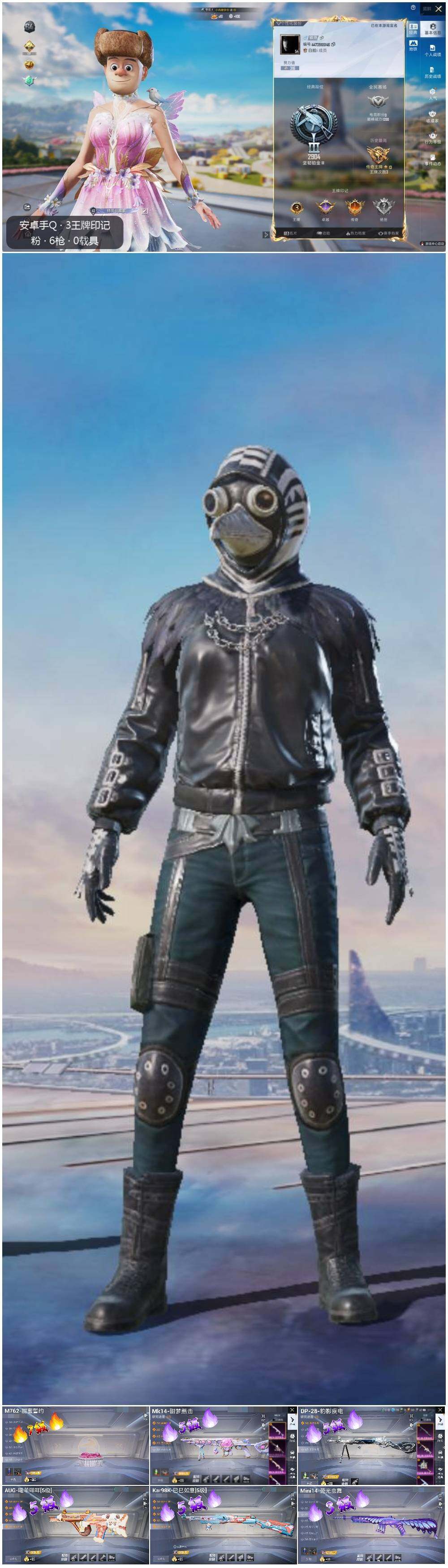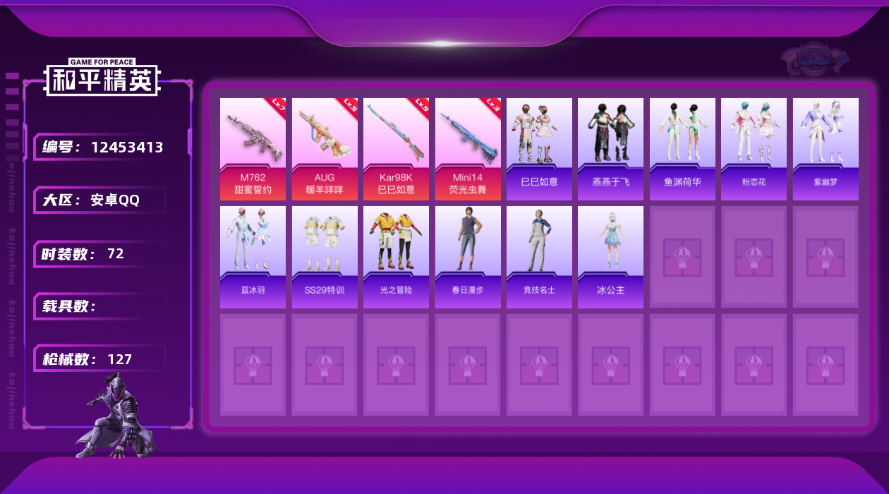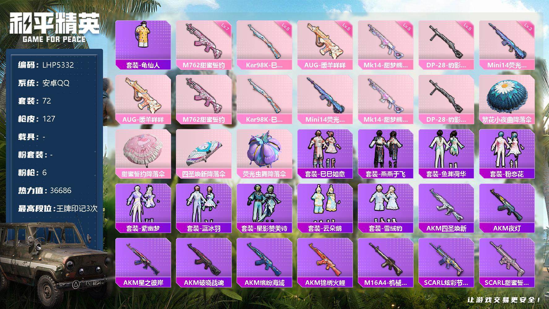 [12453413]【特价急出/详情看图】:安卓 手Q-6特效枪-3.6w热力值-3王牌印记-72套装-127枪皮【热门品类】:套装-龟仙人【粉色枪皮等级】:AUG-暖羊咩咩(五级),M762-甜蜜誓约(七级),Kar98K-巳巳如意(五级),Mini14-荧光虫舞(三级),Mk14-甜梦熊击(五级),DP-28-豹影疾电(五级)