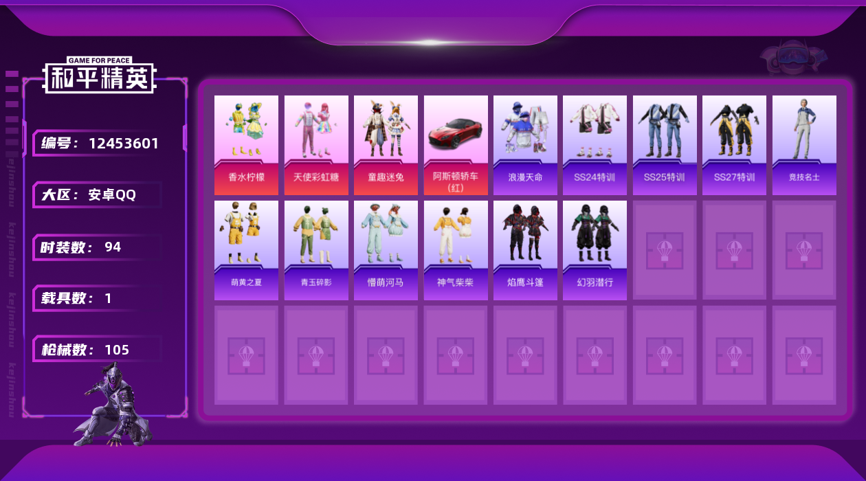 - PX_2085559-75 安卓QQ/绝世王者/226皮肤/124英雄/1典藏/0珍品无双/2无双/1珍品传说/16传说/63史诗/8稀有英雄 【1 珍品传说】兔狲·蓬尾 张飞, 【1 典藏皮肤】银白咏叹调 铠, 【2 无双皮肤】真我赫兹 瑶,群星魔术团 韩信, 【16 传说皮肤】启明星使 虞姬,时之祈愿 瑶,白虎志 百里玄策,鹤羽星尊 诸葛亮,炽阳神光 镜,末日机甲 孙尚香,山海·炽霜斩 李信,