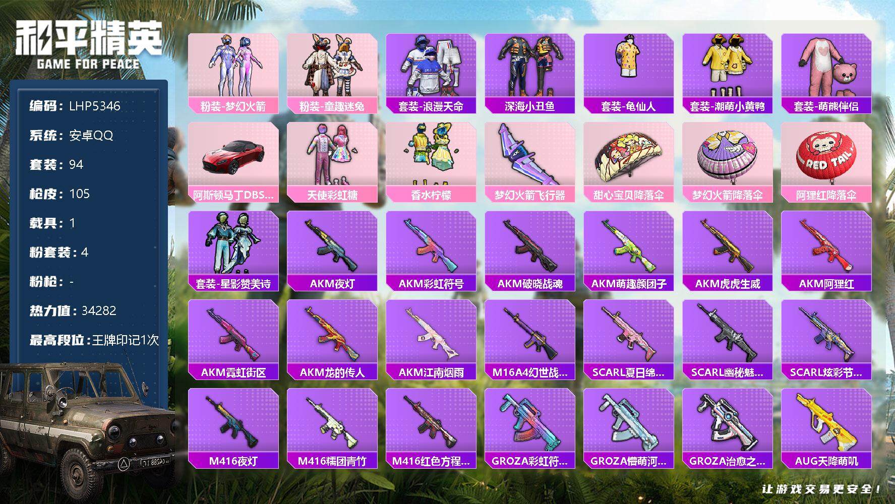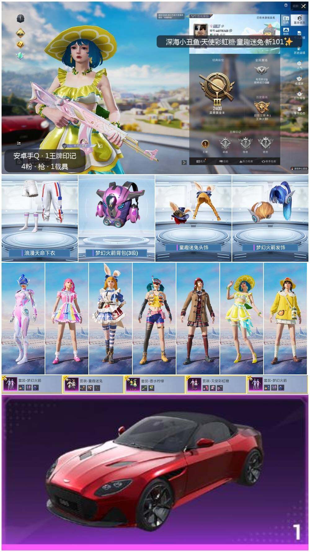 [12453601]【特价急出/详情看图】:安卓 手Q-4粉装-1载具-1粉色飞行器-3.4w热力值-1王牌印记-94套装-105枪皮【热门品类】:粉装-梦幻火箭,粉装-童趣迷兔,套装-浪漫天命,套装-深海小丑鱼,套装-龟仙人,套装-潮萌小黄鸭,套装-萌熊伴侣【粉色载具】:阿斯顿马丁DBS(红)【粉色套装】:粉装-天使彩虹糖,粉装-梦幻火箭,粉装-童趣迷兔,粉装-香水柠檬【粉色飞行器】:梦幻火箭飞行器