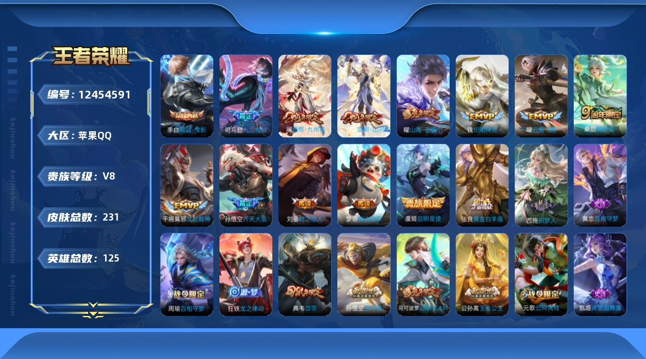 [12454591]【商品标题】:苹果Q-V8-最强王者段位-125英雄-231皮肤-1典藏-0珍品无双-0无双-0珍品传说-13传说-69史诗