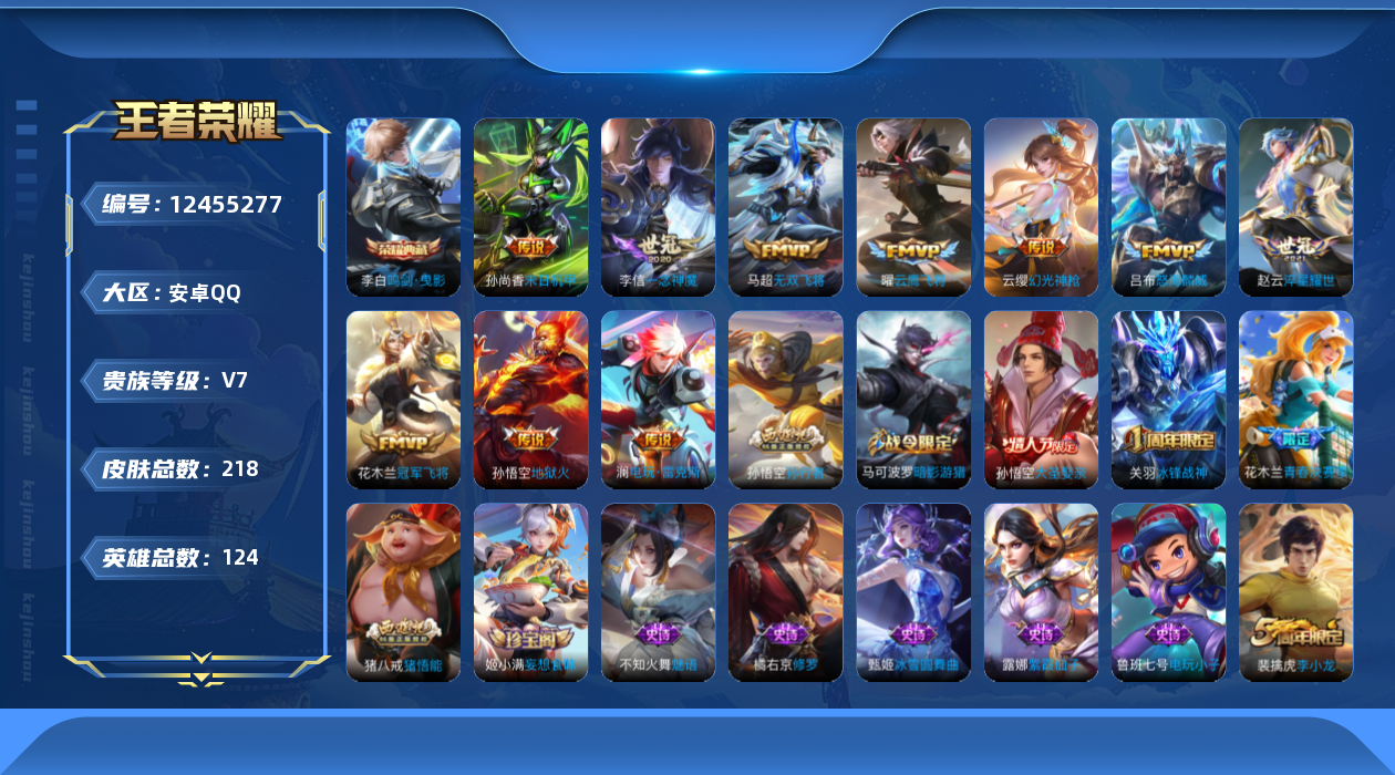 [12455277]【商品标题】:安卓Q-V5-永恒钻石V段位-124英雄-218皮肤-1典藏-0珍品无双-0无双-0珍品传说-10传说-61史诗