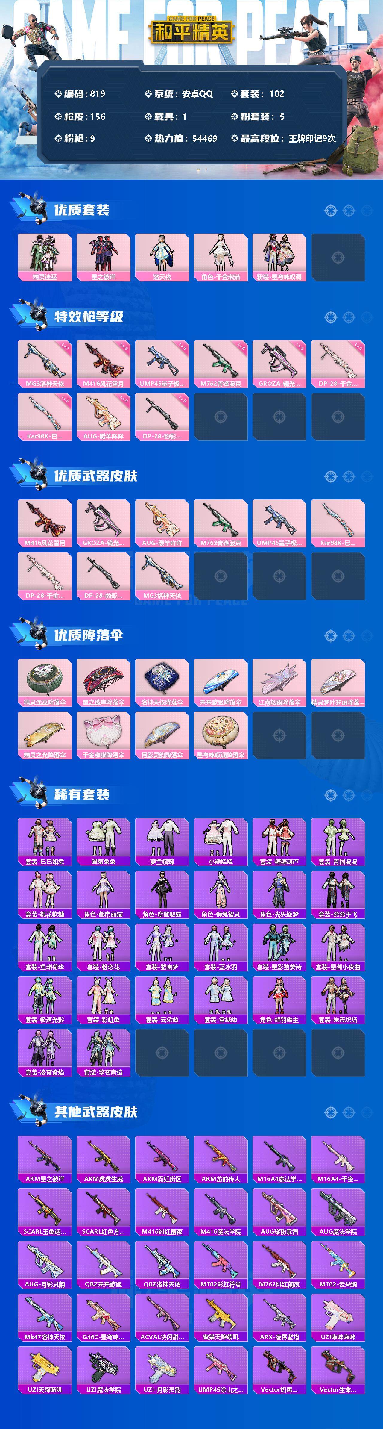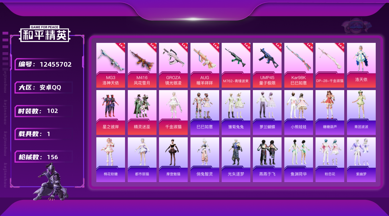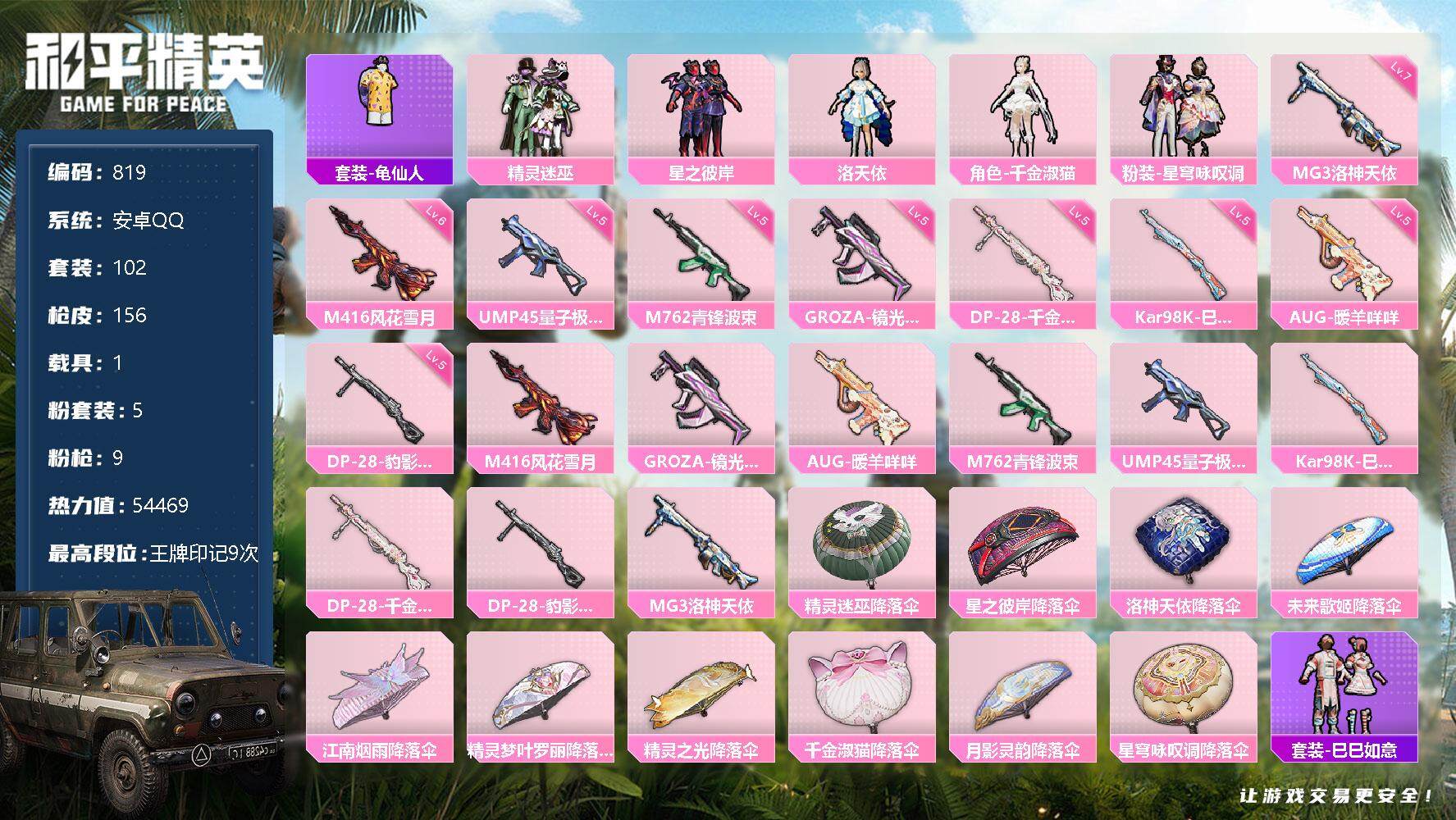 [12455702]【商品标题】:安卓 手Q-5粉装-9特效枪-1载具-0粉色飞行器-54469热力值-9王牌印记-102套装-156枪皮