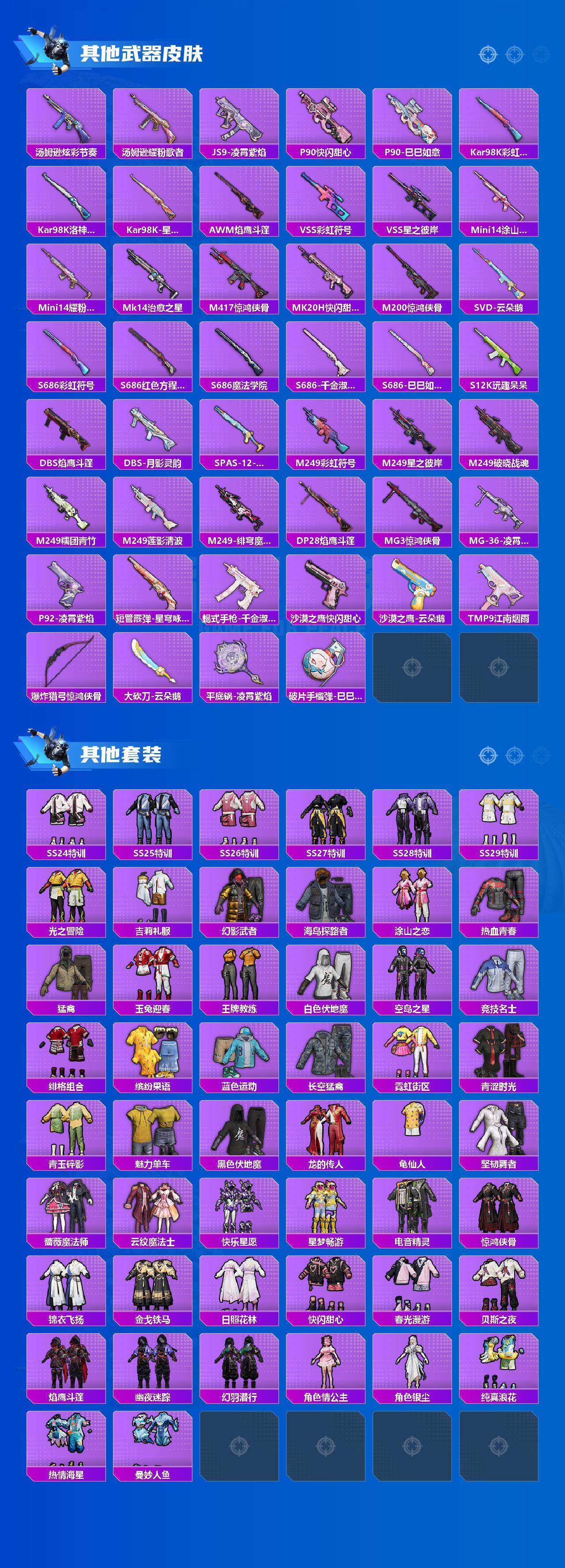 【稀有枪皮】:AKM-星之彼岸,AKM-虎虎生威,AKM-霓虹街区,AKM-龙的传人,M16A4-魔法学院,M16A4-千金淑猫,SCAR-L-玉兔迎春,SCAR-L-红色方程式,M416-绯红前夜,M416-魔法学院,AUG-耀粉歌者,AUG-魔法学院,AUG-月影灵韵,QBZ-未来歌姬,QBZ-洛神天依,M762-彩虹符号,M762-绯红前夜,M762-云朵鹅,Mk47-洛神天依,G36C-星穹咏叹调,AC-VAL-快闪甜心,蜜獾-天降萌叽,ARX-凌霄紫焰,UZI-啾咪啾咪,UZI-天降萌叽,UZI-魔法学院,UZI-月影灵韵,UMP45-涂山之恋,Vector-焰鹰斗篷,Vector-生命誓言,汤姆逊-炫彩节奏,汤姆逊-耀粉歌者,JS9-凌霄