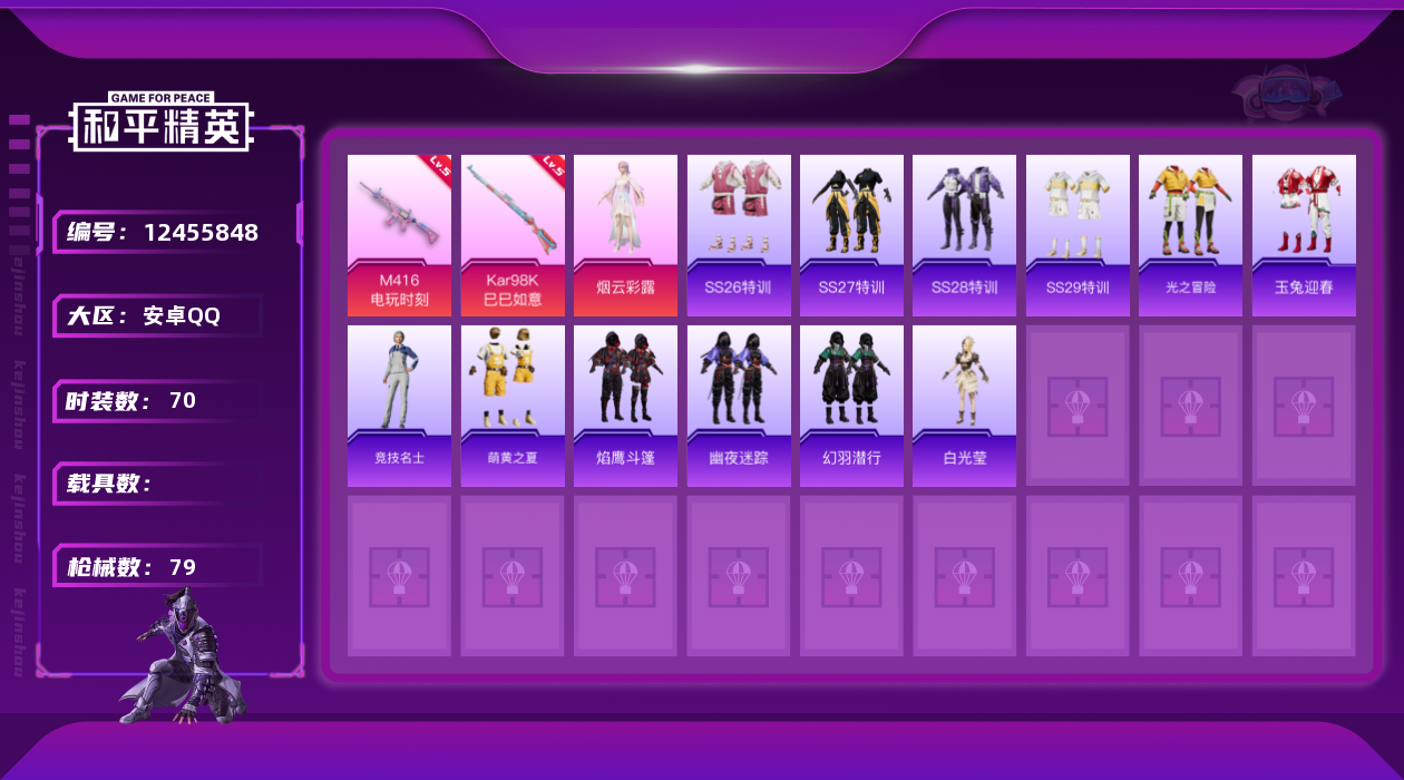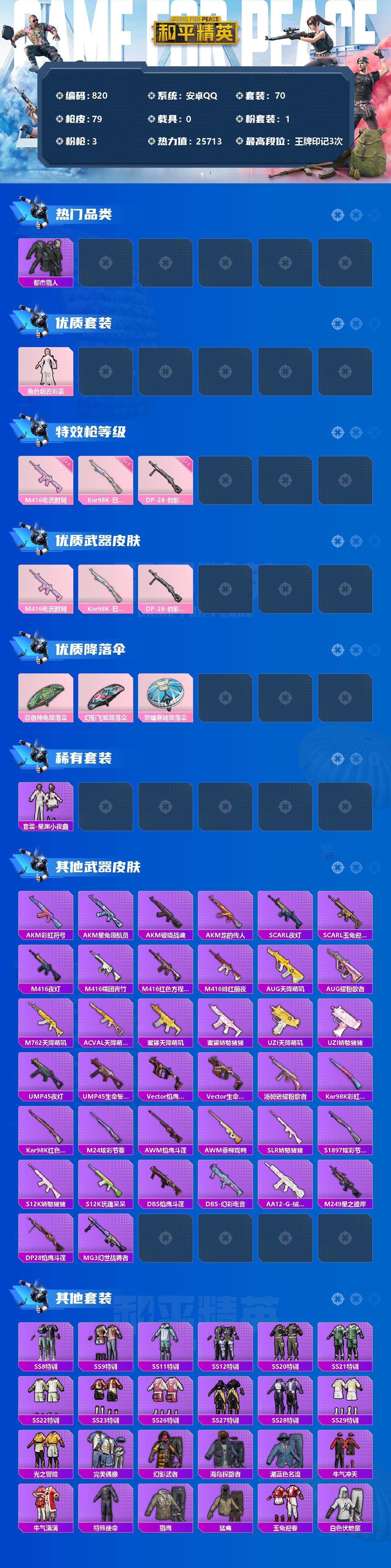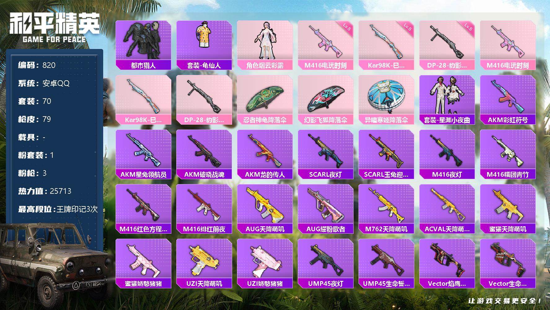 [12455848]【商品标题】:安卓 手Q-1粉装-3特效枪-0载具-0粉色飞行器-25713热力值-3王牌印记-70套装-79枪皮