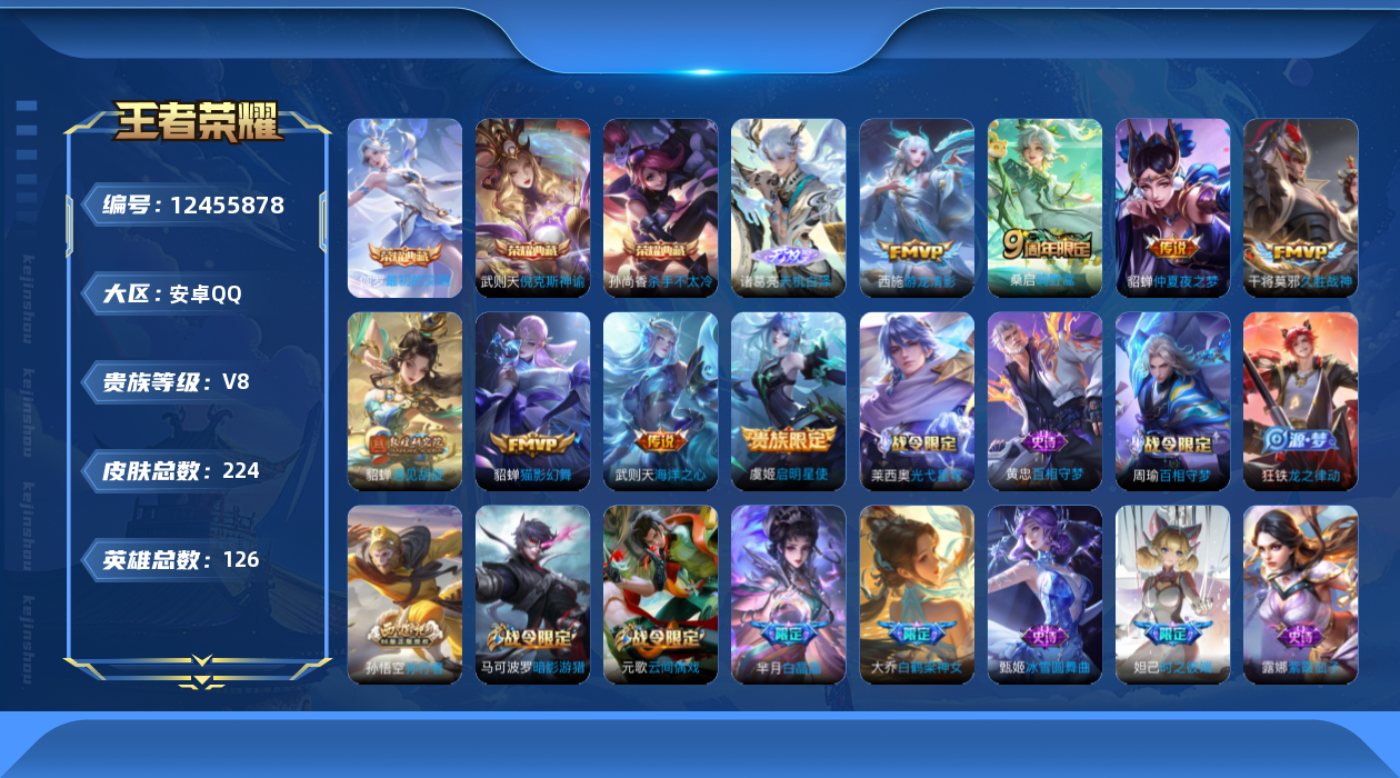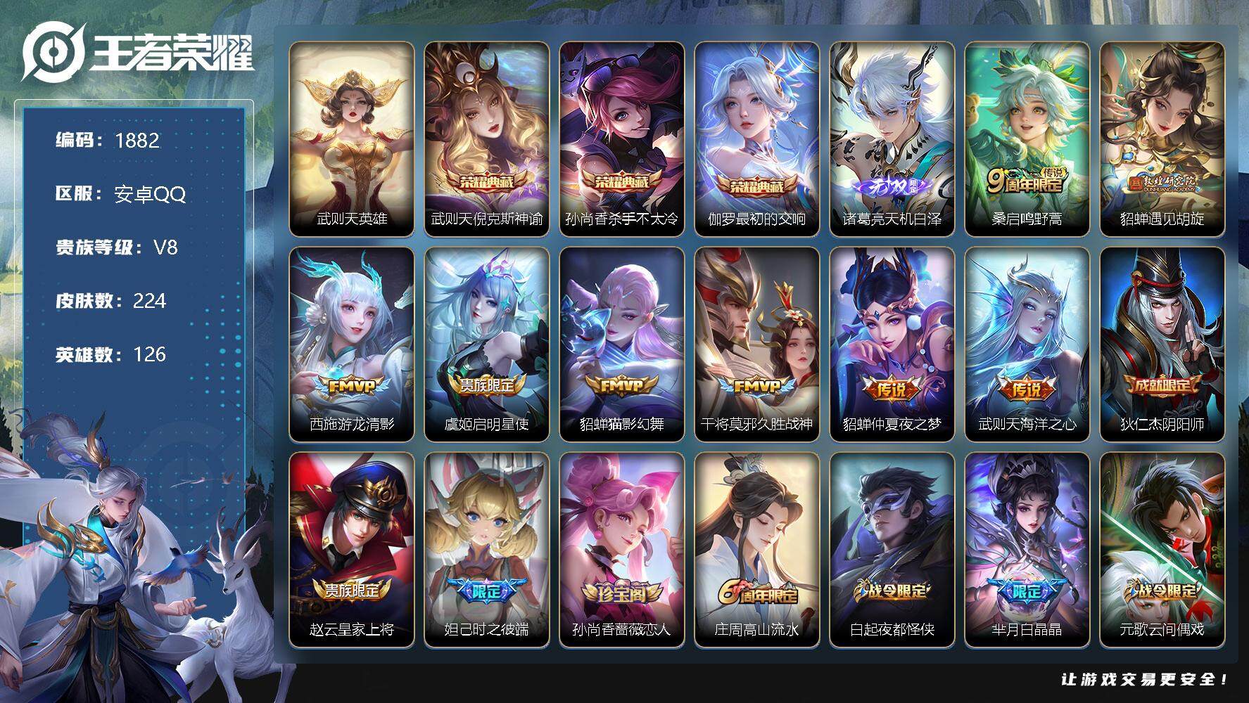 [12455878]【商品标题】:安卓Q-V8-最强王者段位-126英雄-224皮肤-3典藏-0珍品无双-1无双-0珍品传说-8传说-62史诗