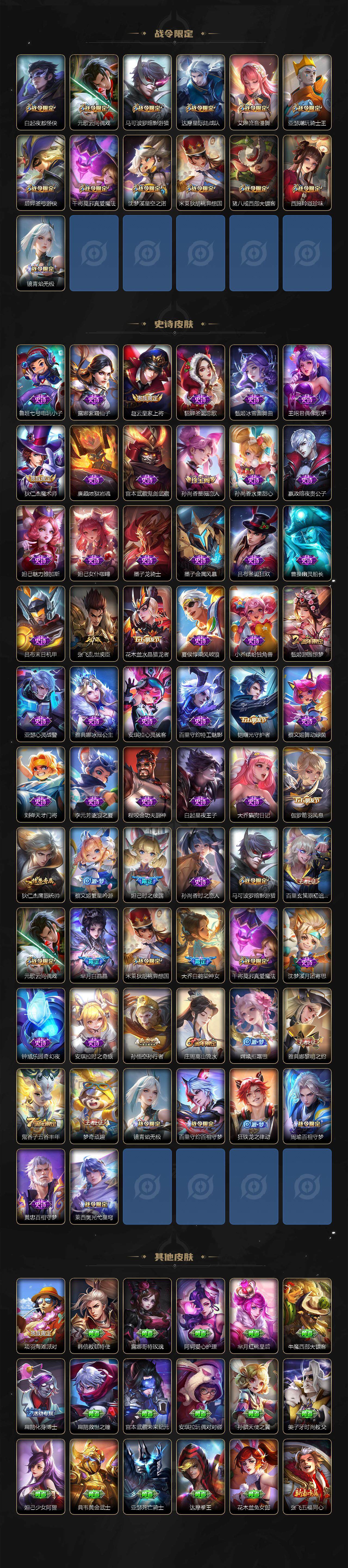 【限定皮肤】:狄仁杰阴阳师,赵云皇家上将,妲己时之彼端,孙尚香蔷薇恋人,庄周高山流水,白起夜都怪侠,芈月白晶晶,元歌云间偶戏,夏侯惇朔风刀,甄姬游园惊梦,马可波罗暗影游猎,狄仁杰魔术师,狄仁杰万华元夜,达摩星际陆战队,达摩沙漠行僧,项羽海滩派对,老夫子醍醐杖,貂蝉遇见胡旋,程咬金演武夺筹,兰陵王金庭之子,亚瑟潮玩骑士王,孙悟空孙行者,后羿圣弓游侠,李元芳云中旅人,虞姬启明星使,钟馗驱傩正仪,干将莫邪真爱魔法,雅典娜黎明之约,蔡文姬繁星吟游,太乙真人华丽摇滚,鬼谷子原初探秘者,鬼谷子五谷丰年,大乔白鹤梁神女,苏烈千军破阵,百里玄策原初追逐者,弈星混沌棋,梦奇顽趣,沈梦溪星空之诺,沈梦溪大漠名商,明世隐疑决卦,狂铁御狮,米莱狄御霄,米莱狄胡桃异想国,猪八戒西部大镖客,嫦娥拒霜思,西施玲珑珍味,鲁班大师探海日志,桑启海盐诗旅,艾琳流音漫舞,鬼谷子天穹祈灯,镜青焰无极