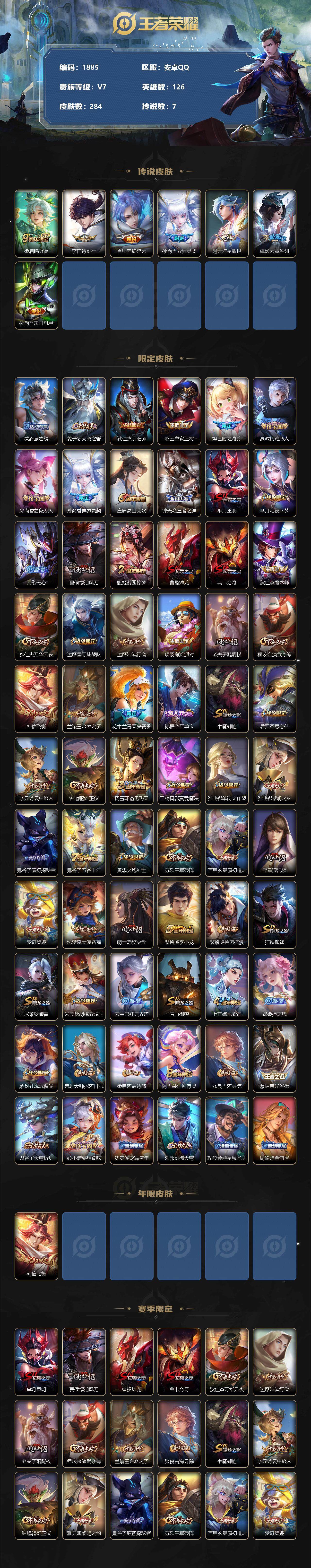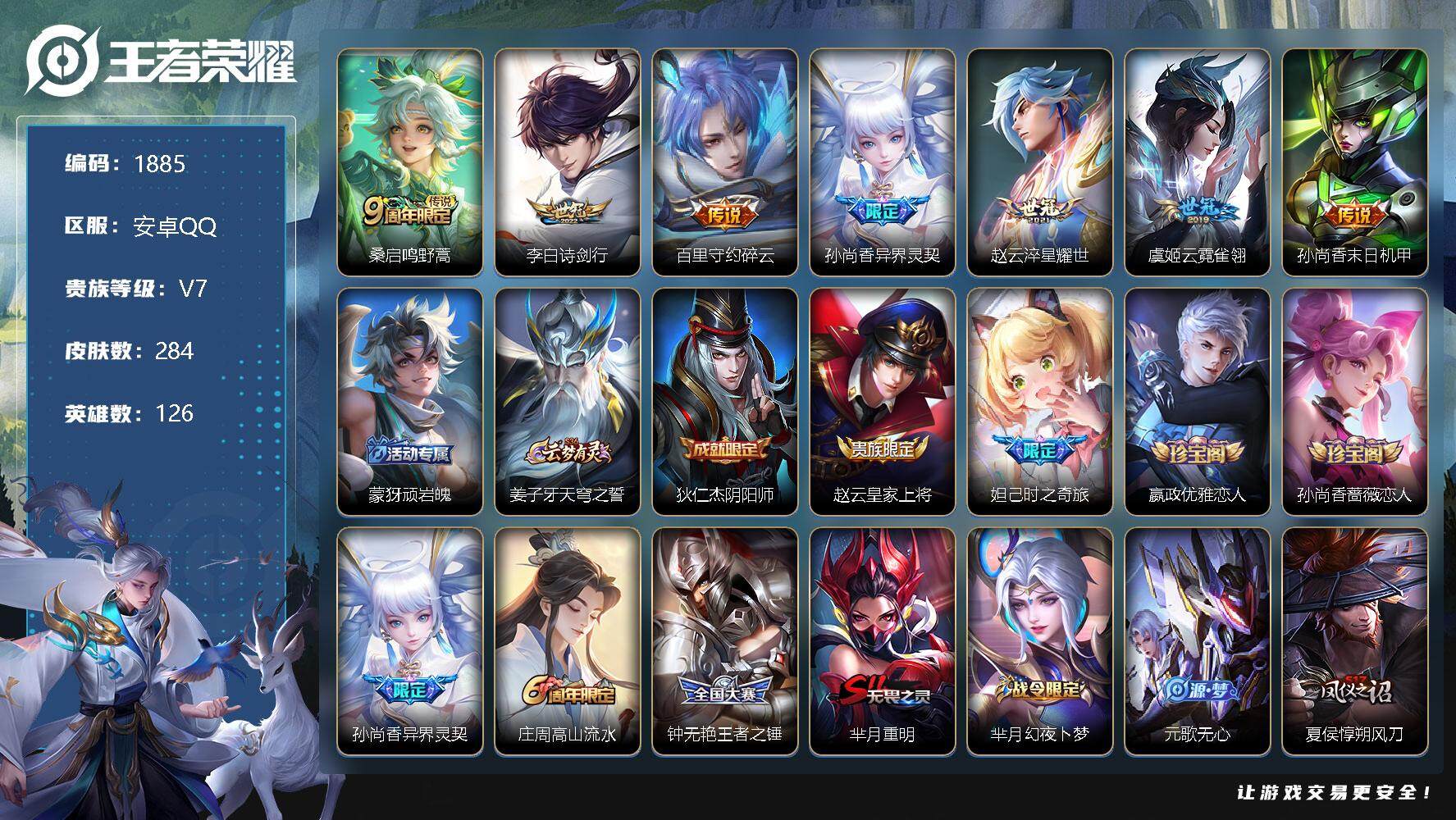 [12456107]【商品标题】:安卓Q-V7-至尊星耀III段位-126英雄-284皮肤-0典藏-0珍品无双-0无双-0珍品传说-7传说-70史诗