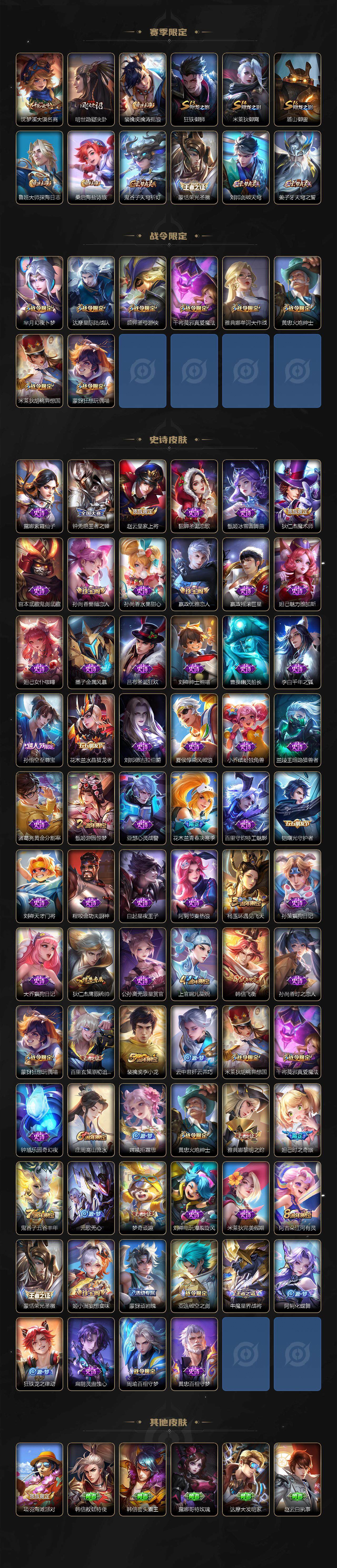 【赛季限定】:芈月重明,夏侯惇朔风刀,曹操烛龙,典韦穷奇,狄仁杰万华元夜,达摩沙漠行僧,老夫子醍醐杖,程咬金演武夺筹,兰陵王金庭之子,张良古海寻踪,牛魔御旌,李元芳云中旅人,钟馗驱傩正仪,雅典娜黎明之约,鬼谷子原初探秘者,苏烈千军破阵,百里玄策原初追逐者,弈星混沌棋,梦奇顽趣,沈梦溪大漠名商,明世隐疑决卦,裴擒虎擒涛扼浪,狂铁御狮,米莱狄御霄,盾山御銮,鲁班大师探海日志,桑启海盐诗旅,鬼谷子天穹祈灯,蒙恬荣光圣徽,刘邦剑破天穹,姜子牙天穹之誓