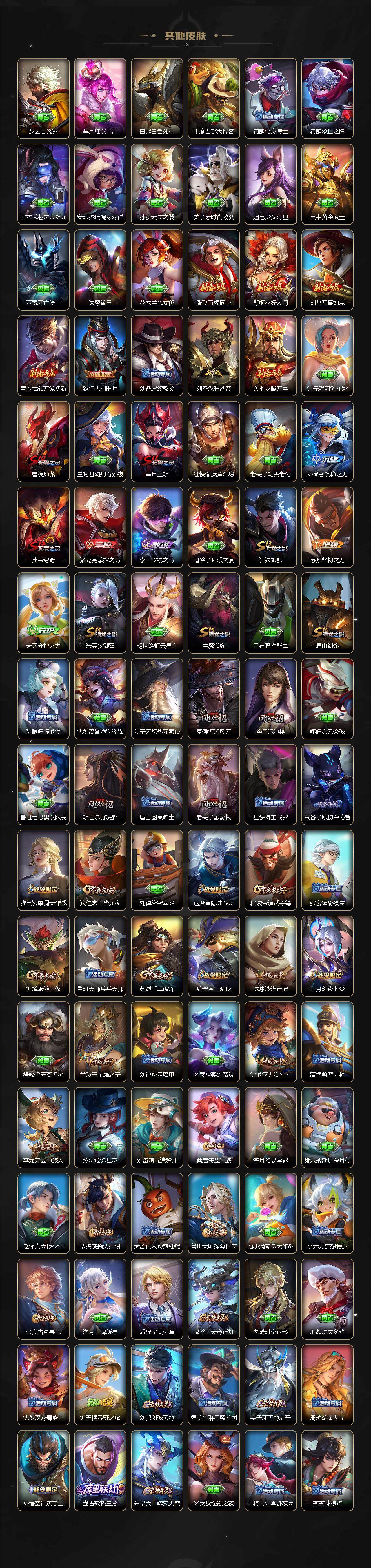公孙离无限星赏官,大乔猫狗日记,孙策猫狗日记,阿轲节奏热浪,露娜紫霞仙子,诸葛亮黄金分割率,孙尚香时之恋人,嬴政摇滚巨星,刘禅绅士熊喵,刘禅天才门将,白起星夜王子,程咬金功夫厨神,刘邦德古拉伯爵,兰陵王暗隐猎兽者,曹操幽灵船长,宫本武藏鬼剑武藏,亚瑟心灵战警,钟馗乐园奇幻夜,小乔缤纷独角兽,夏侯惇乘风破浪,花木兰水晶猎龙者,铠曙光守护者,墨子金属风暴,百里玄策原初追逐者,吕布圣诞狂欢,貂蝉圣诞恋歌,百里守约特工魅影,嫦娥拒霜思,雅典娜黎明之约,李白千年之狐,刘禅电玩·爆裂旋风