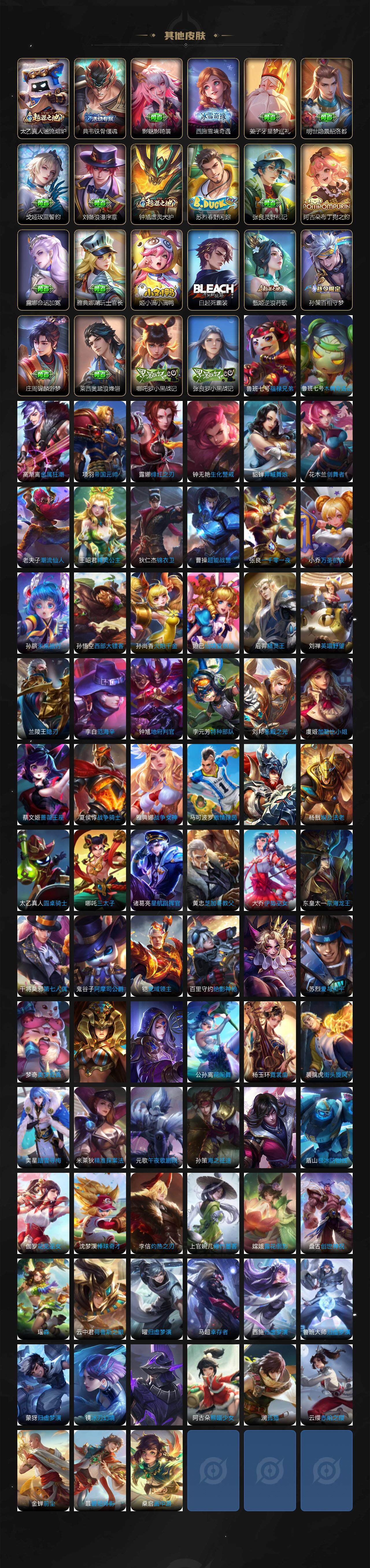 【限定皮肤】:蒙犽顽岩魄,姜子牙天穹之誓,狄仁杰阴阳师,赵云皇家上将,妲己时之奇旅,嬴政优雅恋人,孙尚香蔷薇恋人,孙尚香异界灵契,庄周高山流水,钟无艳王者之锤,芈月重明,芈月幻夜卜梦,元歌无心,夏侯惇朔风刀,甄姬游园惊梦,曹操烛龙,典韦穷奇,狄仁杰魔术师,狄仁杰万华元夜,达摩星际陆战队,达摩沙漠行僧,项羽海滩派对,老夫子醍醐杖,程咬金演武夺筹,韩信飞衡,兰陵王金庭之子,花木兰青春决赛季,孙悟空至尊宝,牛魔御旌,后羿圣弓游侠,李元芳云中旅人,钟馗驱傩正仪,杨玉环遇见飞天,干将莫邪真爱魔法,雅典娜单词大作战,雅典娜黎明之约,鬼谷子原初探秘者,鬼谷子五谷丰年,黄忠火炮绅士,苏烈千军破阵,百里玄策原初追逐者,弈星混沌棋,梦奇顽趣,沈梦溪大漠名商,明世隐疑决卦,裴擒虎李小龙,裴擒虎擒涛扼浪,狂铁御狮,米莱狄御霄,米莱狄胡桃异想国,云中君纤云弄巧,盾山御銮,上官婉儿梁祝,嫦娥拒霜思,蒙犽狂想玩偶喵,鲁班大师探海日志,桑启海盐诗旅,阿古朵江河有灵,张良古海寻踪,蒙恬荣光圣徽,鬼谷子天穹祈灯,姬小满妄想食味,沈梦溪龙舞盛年,刘邦剑破天穹,程咬金群星魔术团,周瑜熔金海岸
